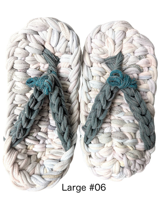 These slippers are made from recycled scraps of fabric discarded by a knitted items factory. As they are made from recycled materials, the size and colour of individual slippers in a pair may have some minute discrepancies. These slippers are elastic. We would recommend these slippers for when you want to relax, or make yourself comfortable.