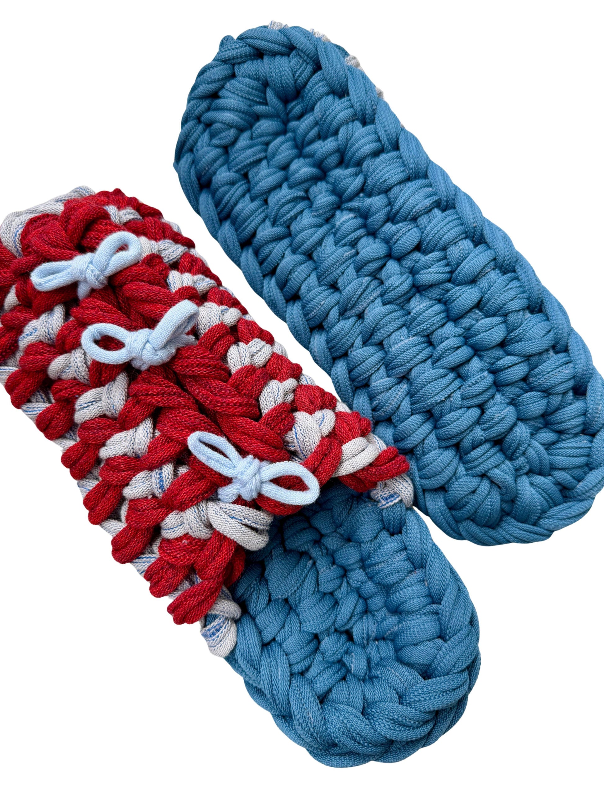 Deze pantoffels zijn gemaakt van gerecyclede restjes stof die zijn weggegooid door een breifabriek. Omdat ze van gerecyclede materialen zijn gemaakt, kunnen de maat en kleur van de individuele pantoffels per paar kleine verschillen vertonen. Deze pantoffels zijn elastisch. We raden deze pantoffels aan voor wanneer u wilt ontspannen of het uzelf gemakkelijk wilt maken.