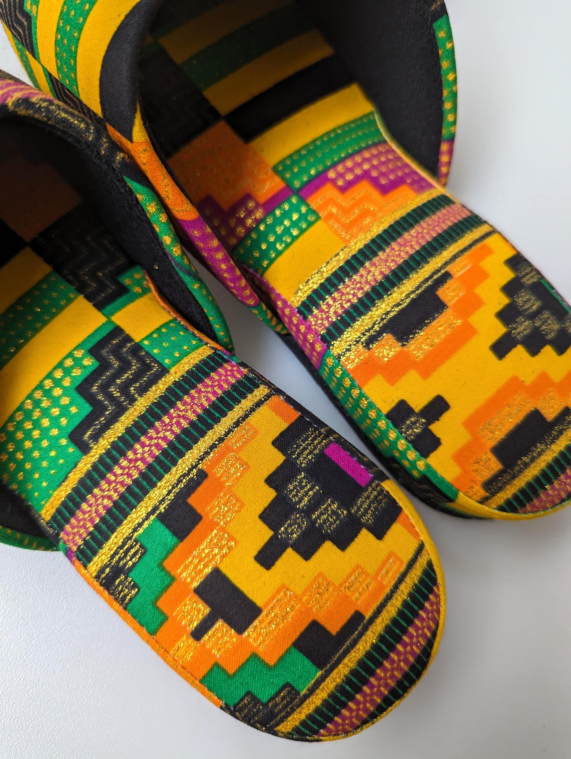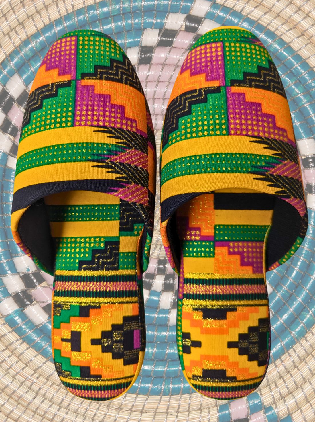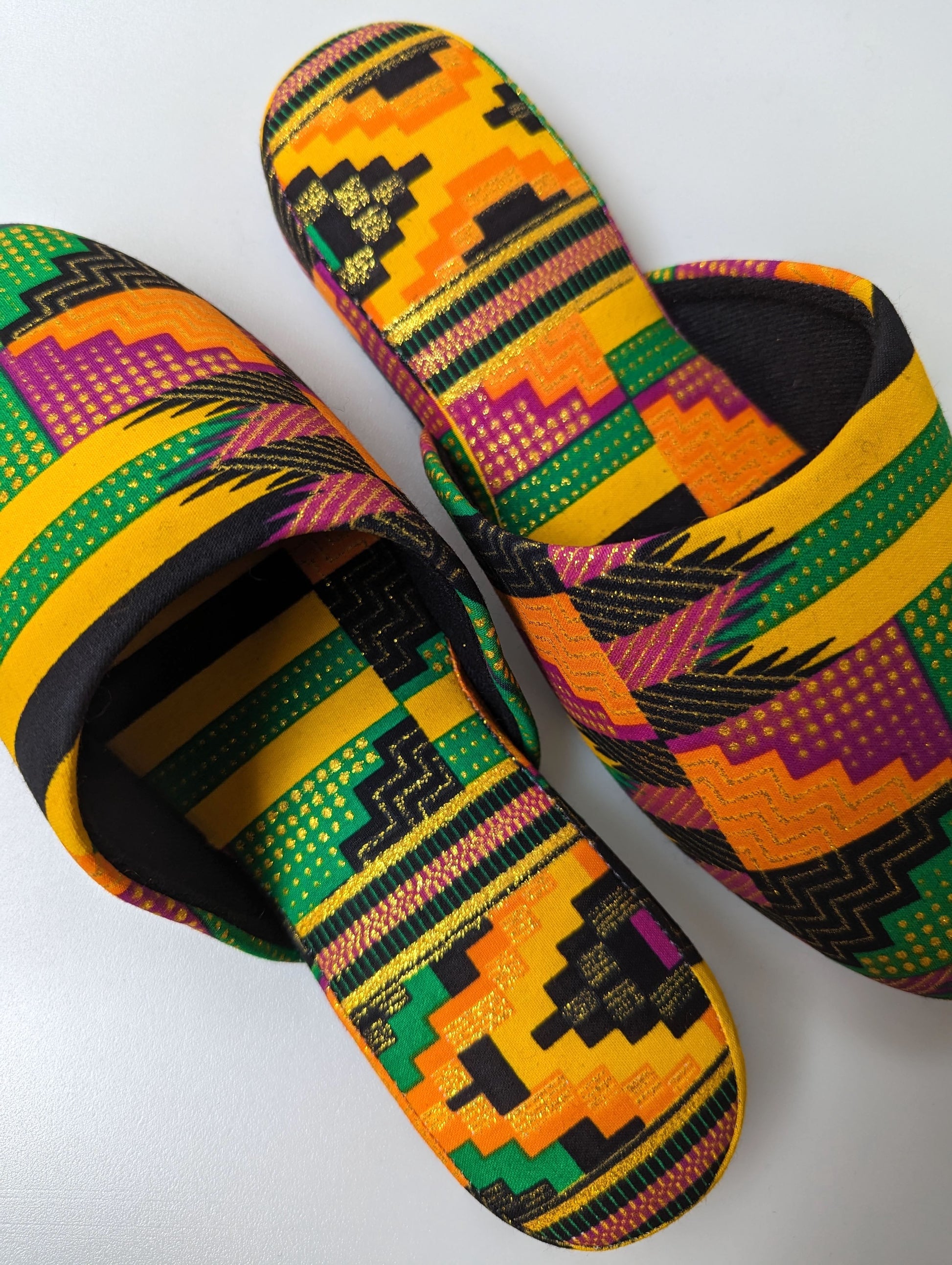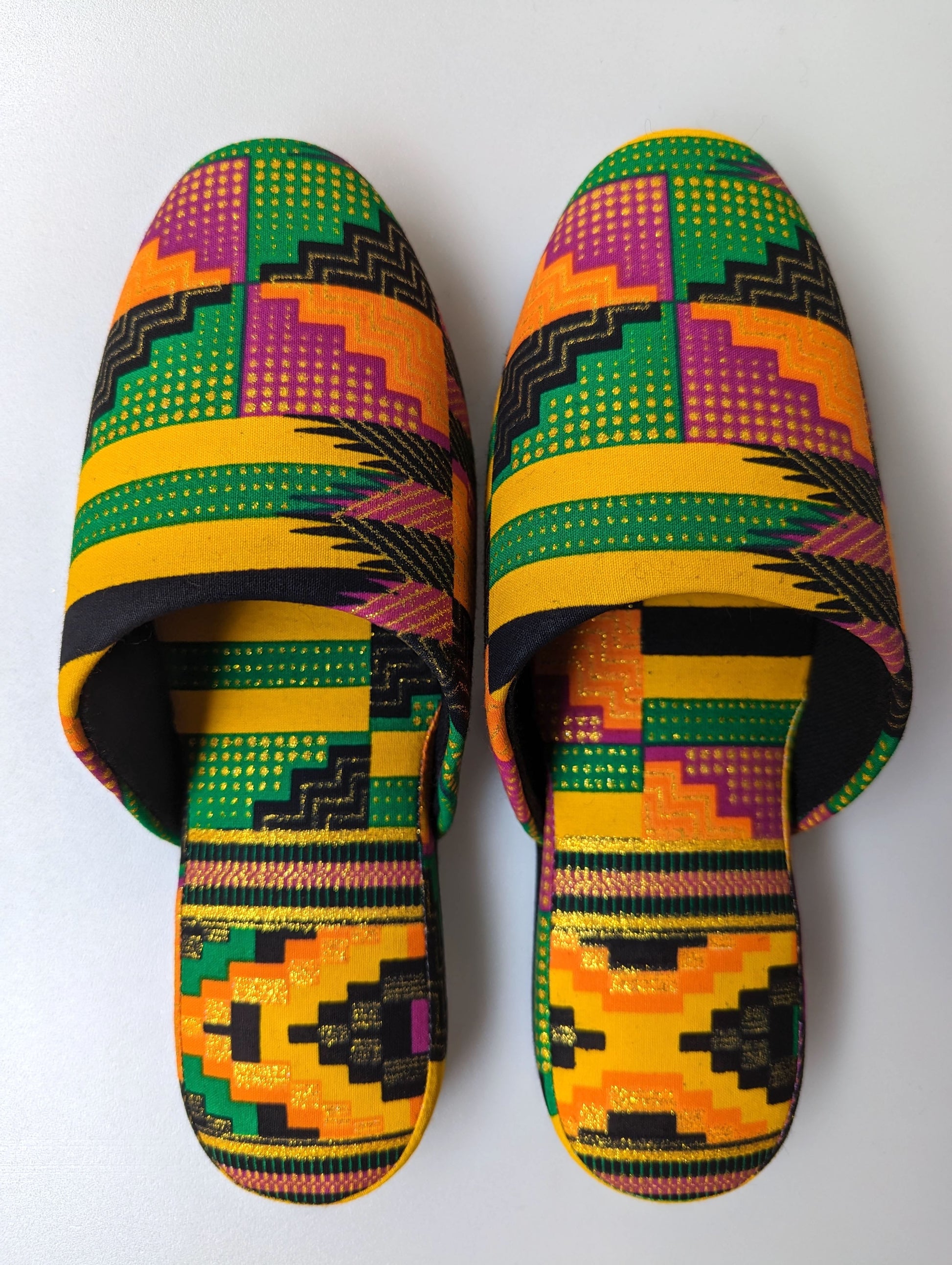 * These slippers are crafted from gold lamé fabric. The lamé portion may start to peel off with prolonged wear, so please exercise caution to prevent any color fading. This could become more noticeable when worn with white socks. We appreciate your understanding.