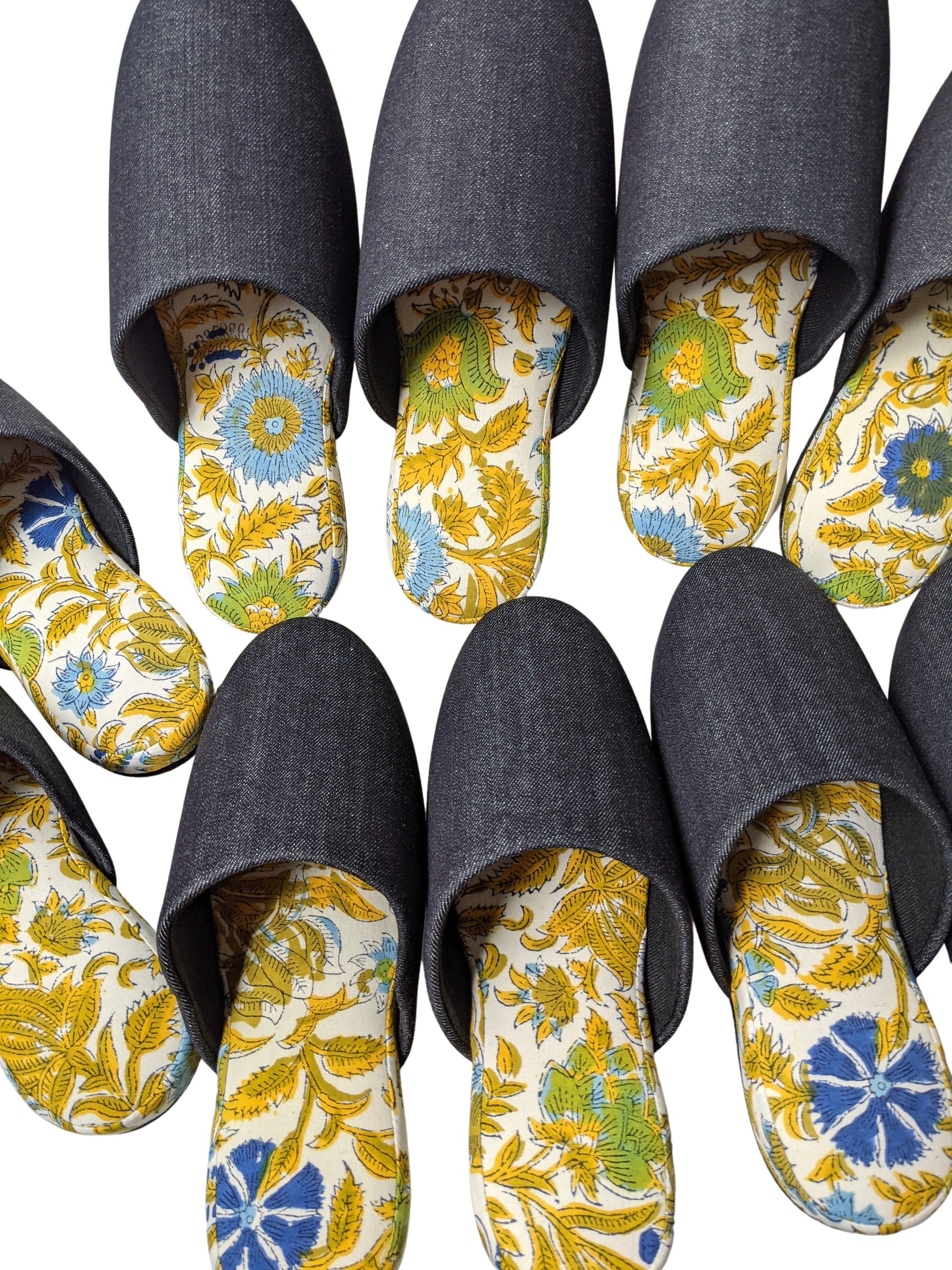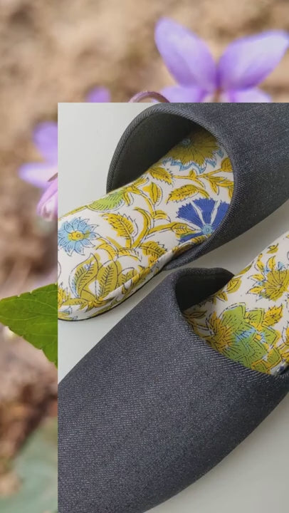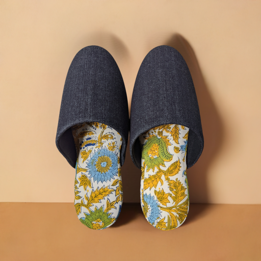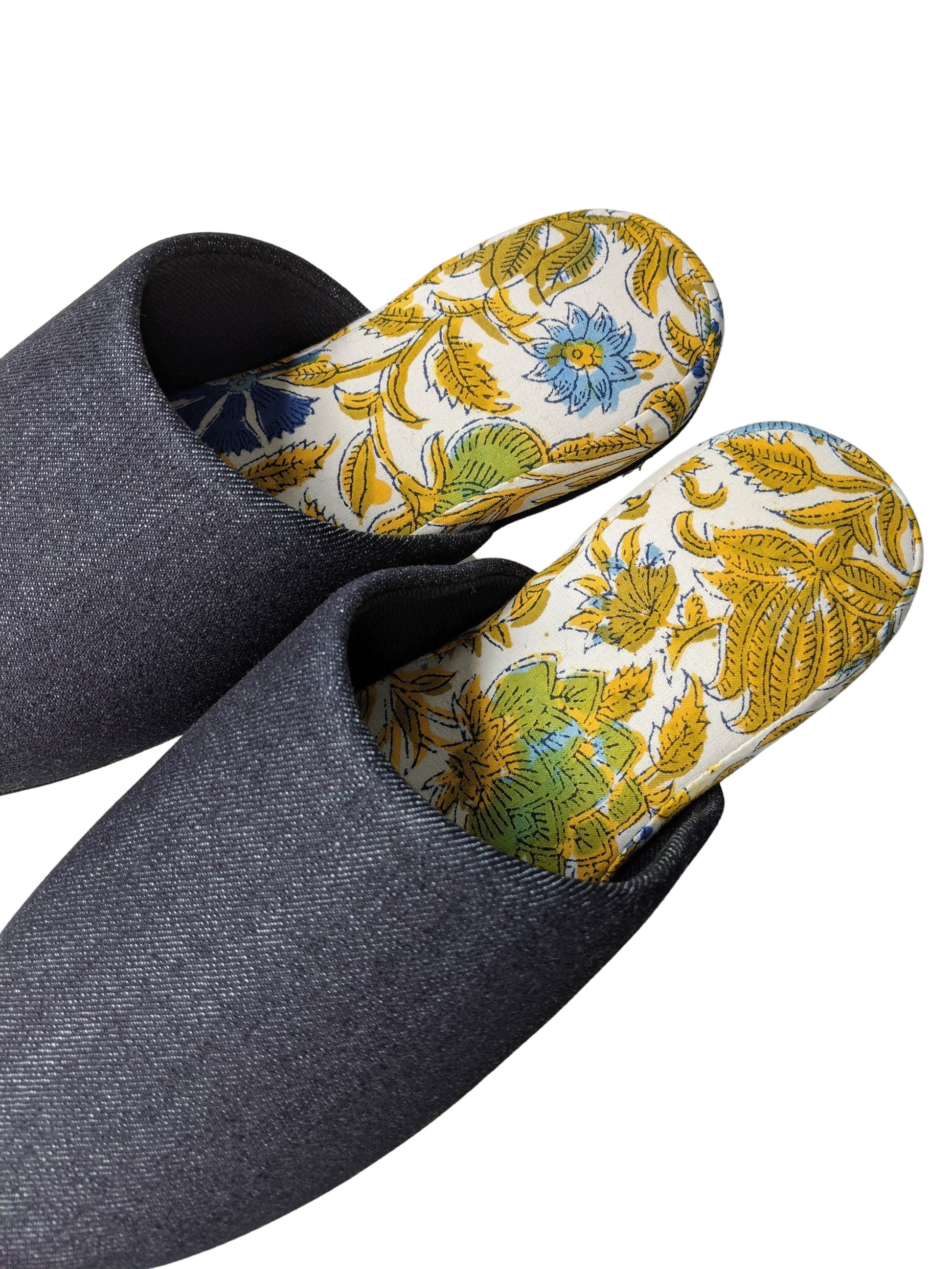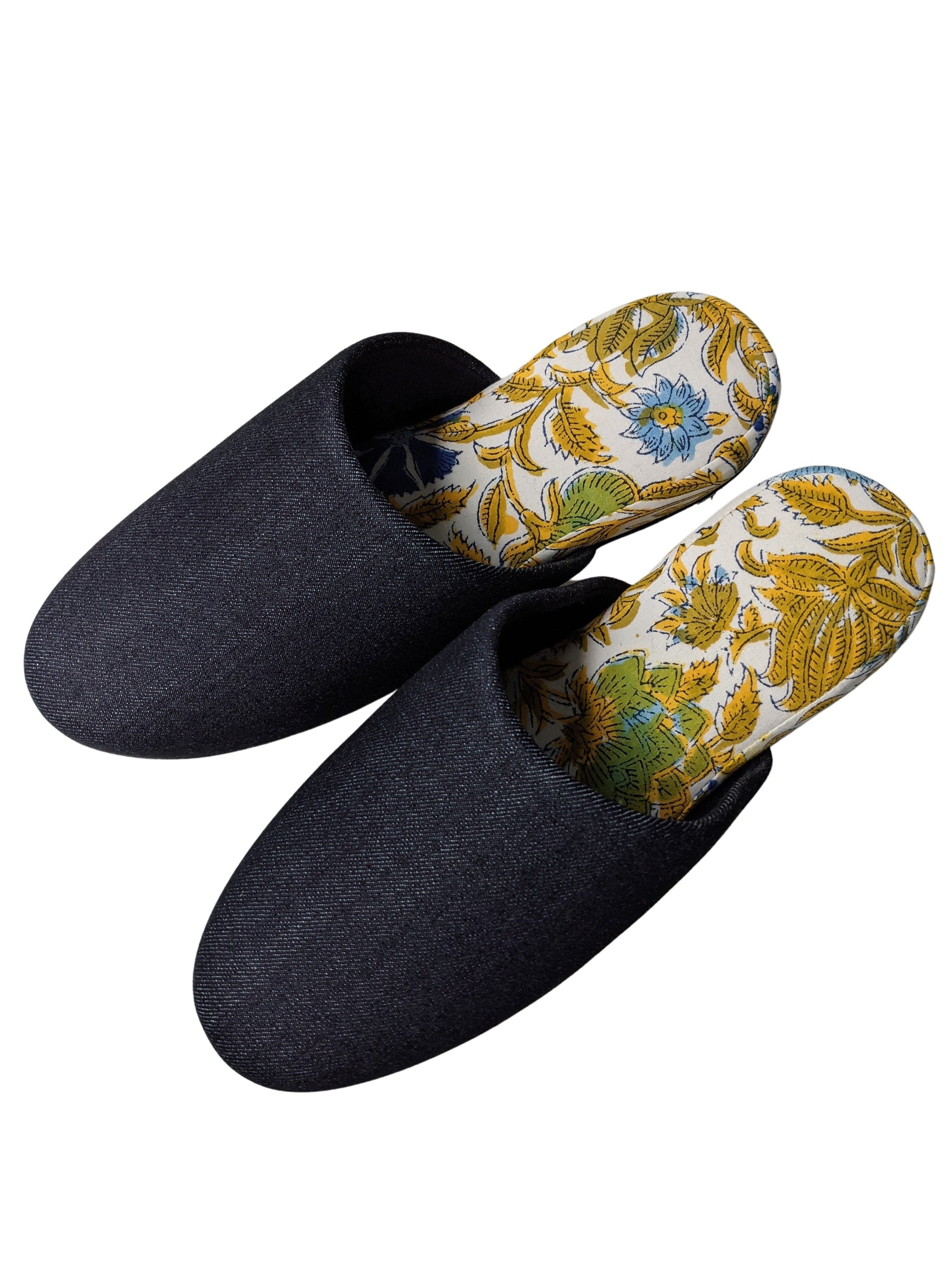 [SALE] Large| Denim and Flowers Mix Slippers [Black wool felt sole]