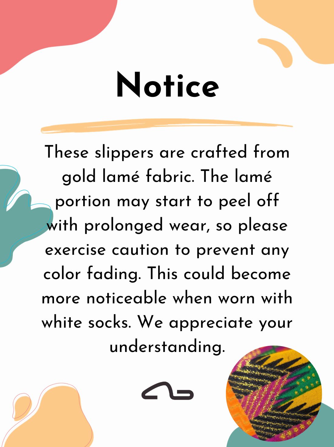 * These slippers are crafted from gold lamé fabric. The lamé portion may start to peel off with prolonged wear, so please exercise caution to prevent any color fading. This could become more noticeable when worn with white socks. We appreciate your understanding.