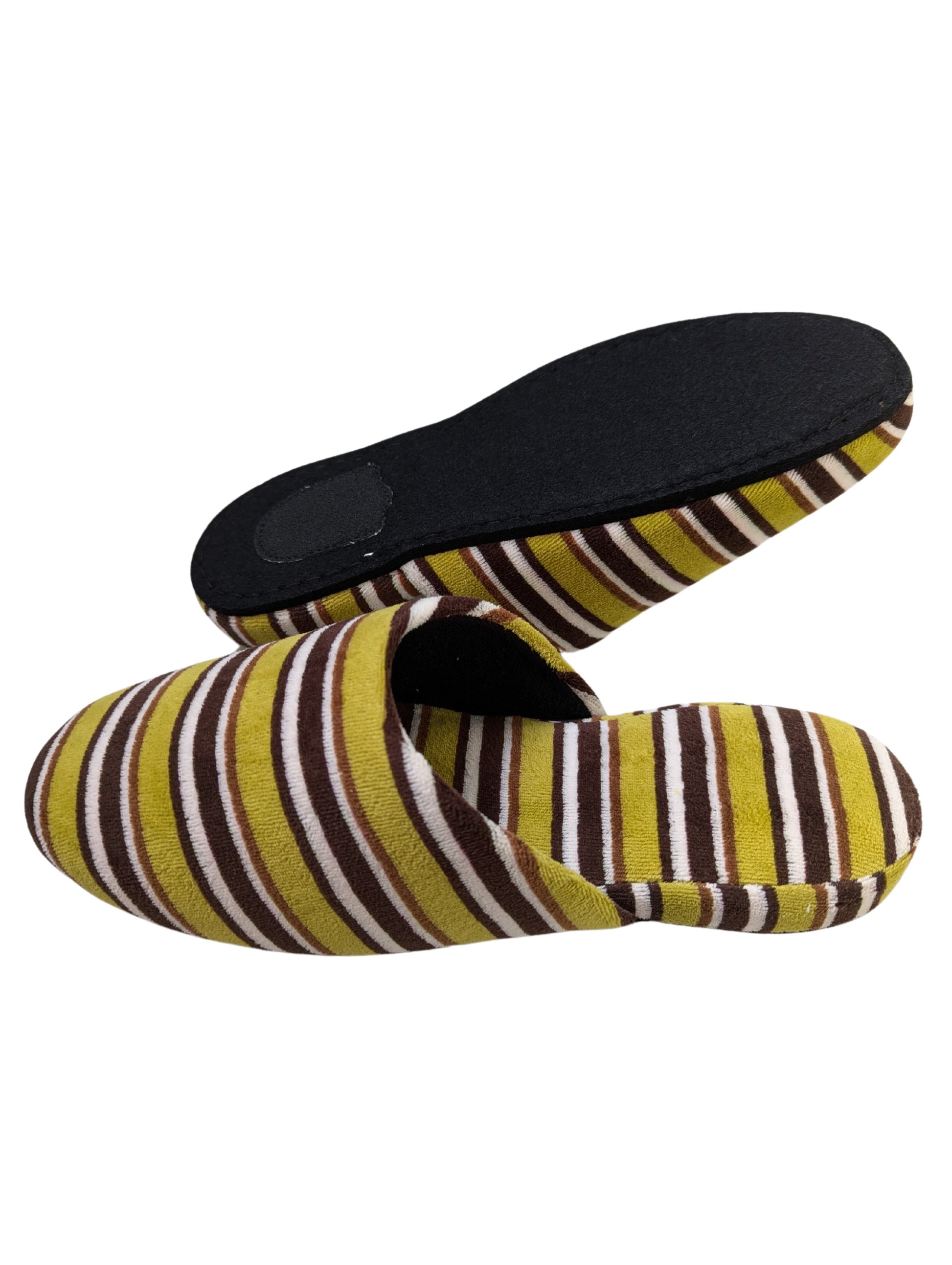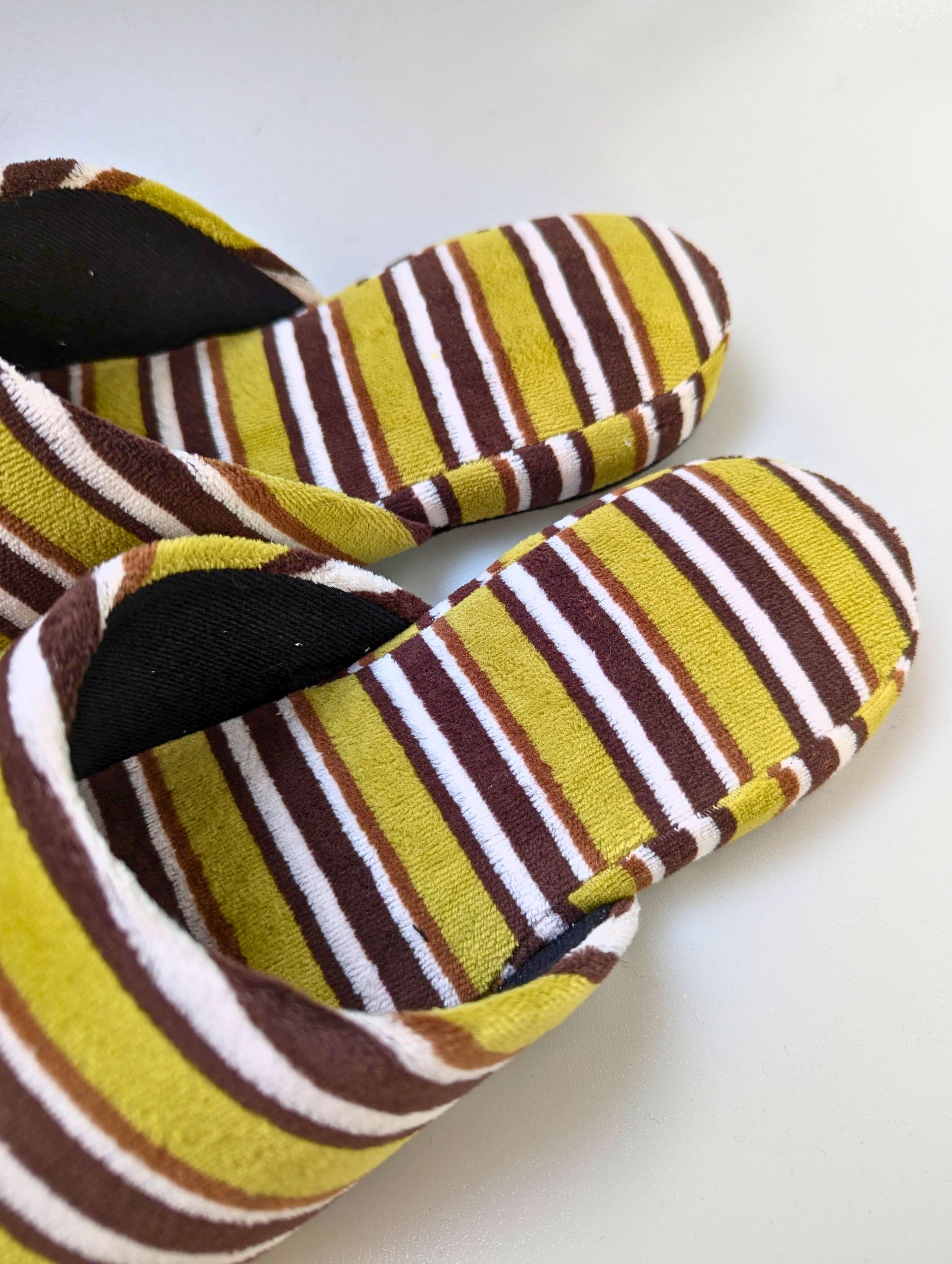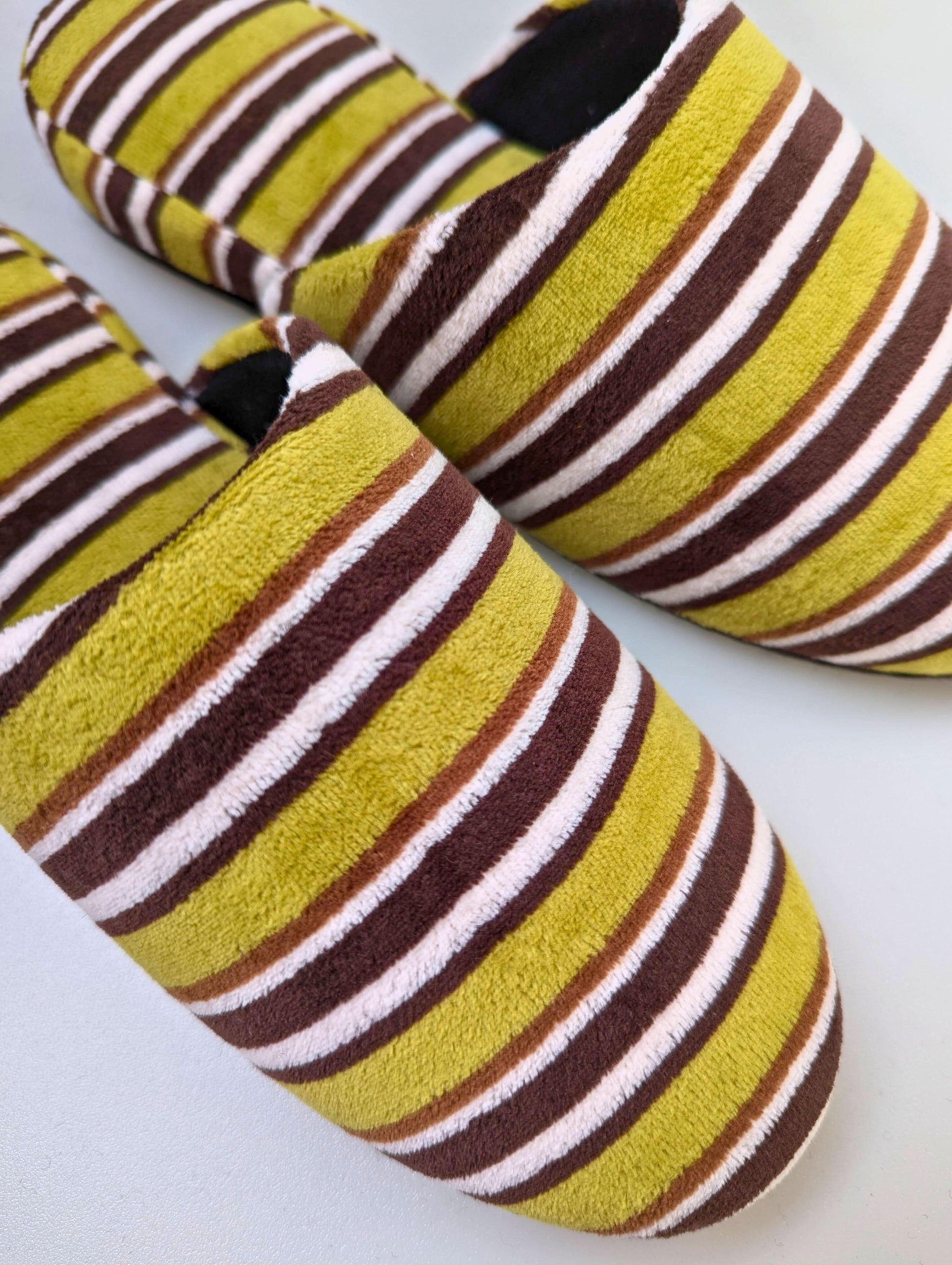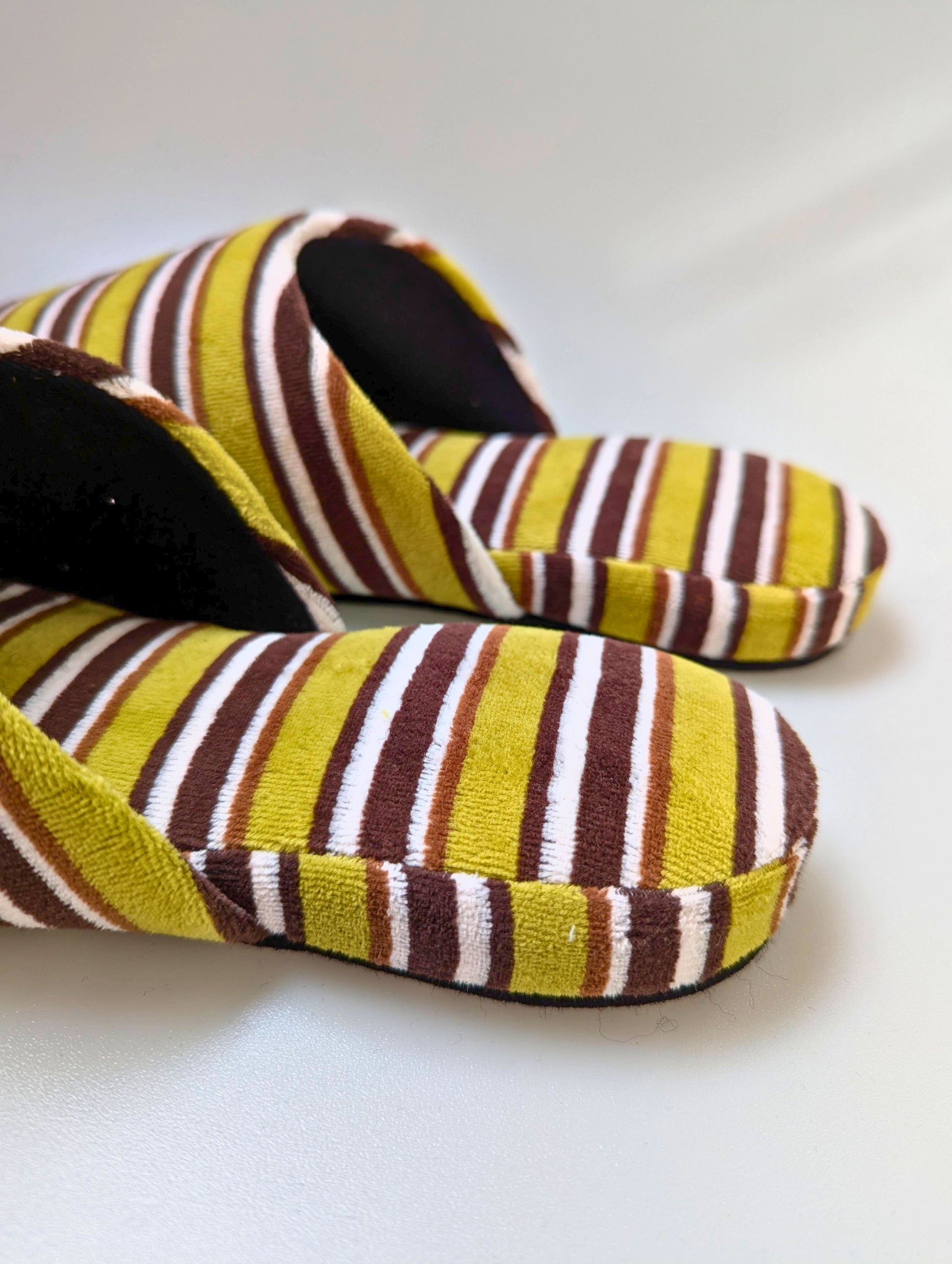 These limited edition striped slippers are handcrafted by skilled artisans using upcycled vintage fabric. Only a small number are available. This slipper is made from upcycled fabric. The fabric used for these slippers is made by deconstructing and cleaning old clothing, giving it a new life as slipper material. While they have a unique texture and vintage look, there may be slight color variations. Please understand the nature of upcycled and recycled products.
