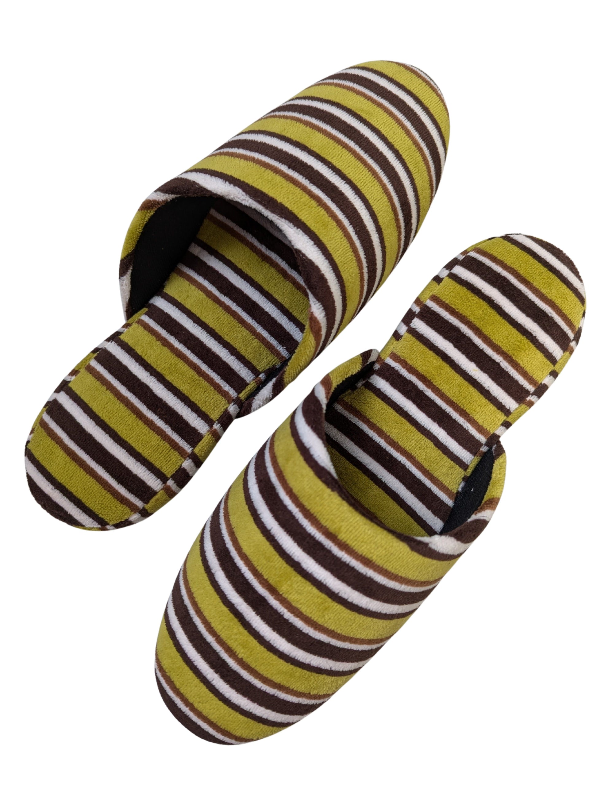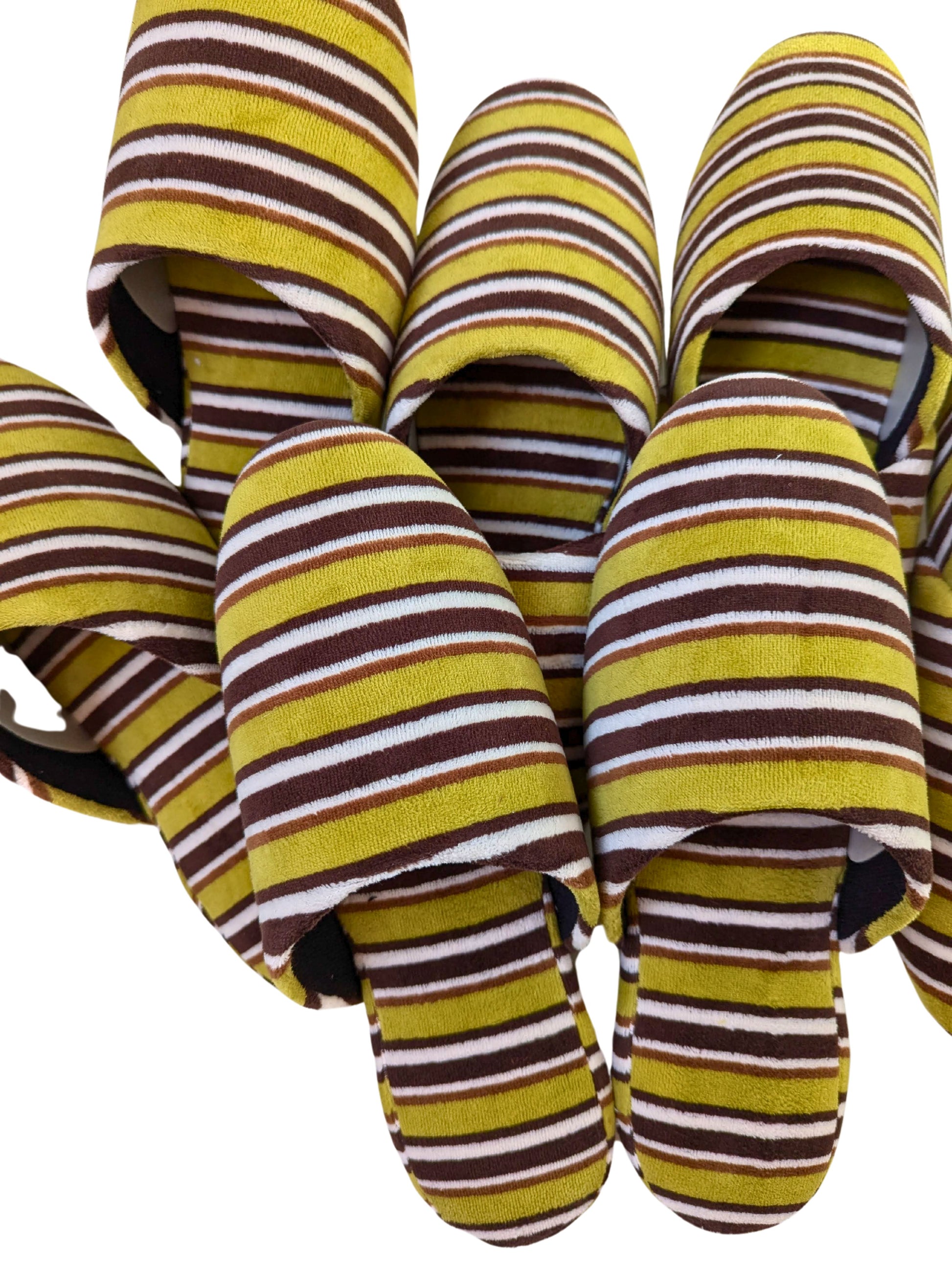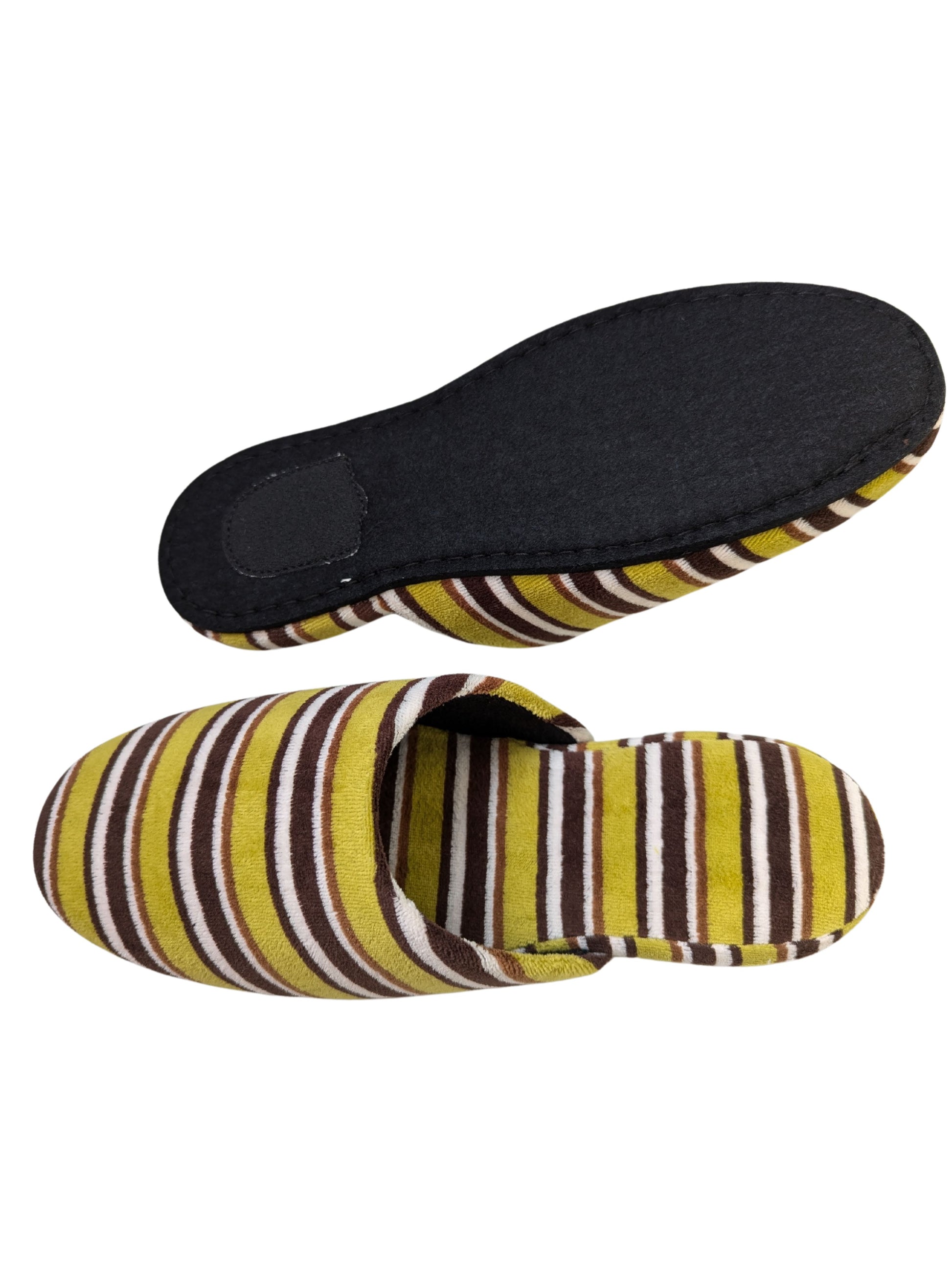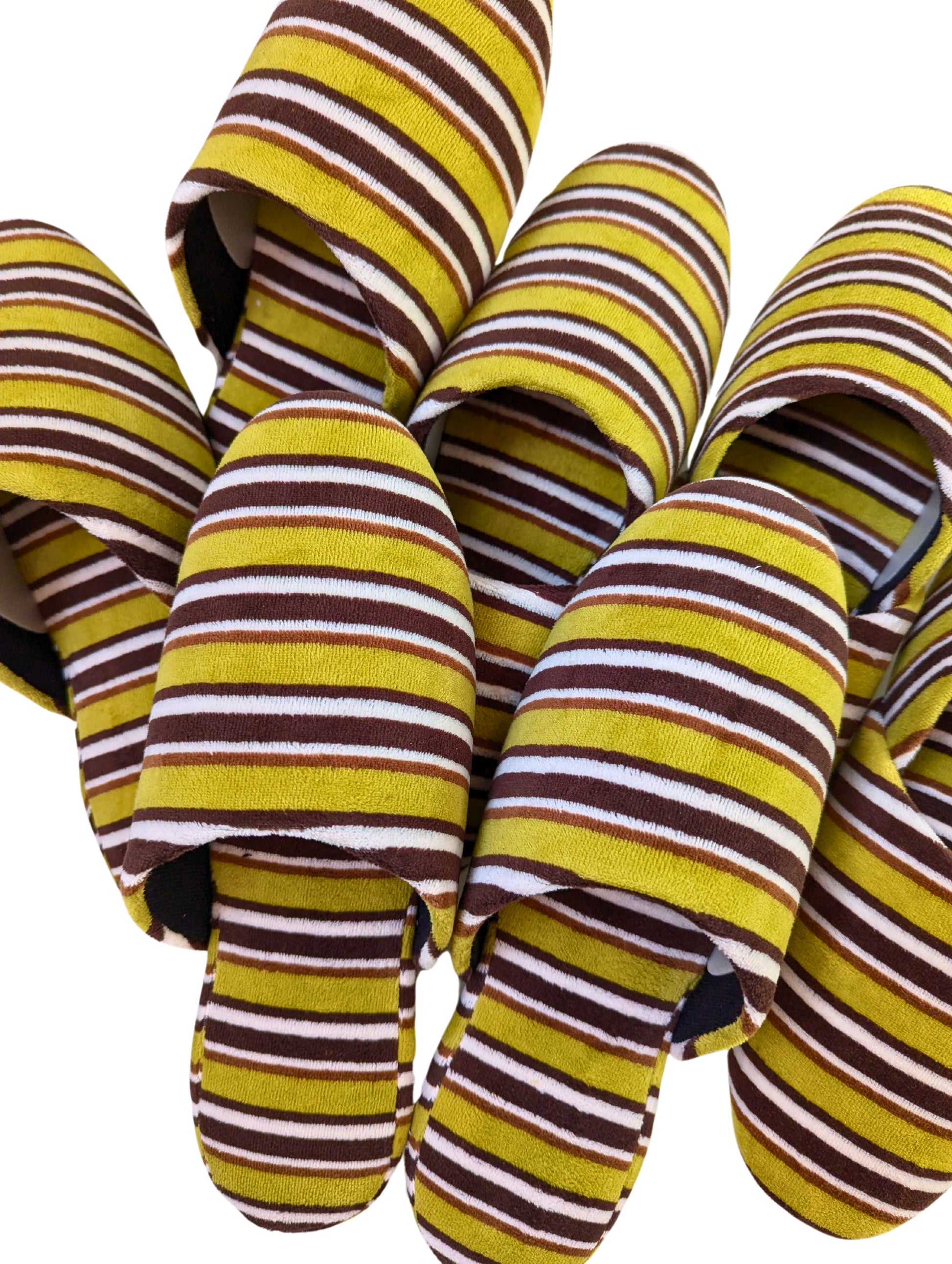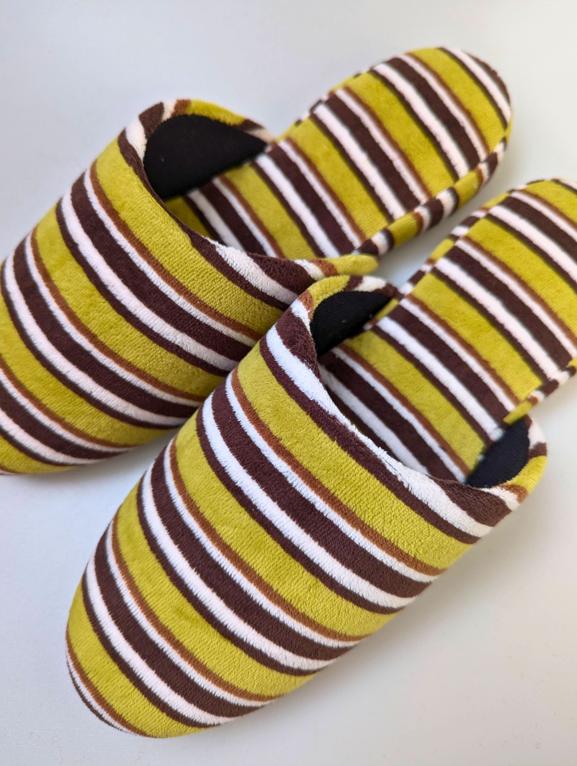 These limited edition striped slippers are handcrafted by skilled artisans using upcycled vintage fabric. Only a small number are available. This slipper is made from upcycled fabric. The fabric used for these slippers is made by deconstructing and cleaning old clothing, giving it a new life as slipper material. While they have a unique texture and vintage look, there may be slight color variations. Please understand the nature of upcycled and recycled products.