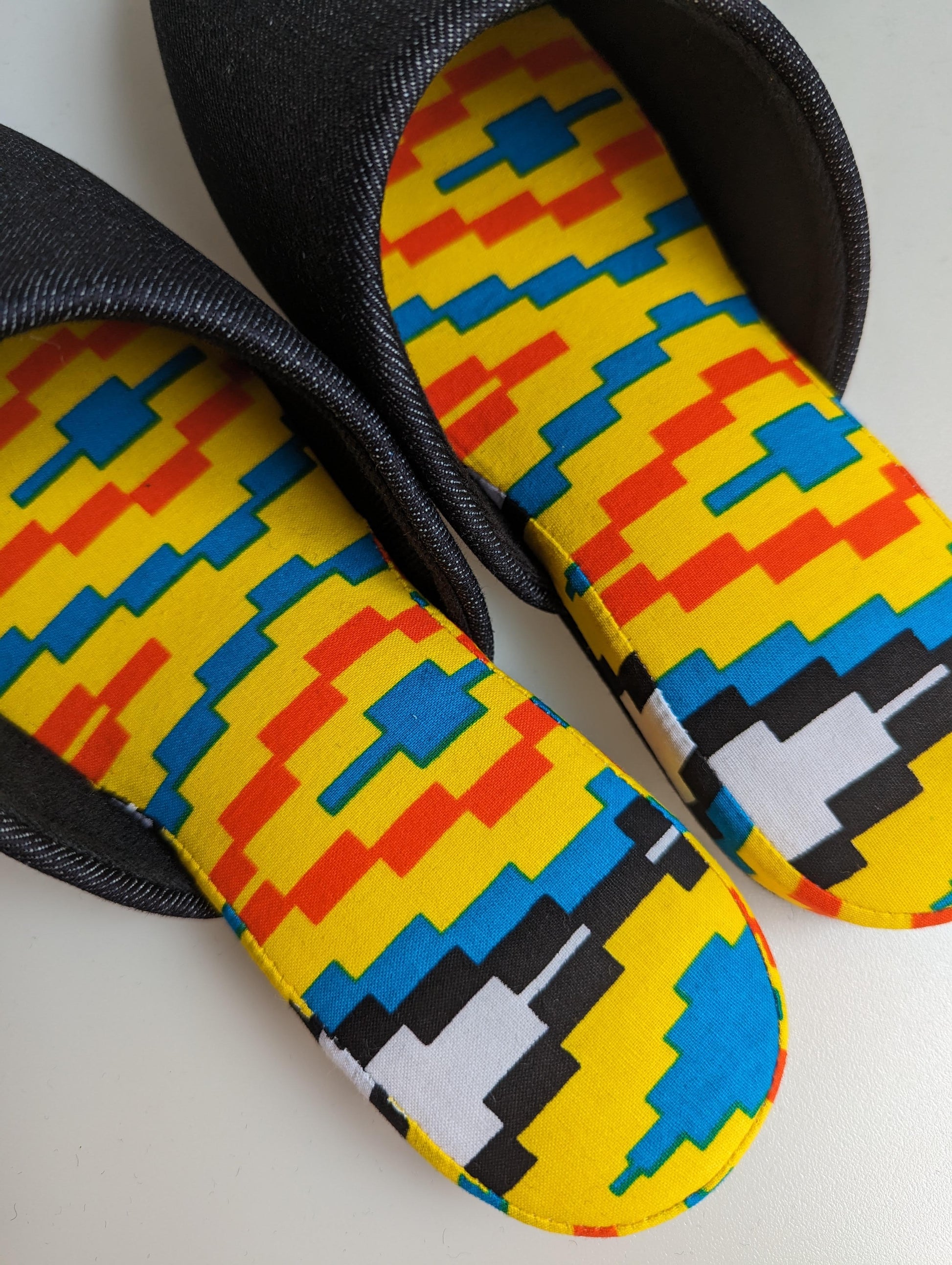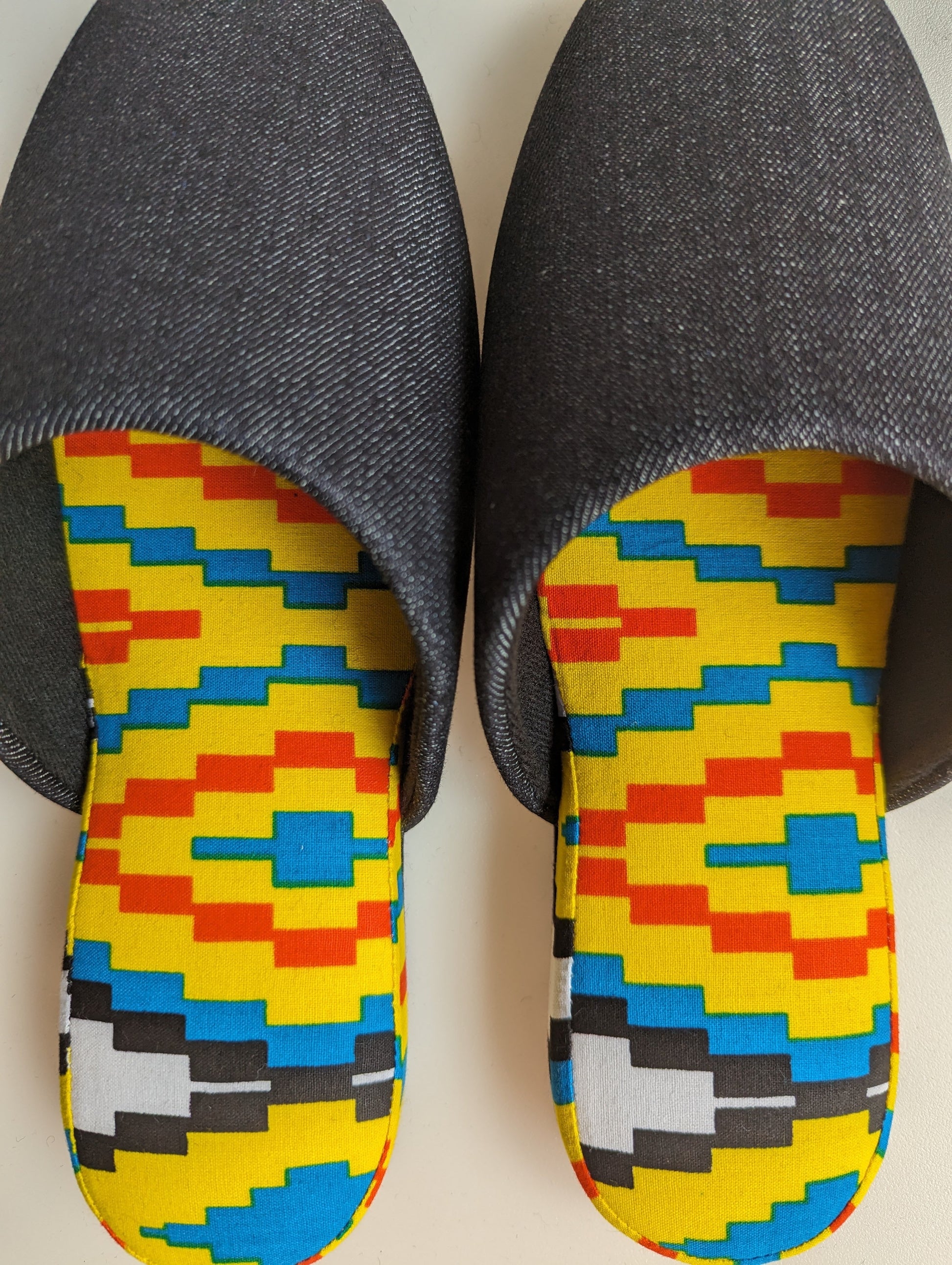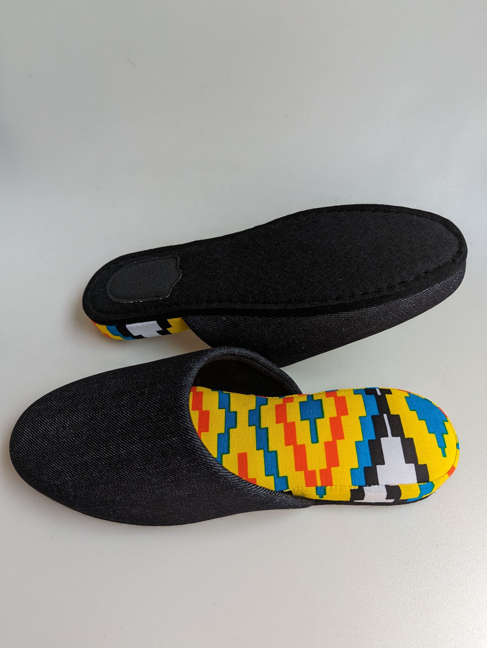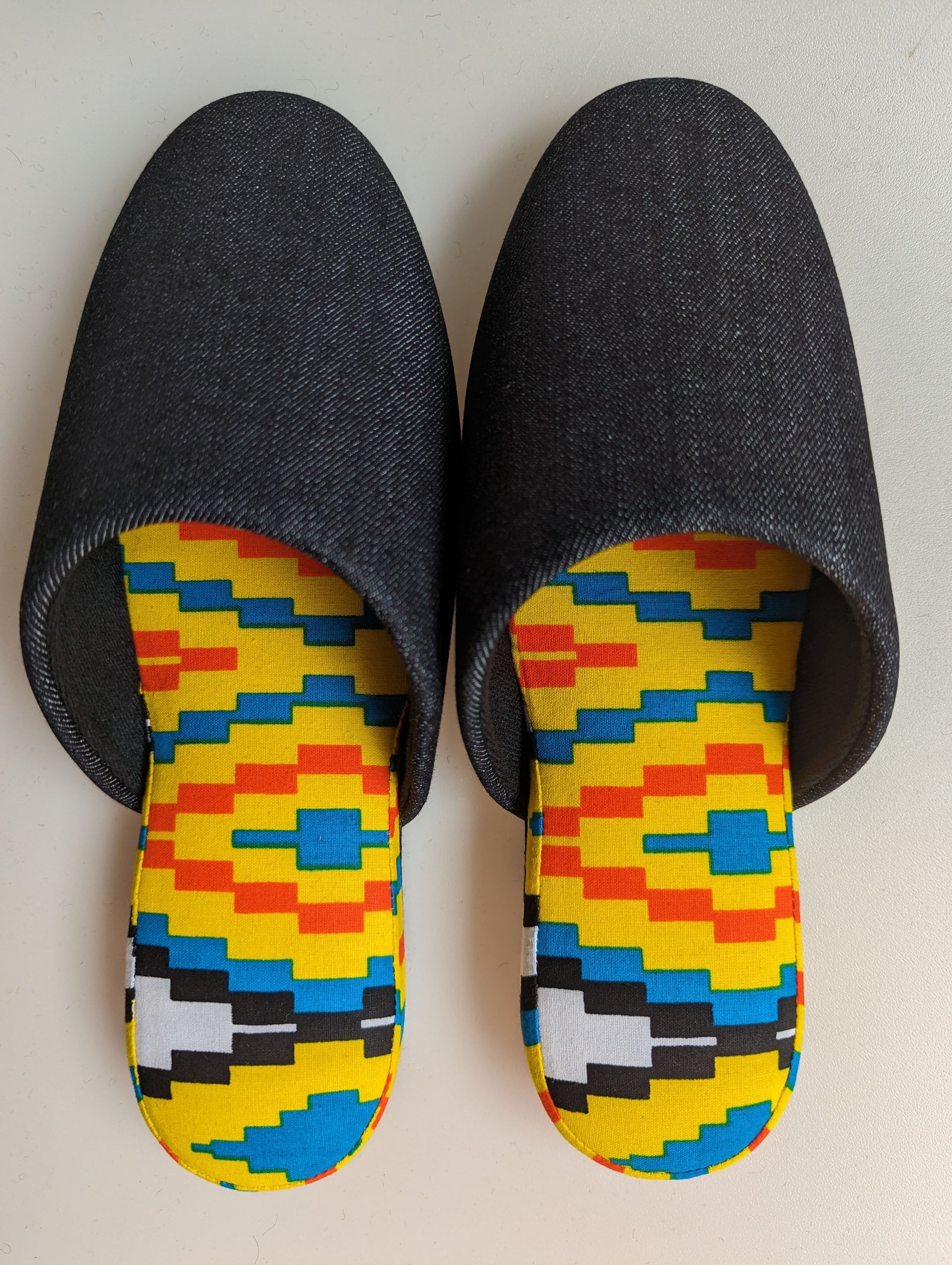 Material: Japanese Denim, Cotton, polyester, wool felt sole.