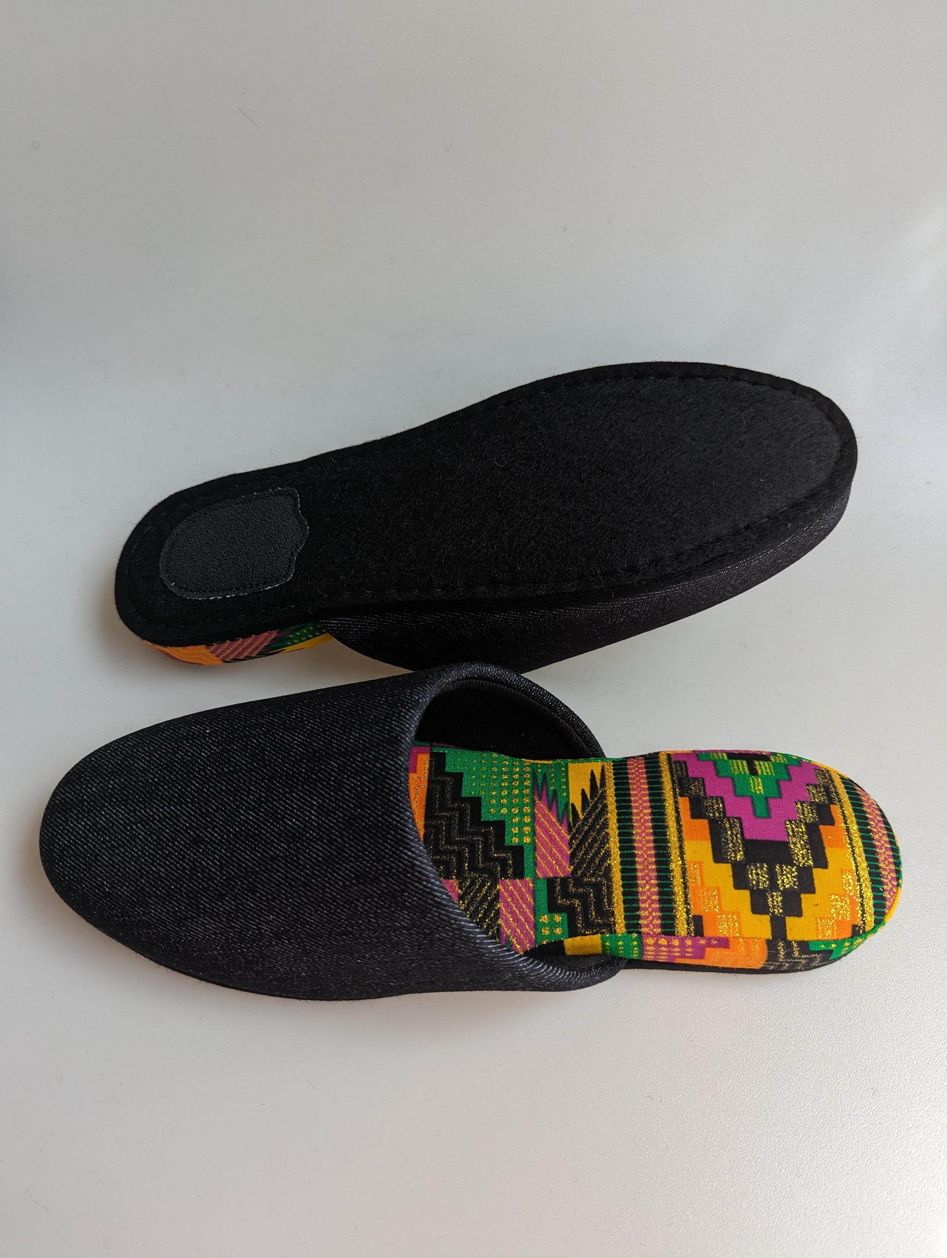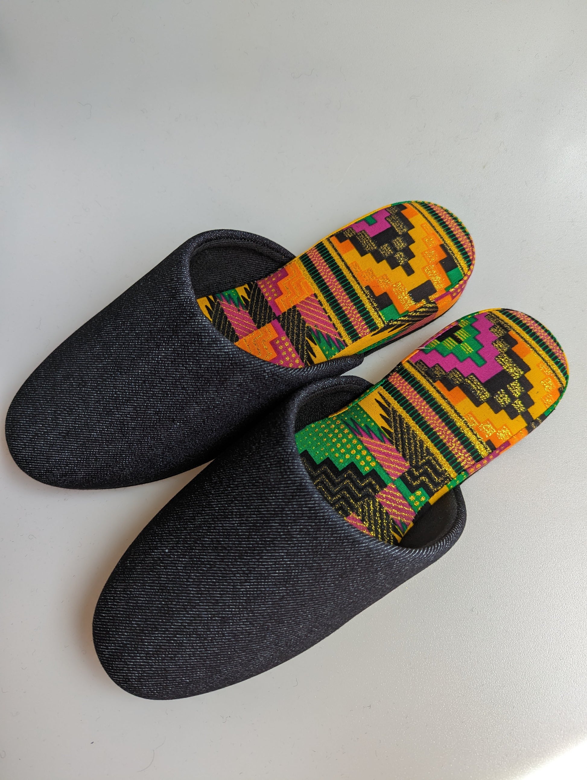 [SALE] Large | Denim and Flowers Mix Slippers #055 [Black wool felt sole]