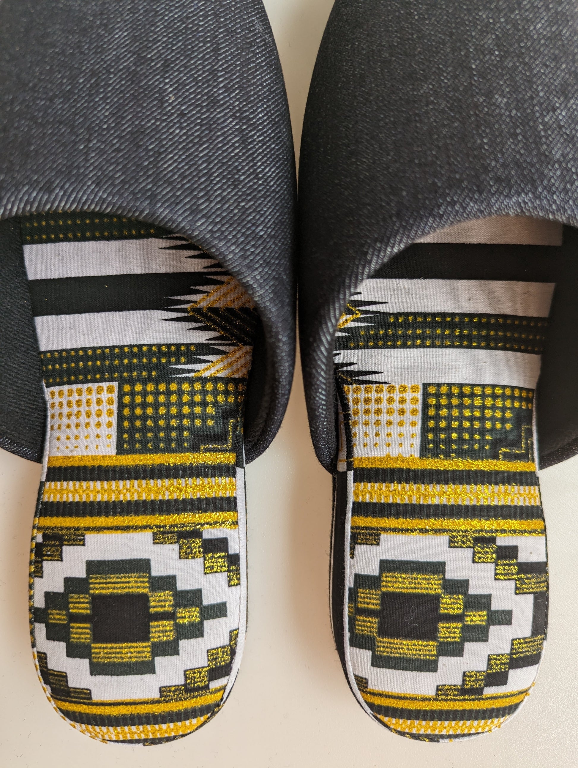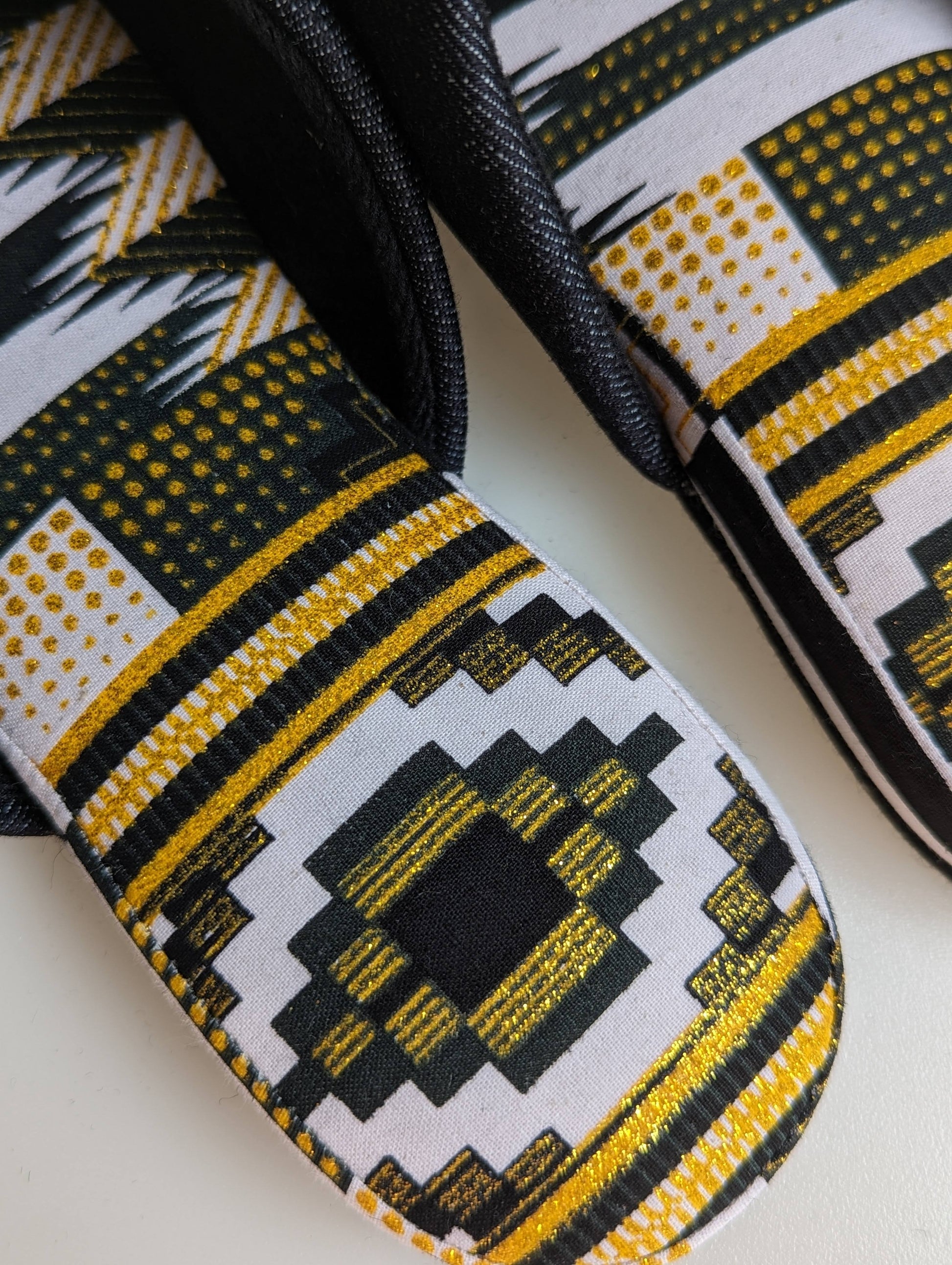 * These slippers are crafted from gold lamé fabric. The lamé portion may start to peel off with prolonged wear, so please exercise caution to prevent any color fading. This could become more noticeable when worn with white socks. We appreciate your understanding.