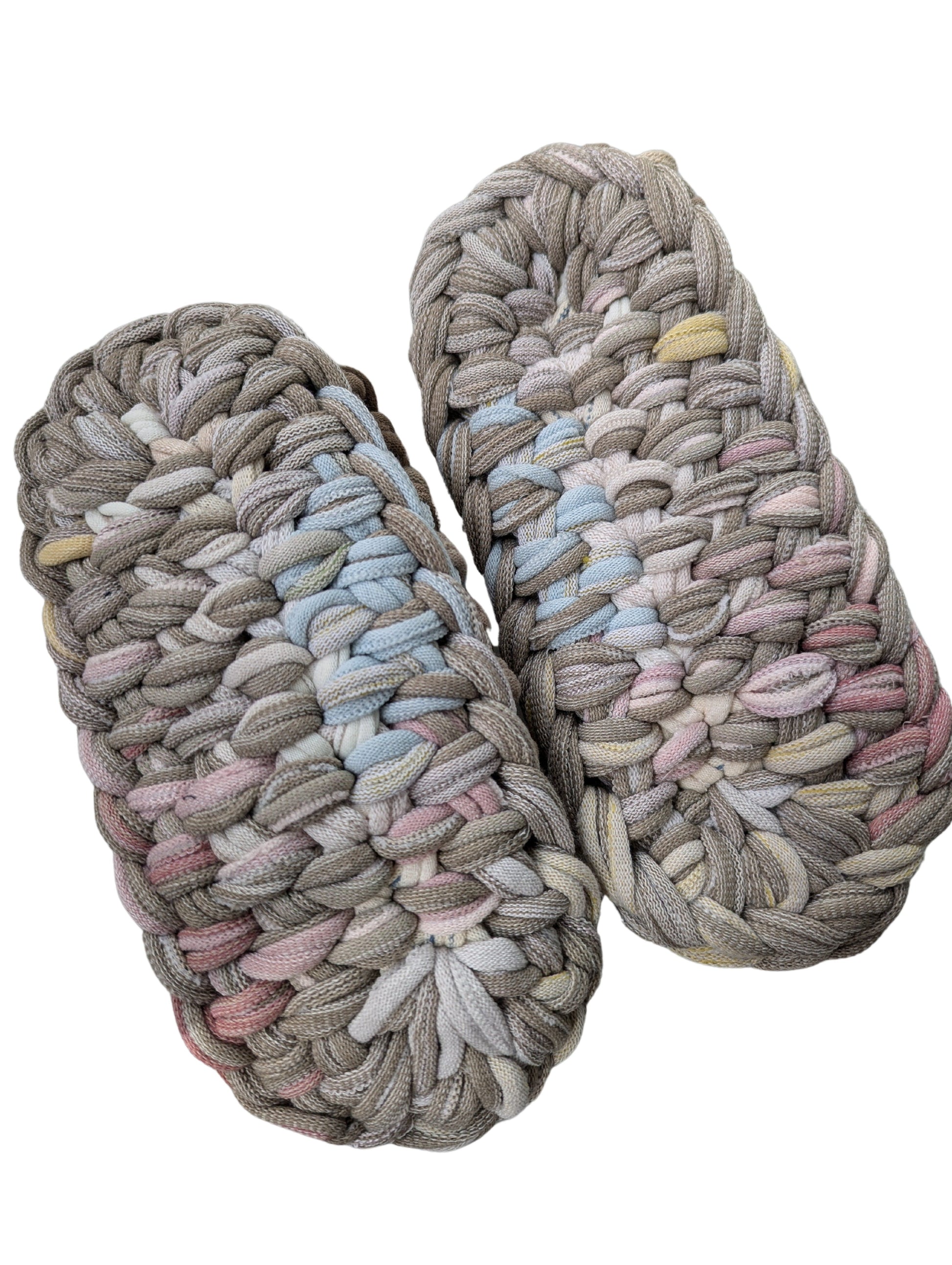 These slippers are made from recycled scraps of fabric discarded by a knitted items factory. As they are made from recycled materials, the size and color of individual slippers in a pair may have some minute discrepancies. These slippers are elastic. We would recommend these slippers for when you want to relax, or make yourself comfortable.