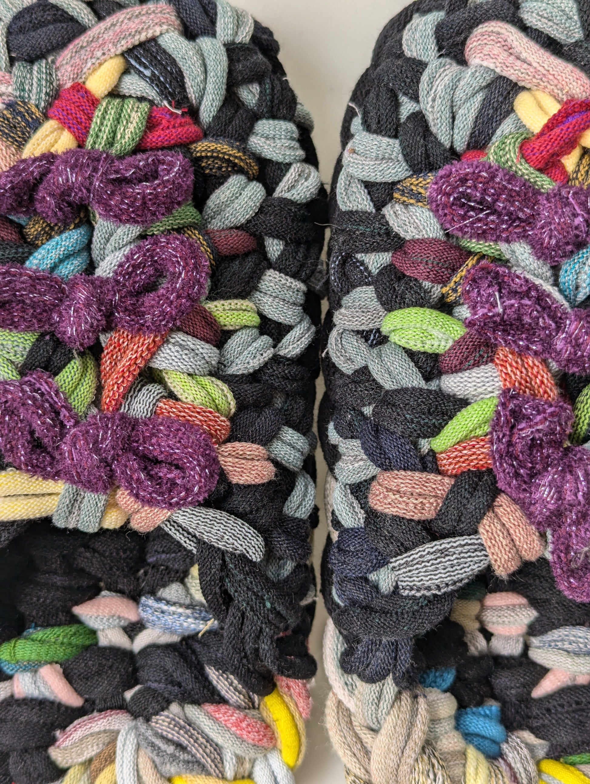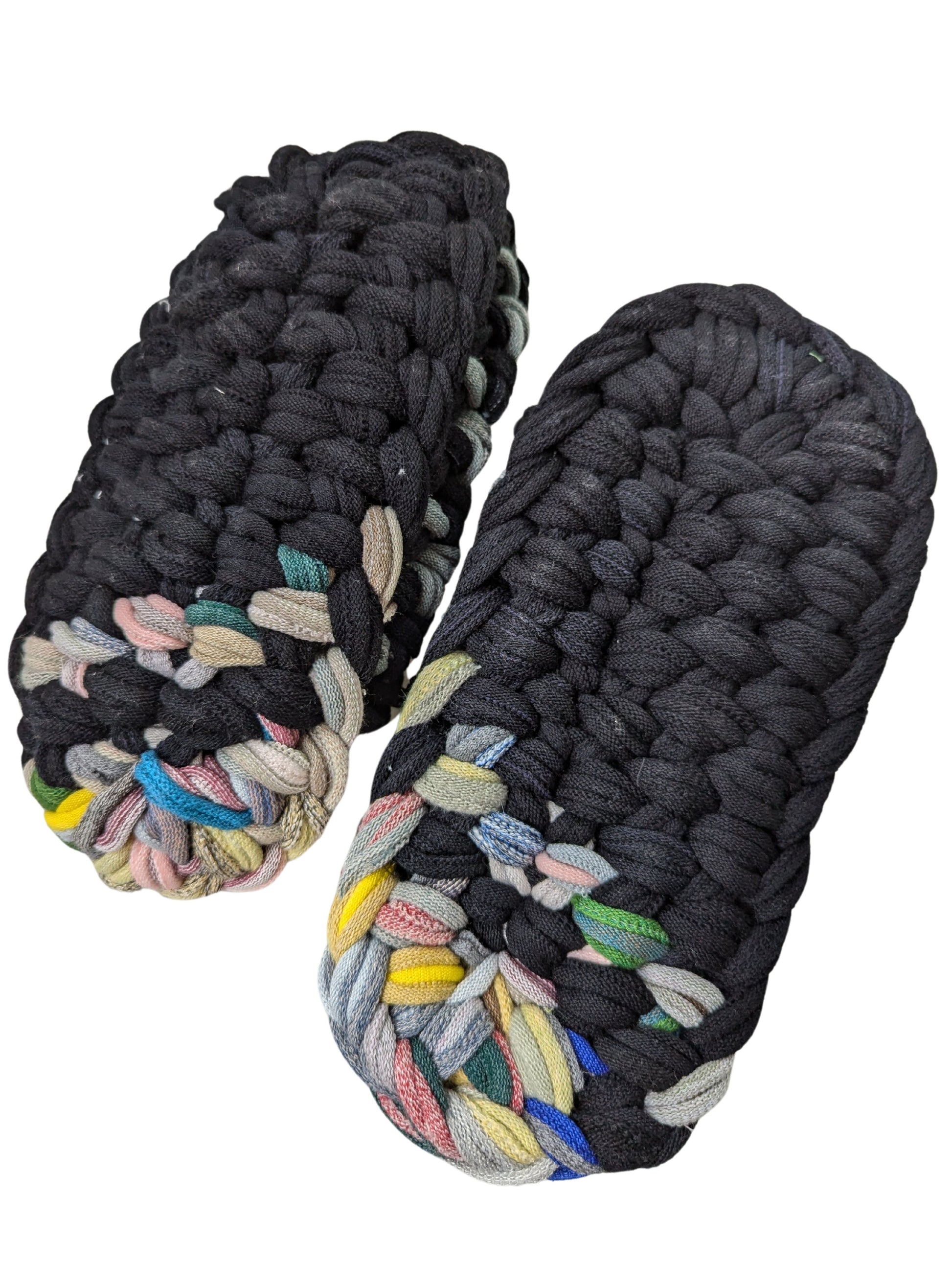 These slippers are made from recycled scraps of fabric discarded by a knitted items factory. As they are made from recycled materials, the size and color of individual slippers in a pair may have some minute discrepancies. These slippers are elastic. We would recommend these slippers for when you want to relax, or make yourself comfortable.