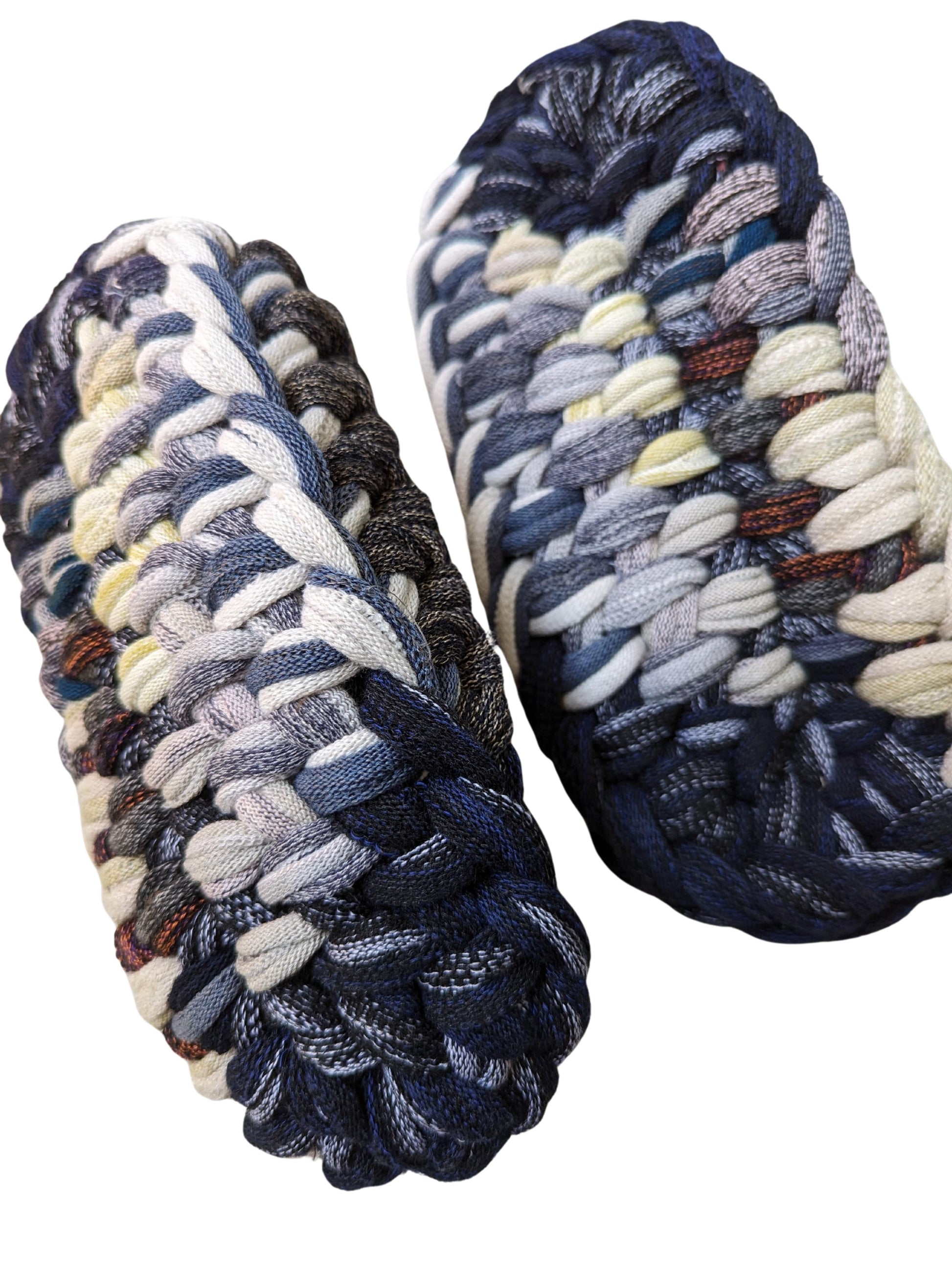 These slippers are made from recycled scraps of fabric discarded by a knitted items factory. As they are made from recycled materials, the size and color of individual slippers in a pair may have some minute discrepancies. These slippers are elastic. We would recommend these slippers for when you want to relax, or make yourself comfortable.