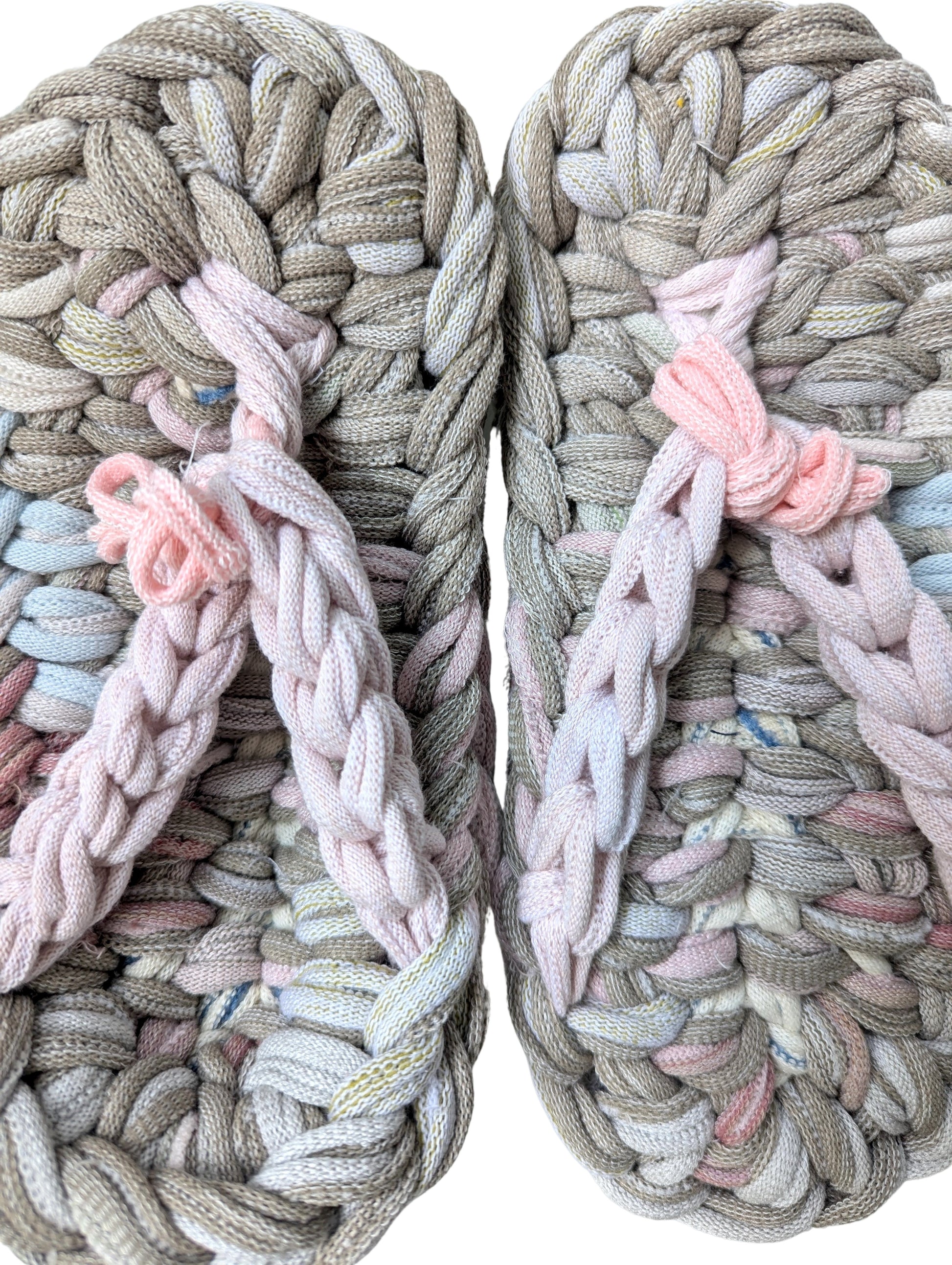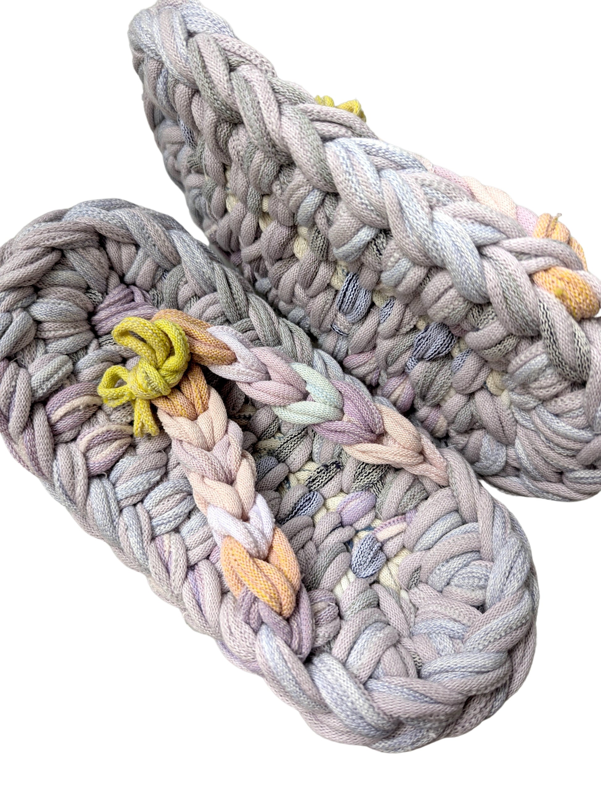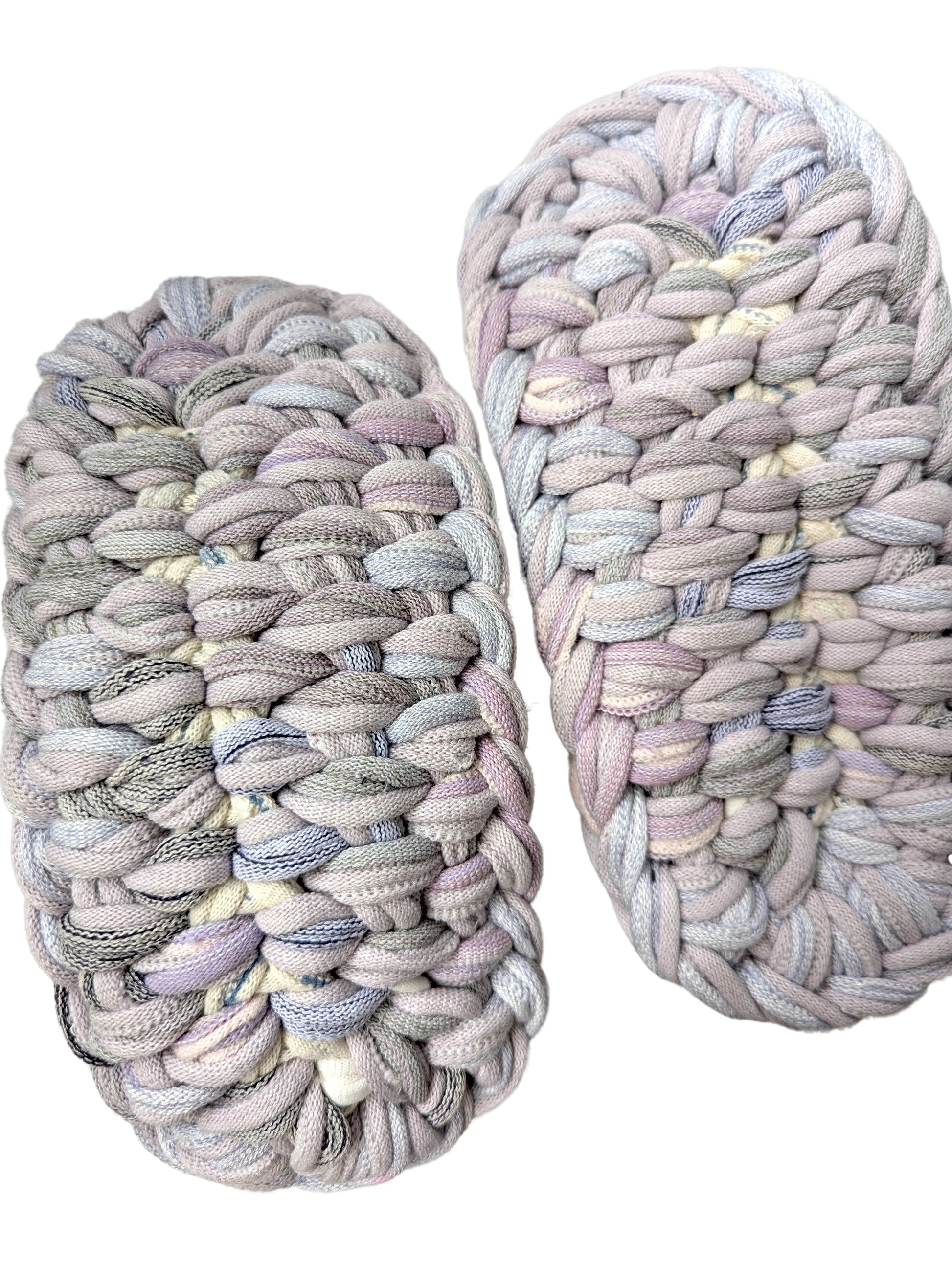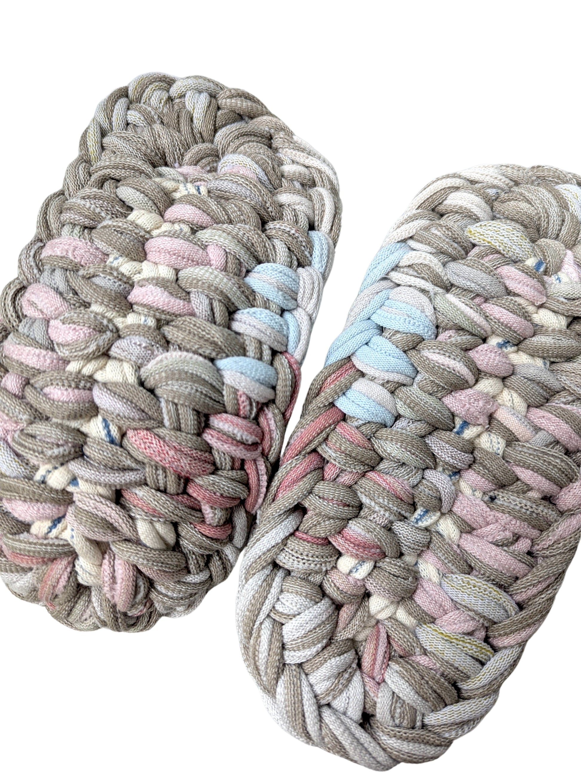 These slippers are made from recycled scraps of fabric discarded by a knitted items factory. As they are made from recycled materials, the size and colour of individual slippers in a pair may have some minute discrepancies. These slippers are elastic. We would recommend these slippers for when you want to relax, or make yourself comfortable.
