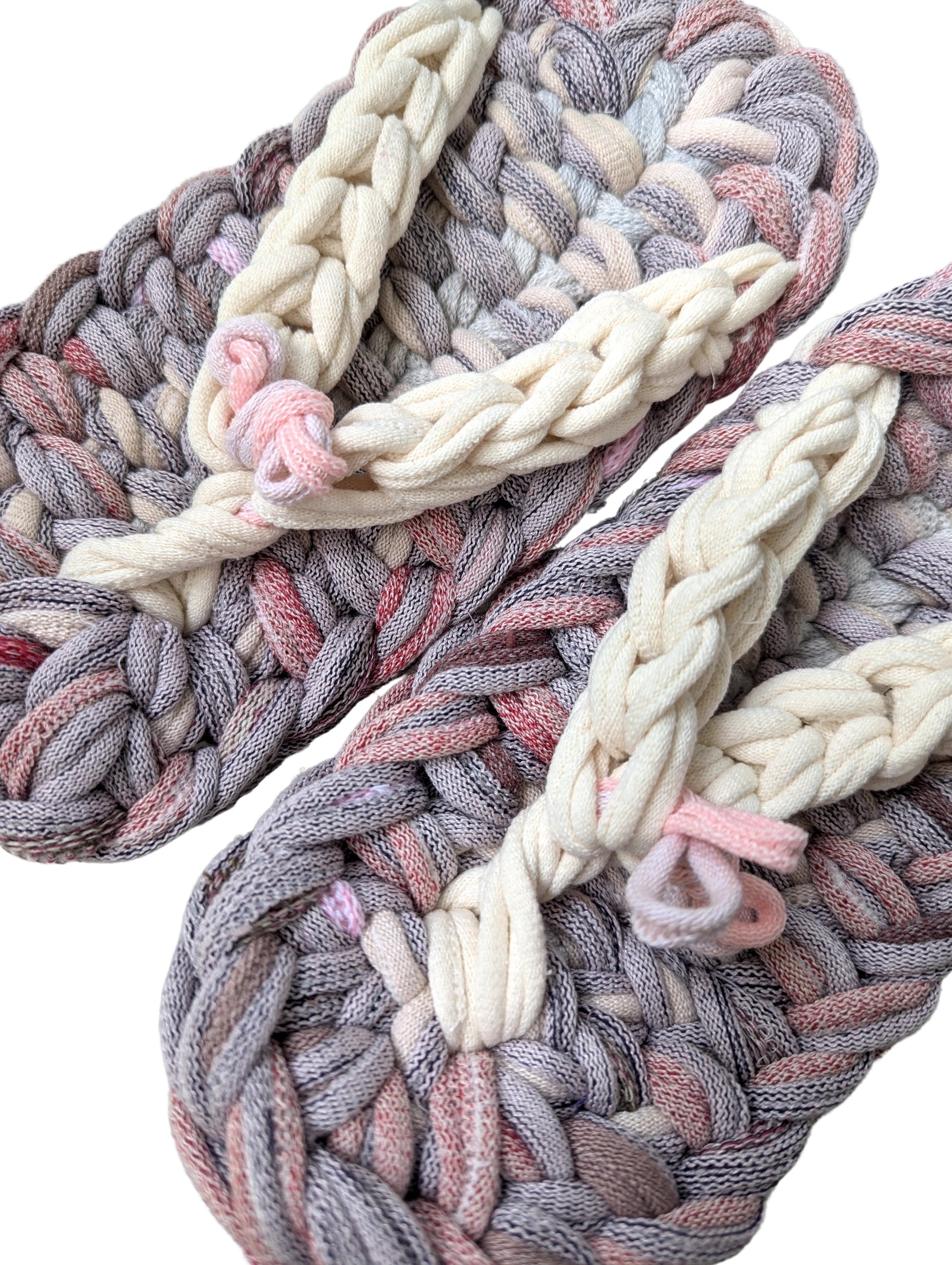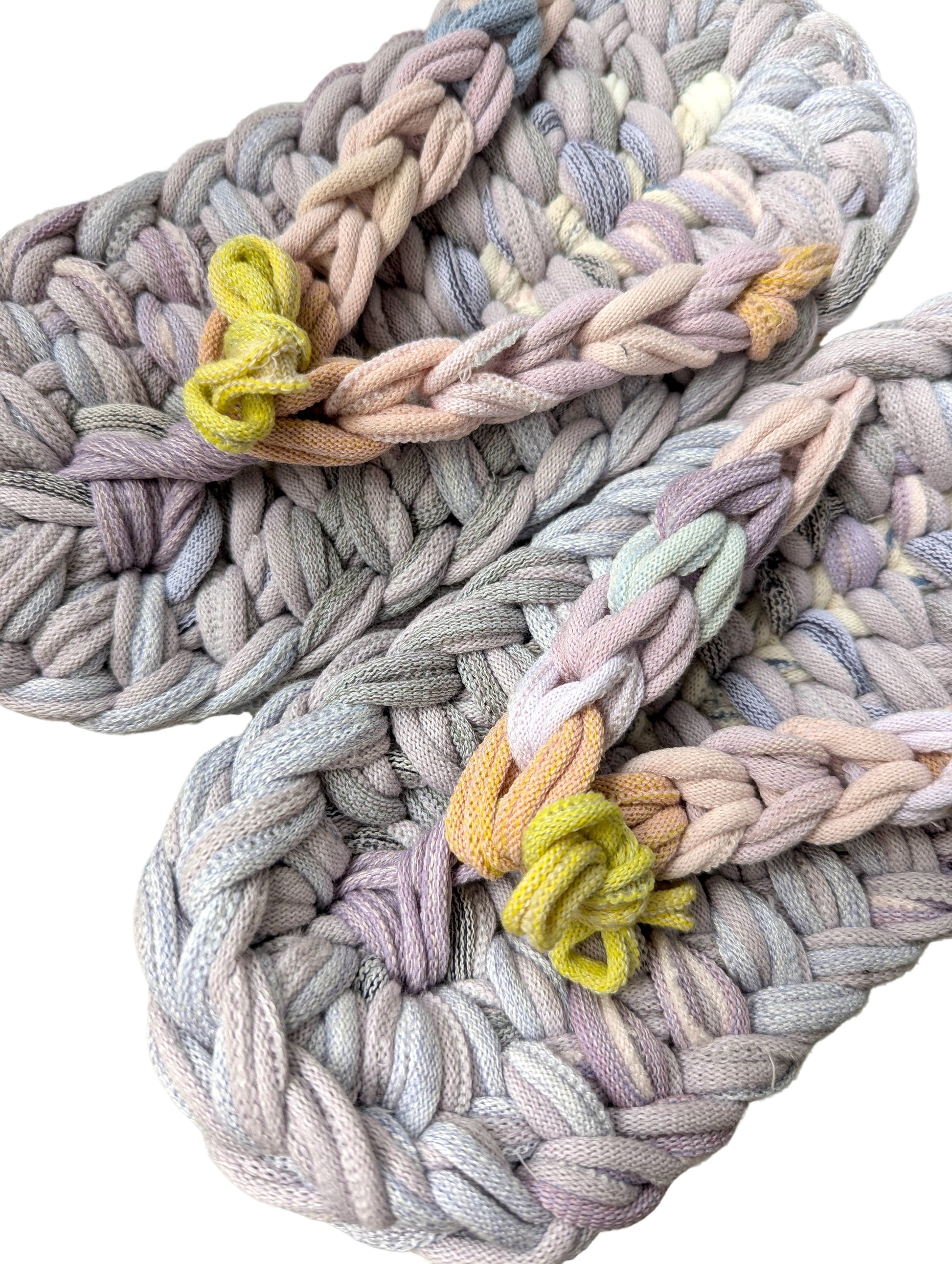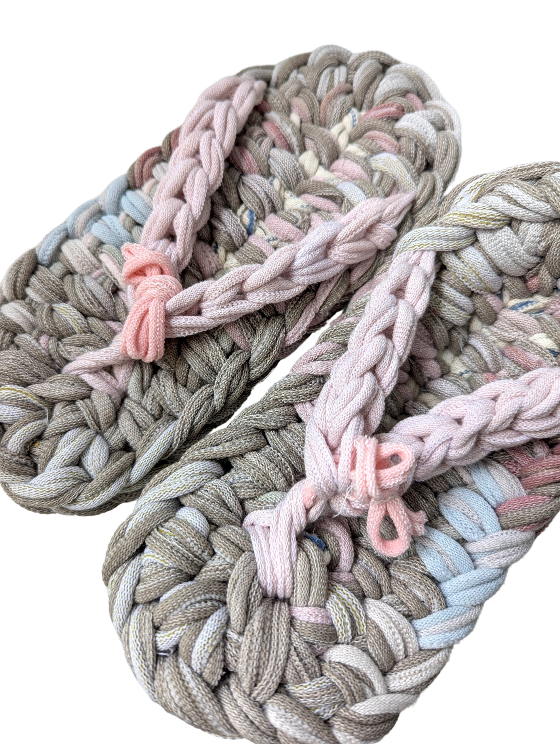 These slippers are made from recycled scraps of fabric discarded by a knitted items factory. As they are made from recycled materials, the size and colour of individual slippers in a pair may have some minute discrepancies. These slippers are elastic. We would recommend these slippers for when you want to relax, or make yourself comfortable.