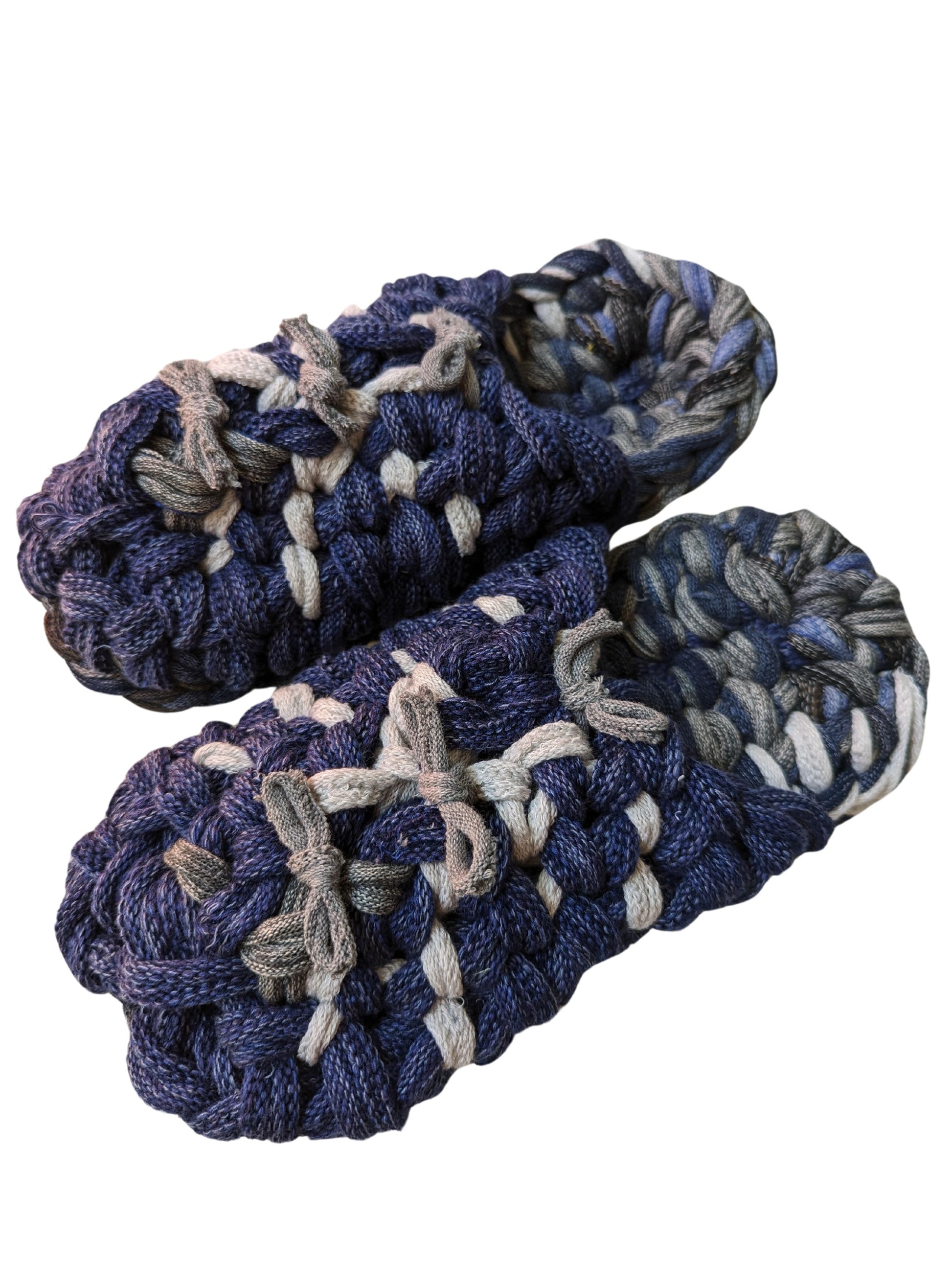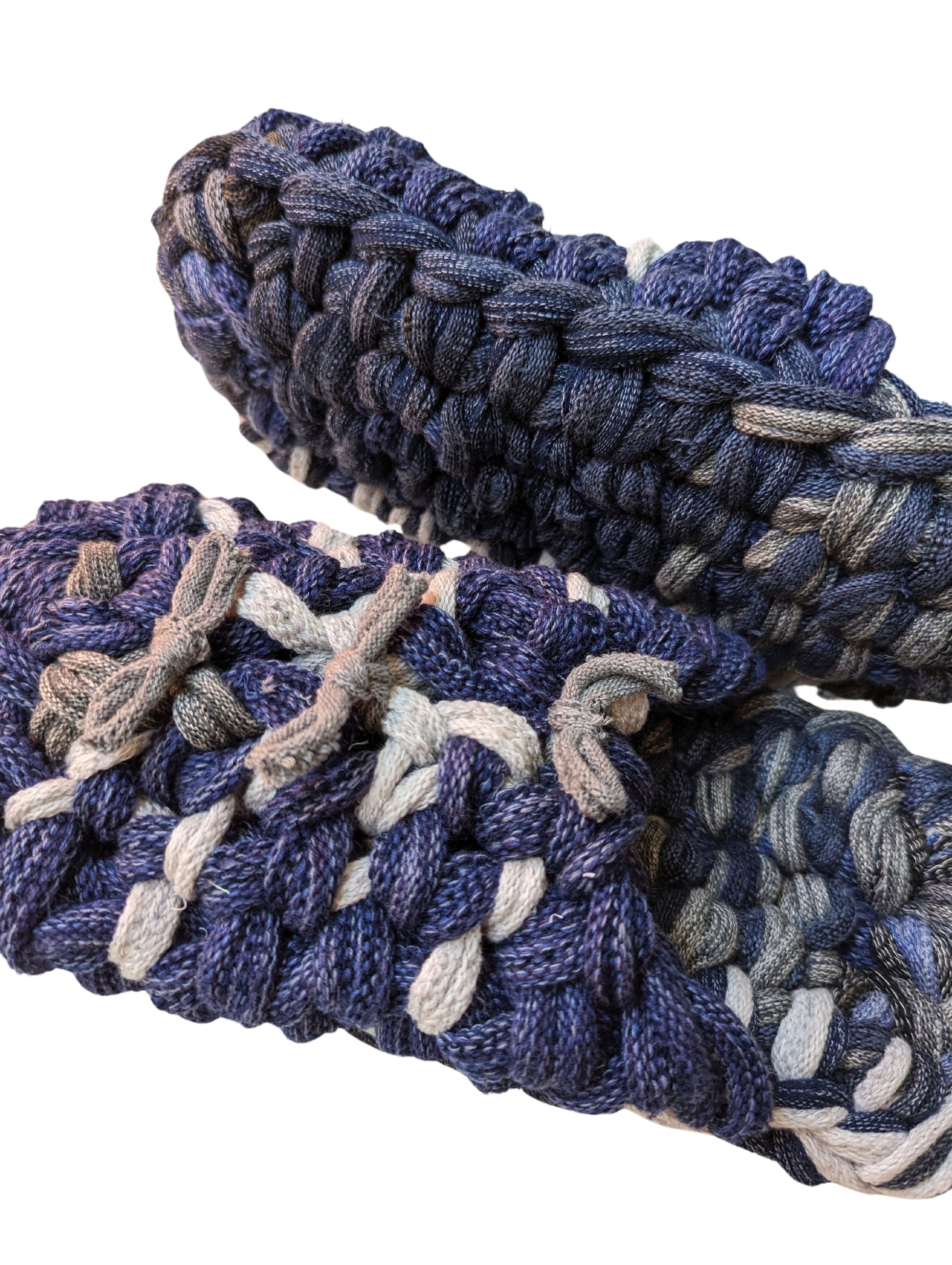 These slippers are made from recycled scraps of fabric discarded by a knitted items factory. As they are made from recycled materials, the size and colour of individual slippers in a pair may have some minute discrepancies. These slippers are elastic. We would recommend these slippers for when you want to relax, or make yourself comfortable.