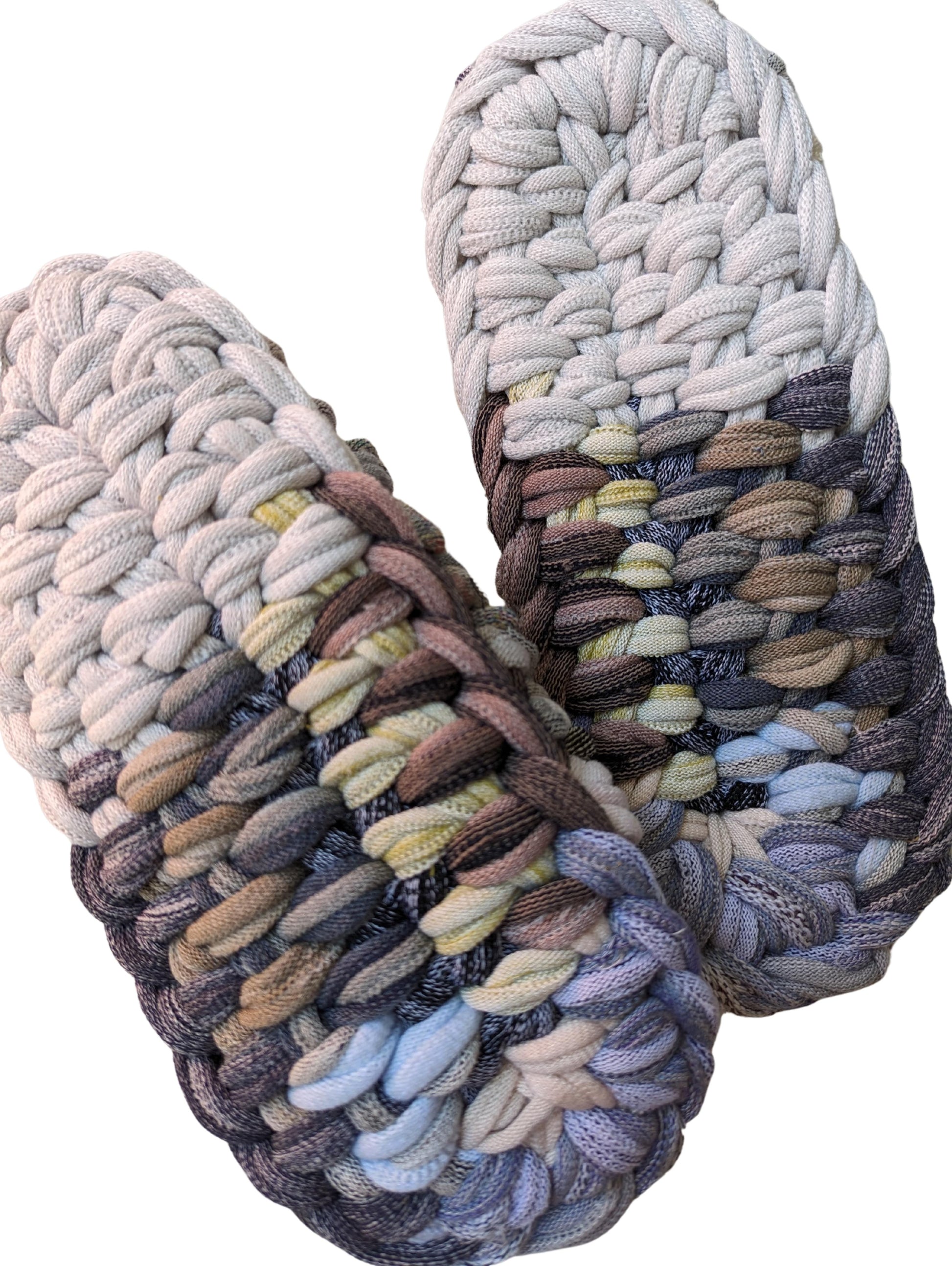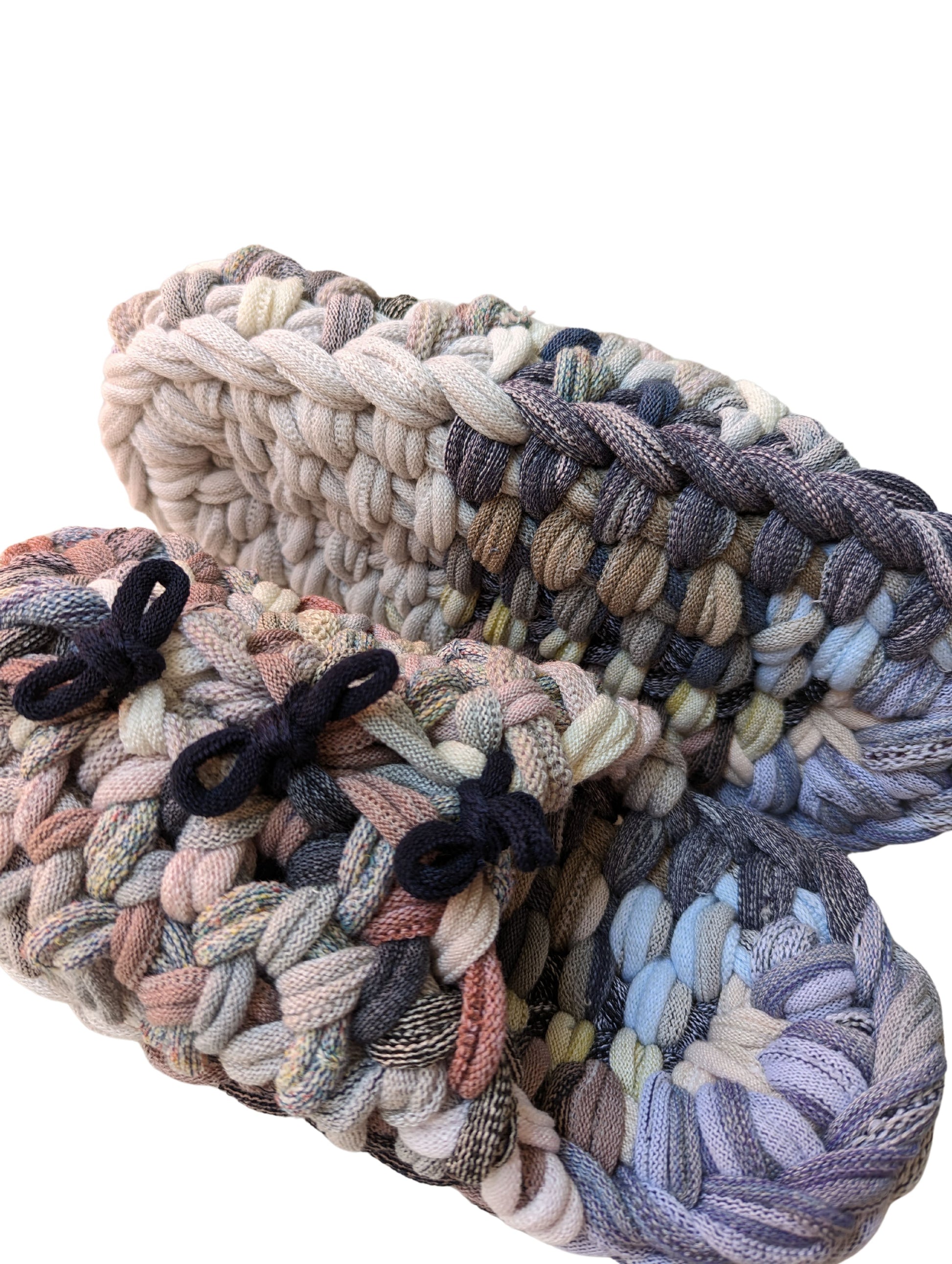These slippers are made from recycled scraps of fabric discarded by a knitted items factory. As they are made from recycled materials, the size and colour of individual slippers in a pair may have some minute discrepancies. These slippers are elastic. We would recommend these slippers for when you want to relax, or make yourself comfortable.