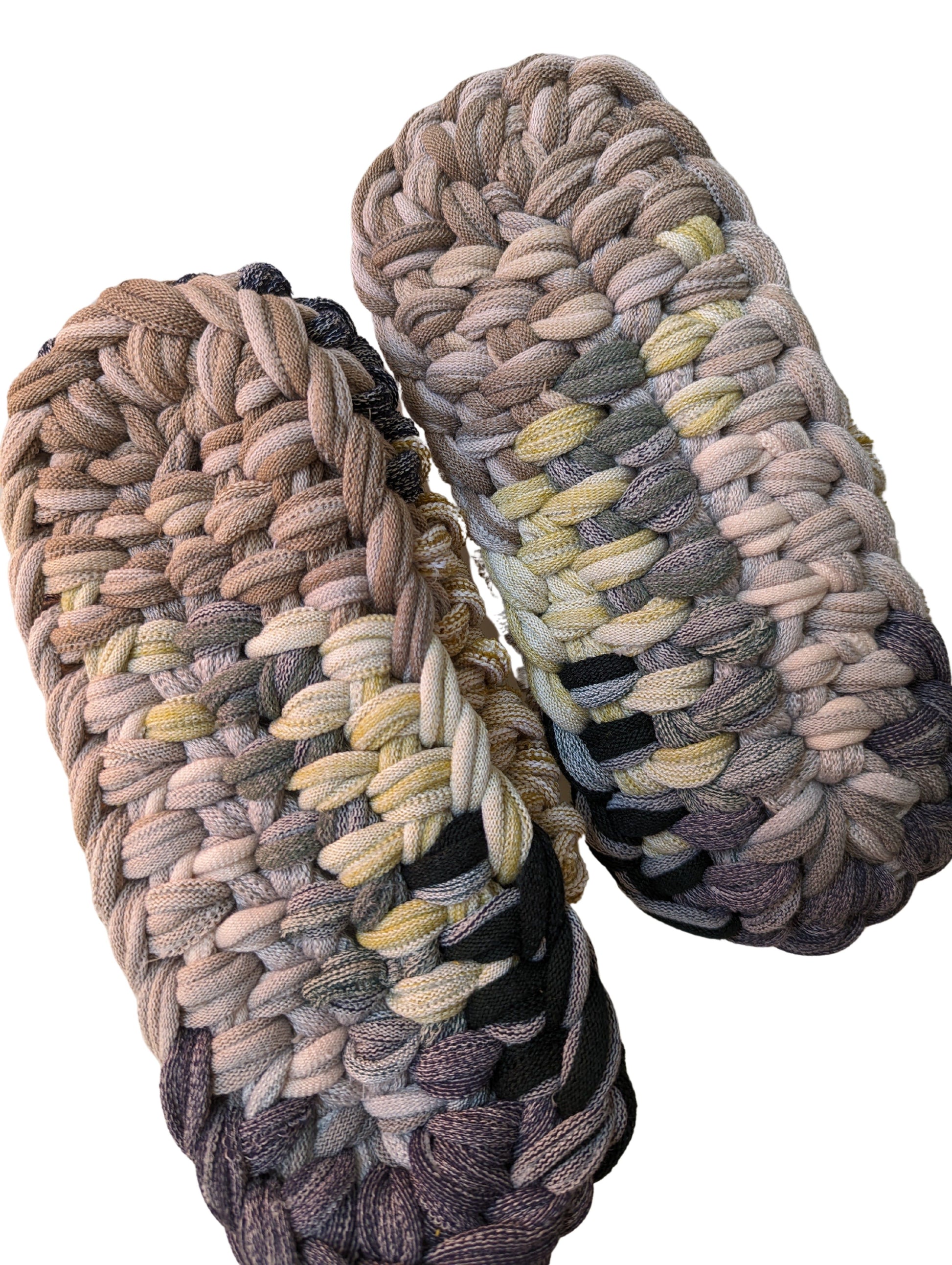 These slippers are made from recycled scraps of fabric discarded by a knitted items factory. As they are made from recycled materials, the size and colour of individual slippers in a pair may have some minute discrepancies. These slippers are elastic. We would recommend these slippers for when you want to relax, or make yourself comfortable.