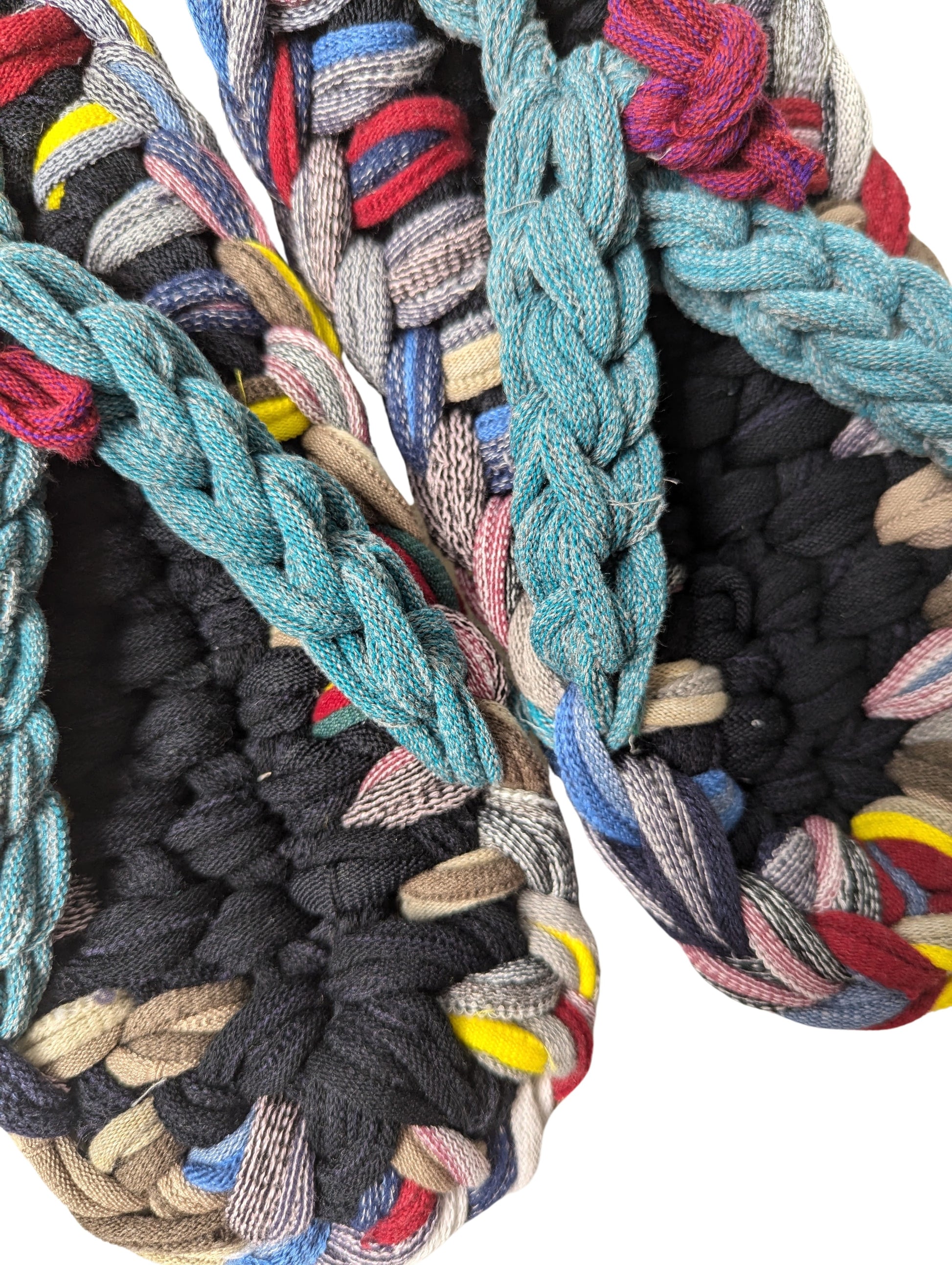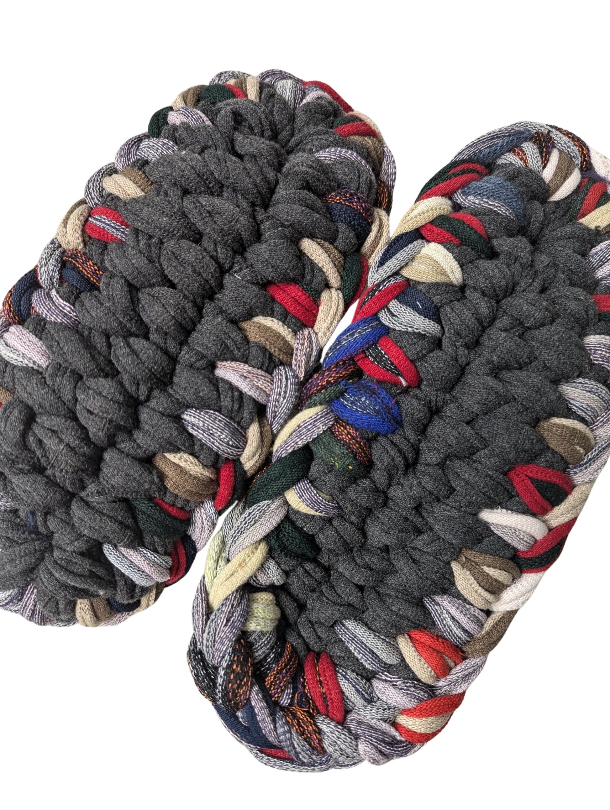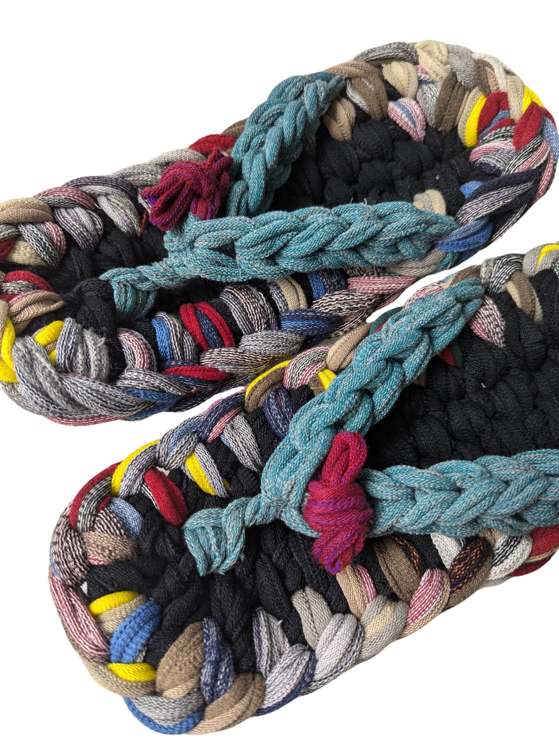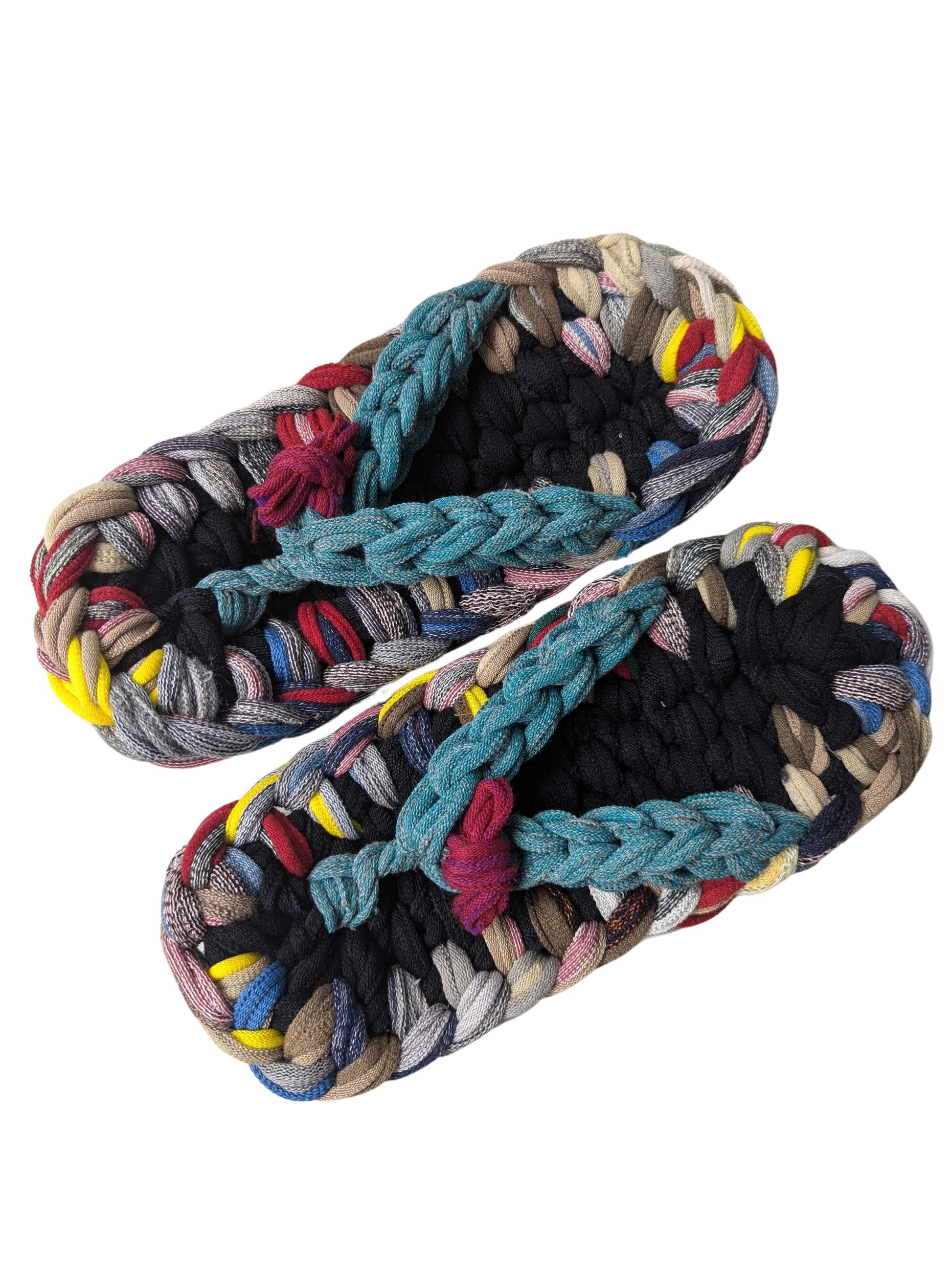 These slippers are made from recycled scraps of fabric discarded by a knitted items factory. As they are made from recycled materials, the size and colour of individual slippers in a pair may have some minute discrepancies. These slippers are elastic. We would recommend these slippers for when you want to relax, or make yourself comfortable.