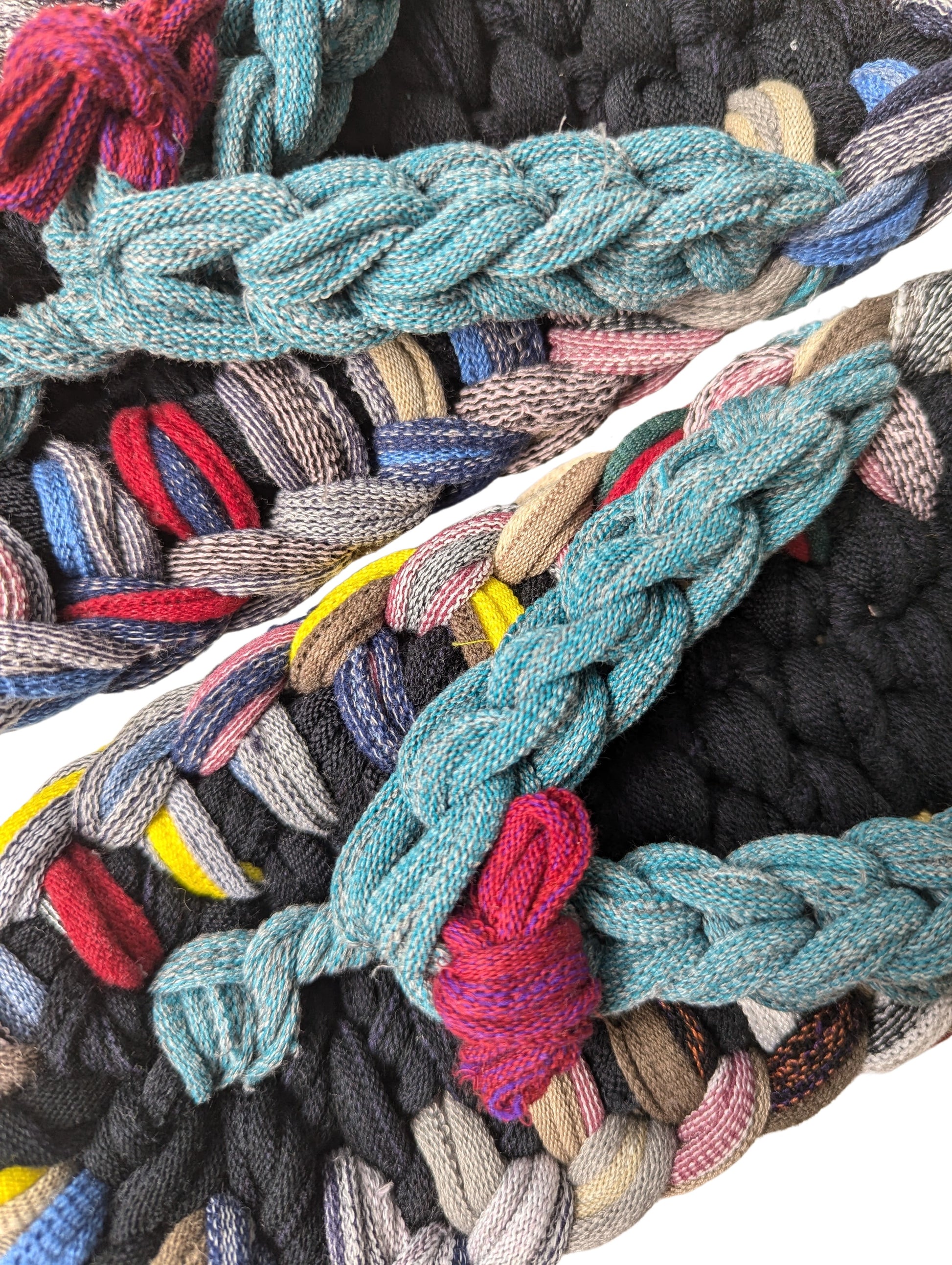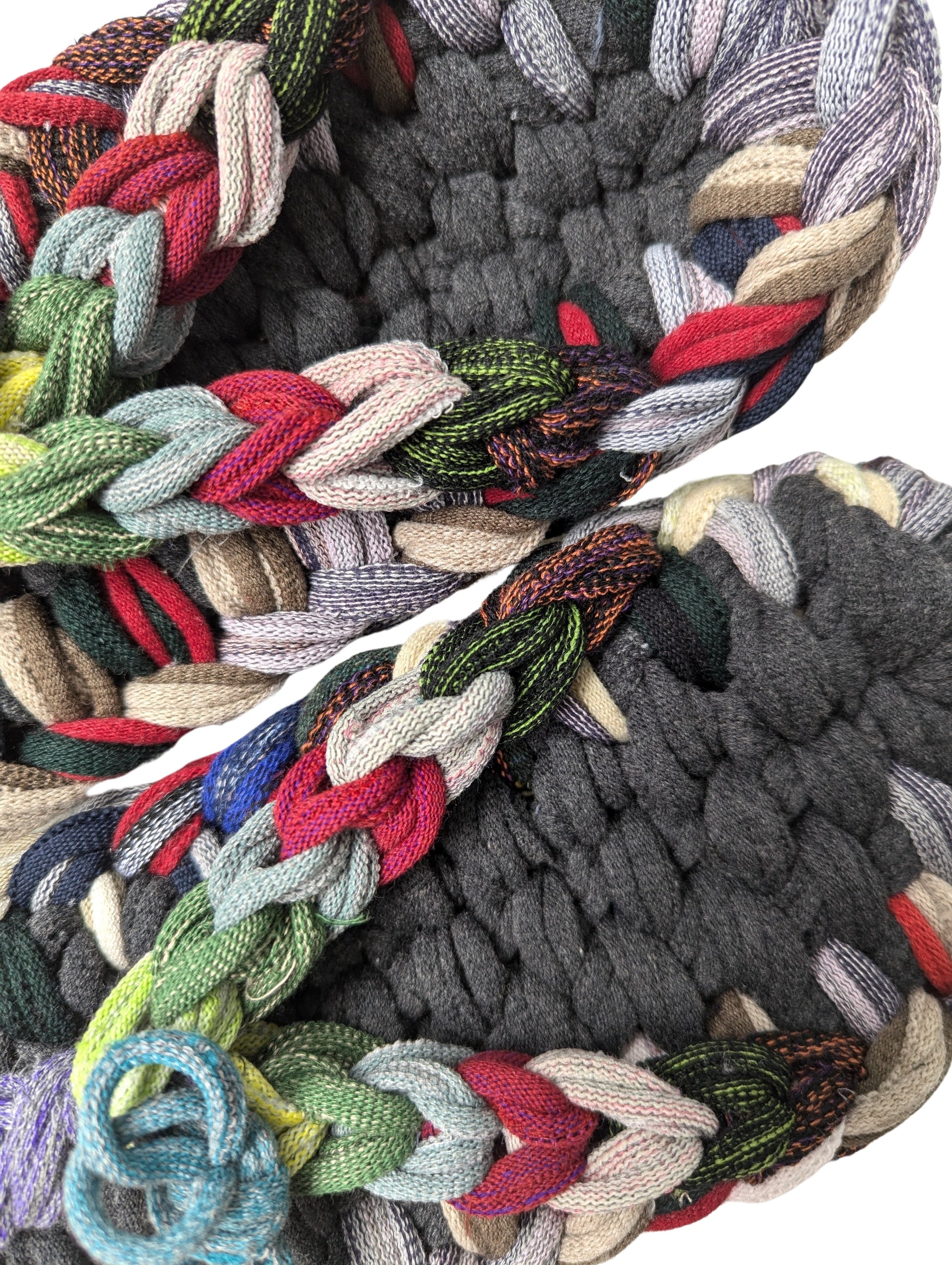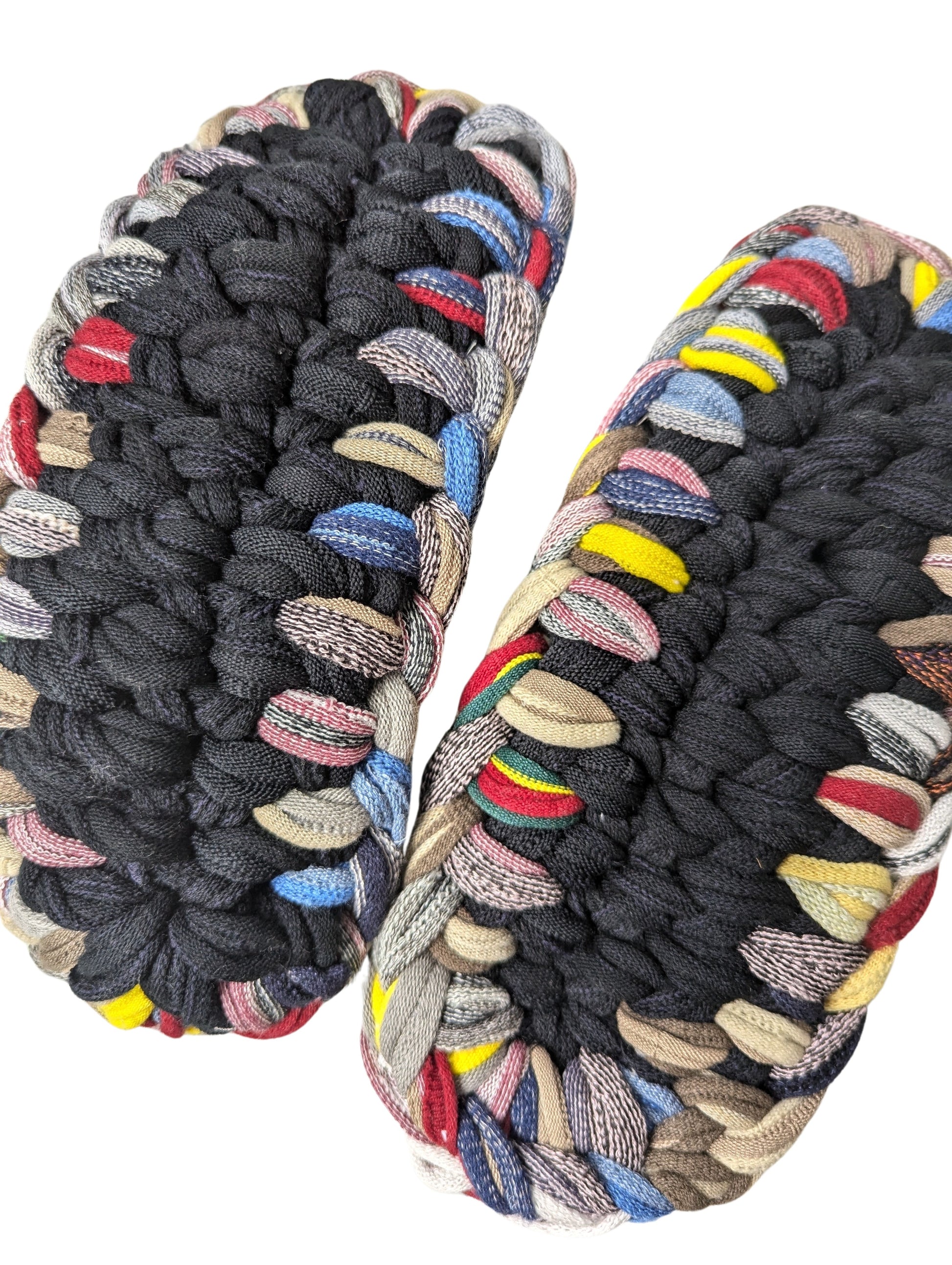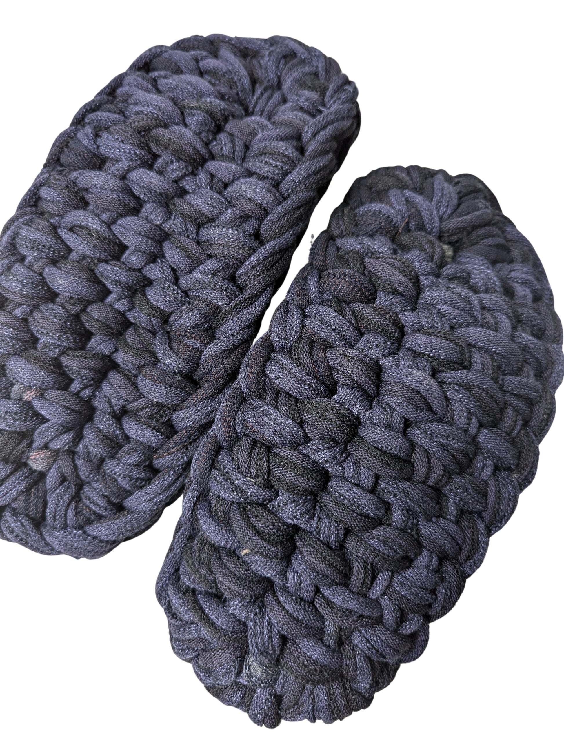 These slippers are made from recycled scraps of fabric discarded by a knitted items factory. As they are made from recycled materials, the size and colour of individual slippers in a pair may have some minute discrepancies. These slippers are elastic. We would recommend these slippers for when you want to relax, or make yourself comfortable.