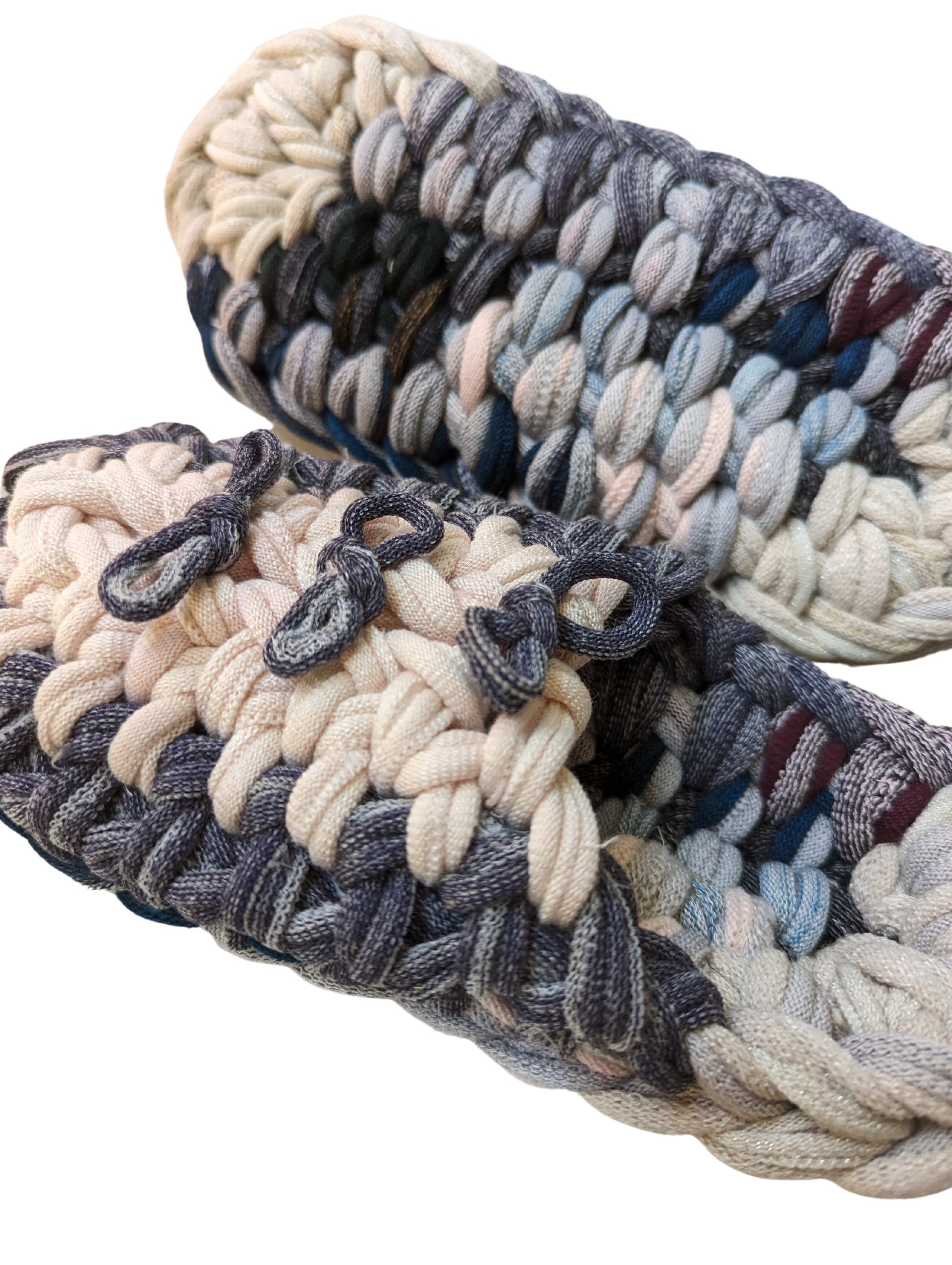 These slippers are made from recycled scraps of fabric discarded by a knitted items factory. As they are made from recycled materials, the size and colour of individual slippers in a pair may have some minute discrepancies. These slippers are elastic. We would recommend these slippers for when you want to relax, or make yourself comfortable.