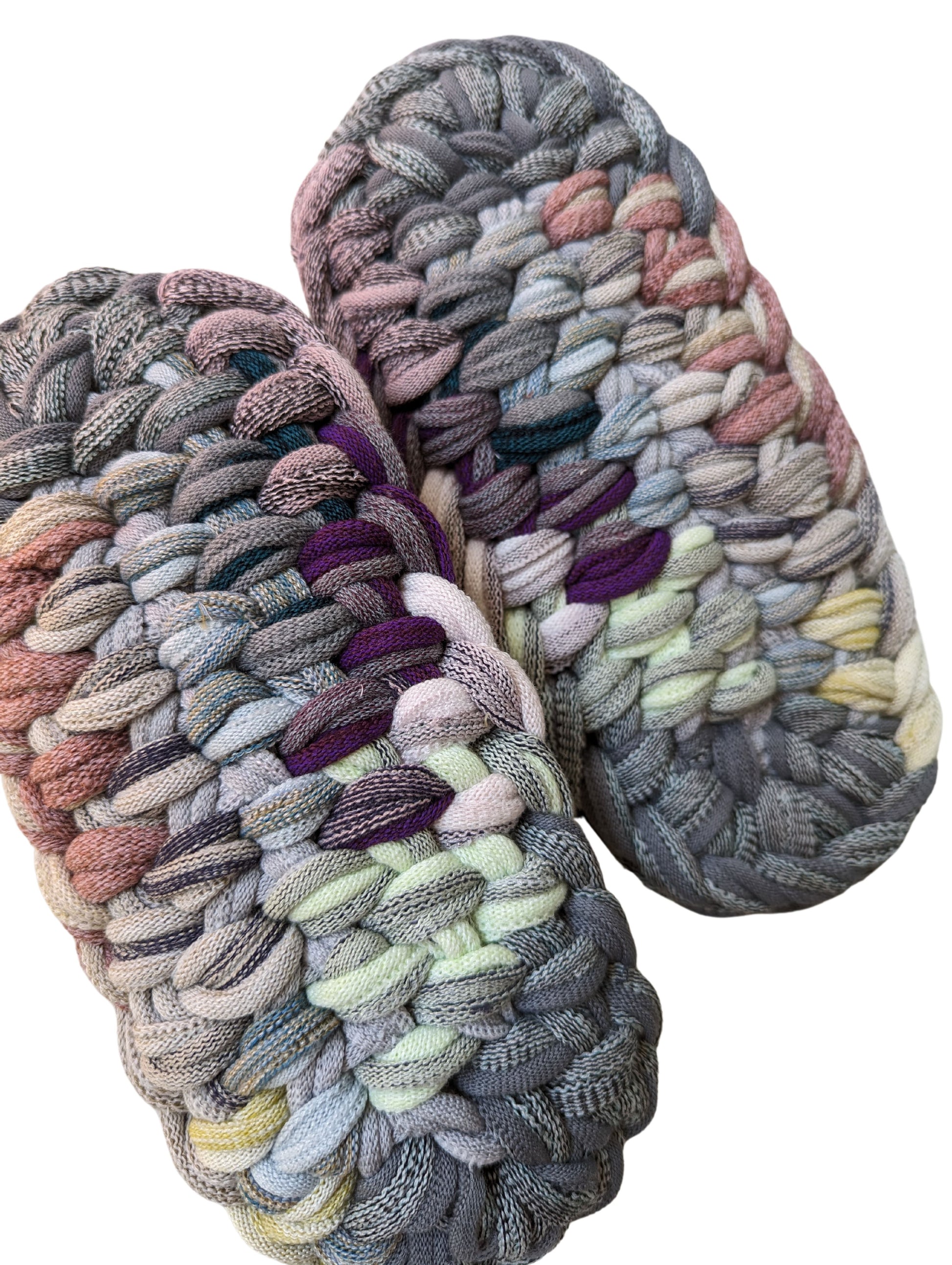 These slippers are made from recycled scraps of fabric discarded by a knitted items factory. As they are made from recycled materials, the size and colour of individual slippers in a pair may have some minute discrepancies. These slippers are elastic. We would recommend these slippers for when you want to relax, or make yourself comfortable.