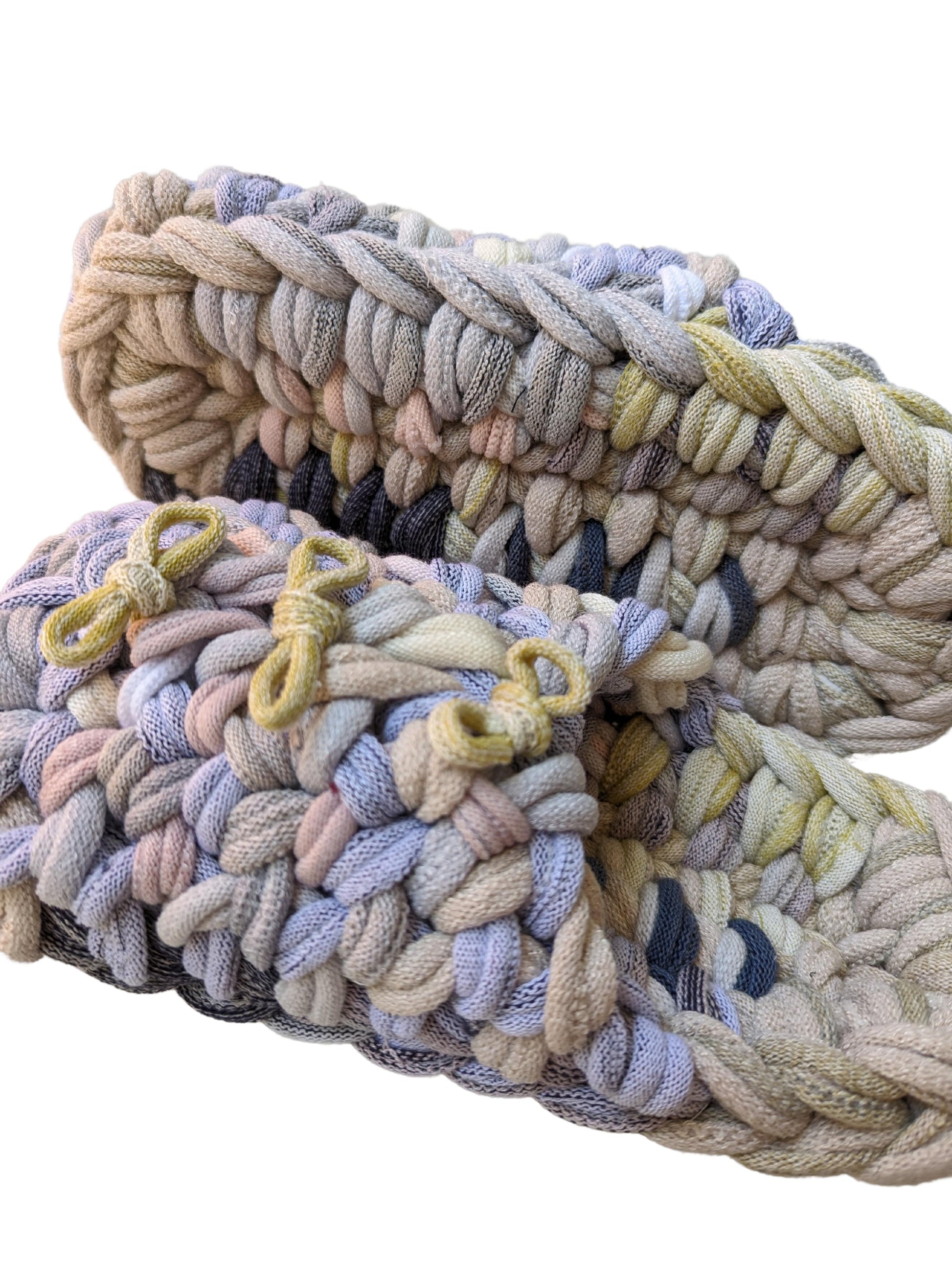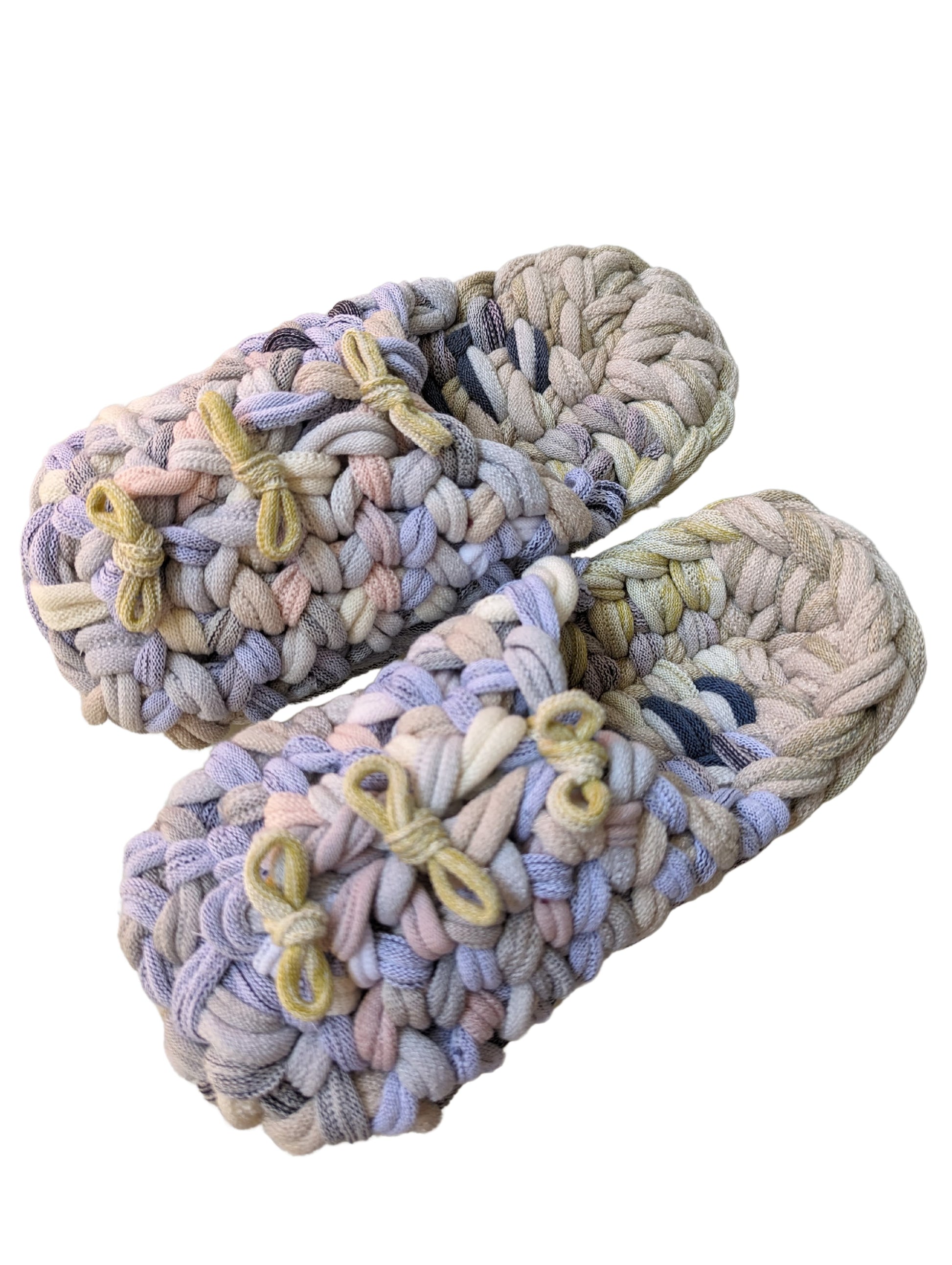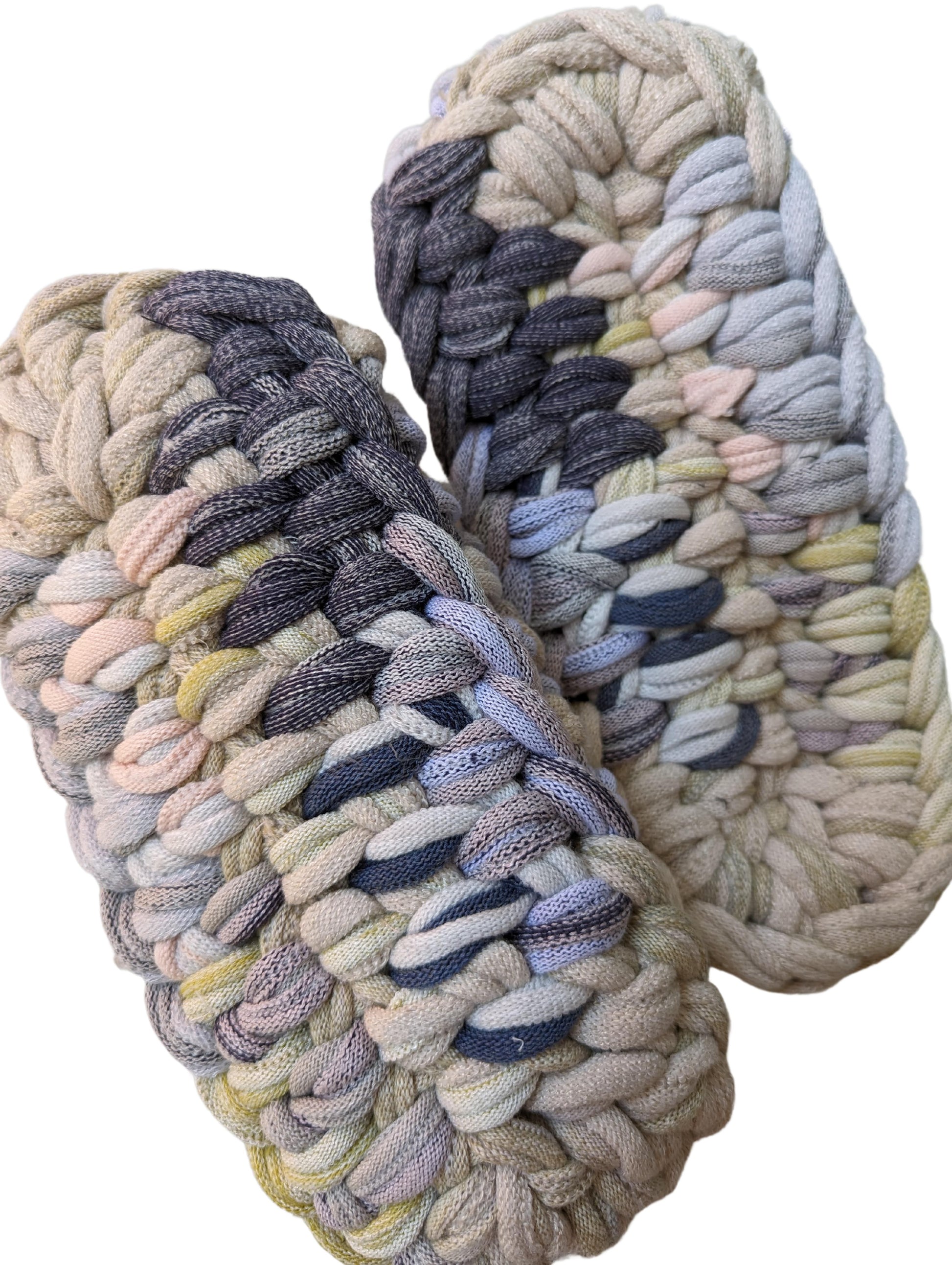 These slippers are made from recycled scraps of fabric discarded by a knitted items factory. As they are made from recycled materials, the size and colour of individual slippers in a pair may have some minute discrepancies. These slippers are elastic. We would recommend these slippers for when you want to relax, or make yourself comfortable.
