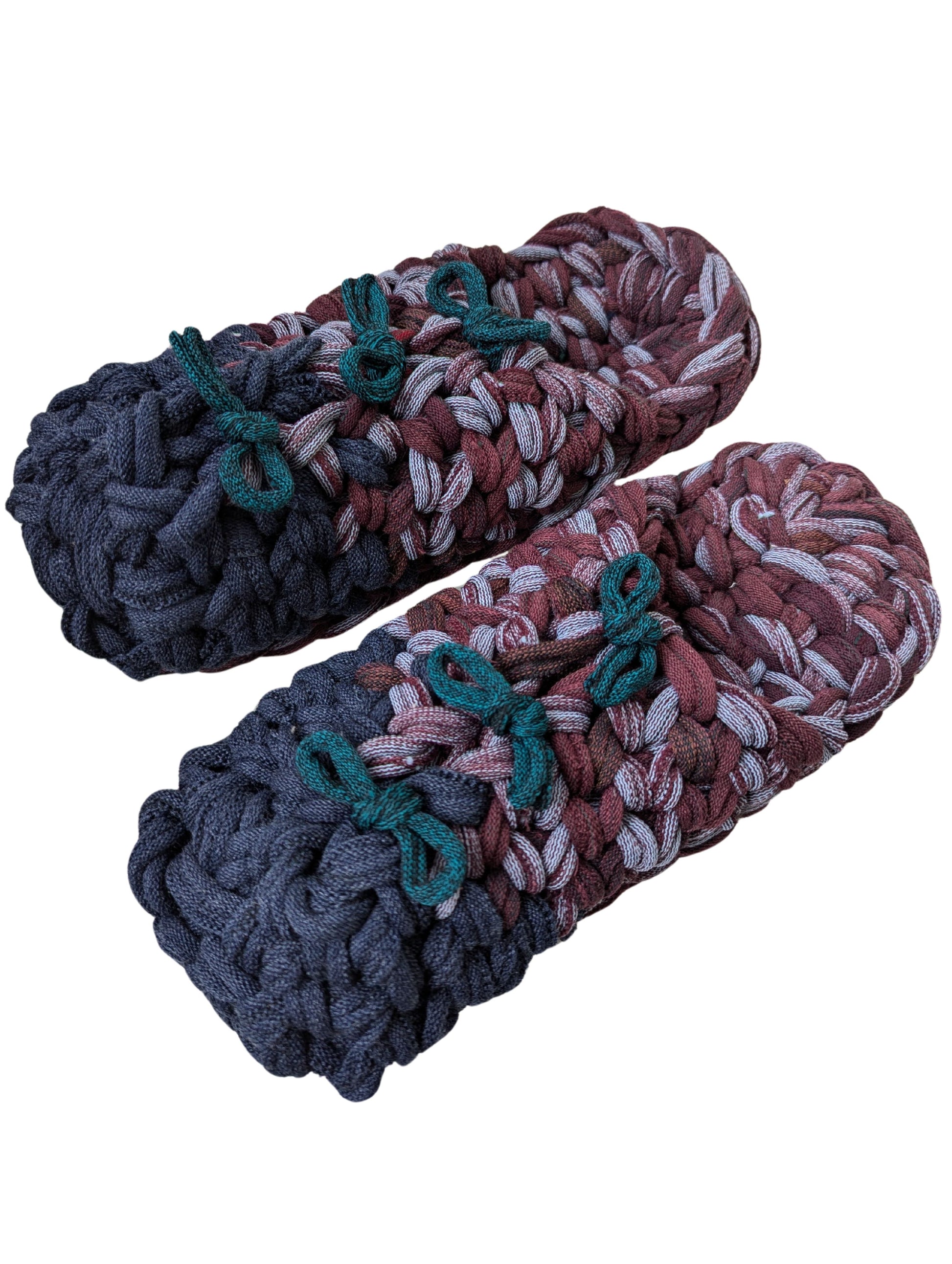 These slippers are made from recycled scraps of fabric discarded by a knitted items factory. As they are made from recycled materials, the size and colour of individual slippers in a pair may have some minute discrepancies. These slippers are elastic. We would recommend these slippers for when you want to relax, or make yourself comfortable.