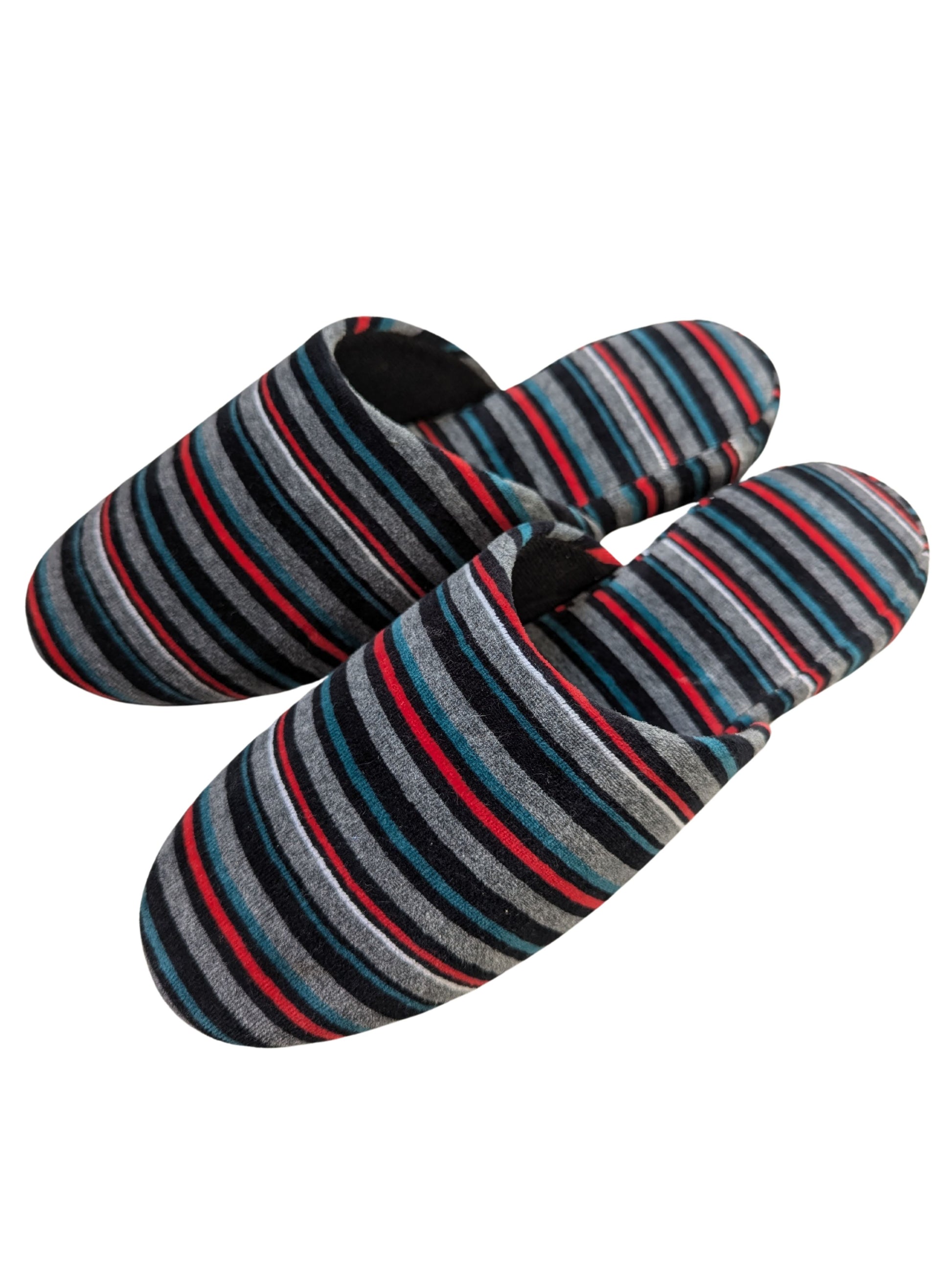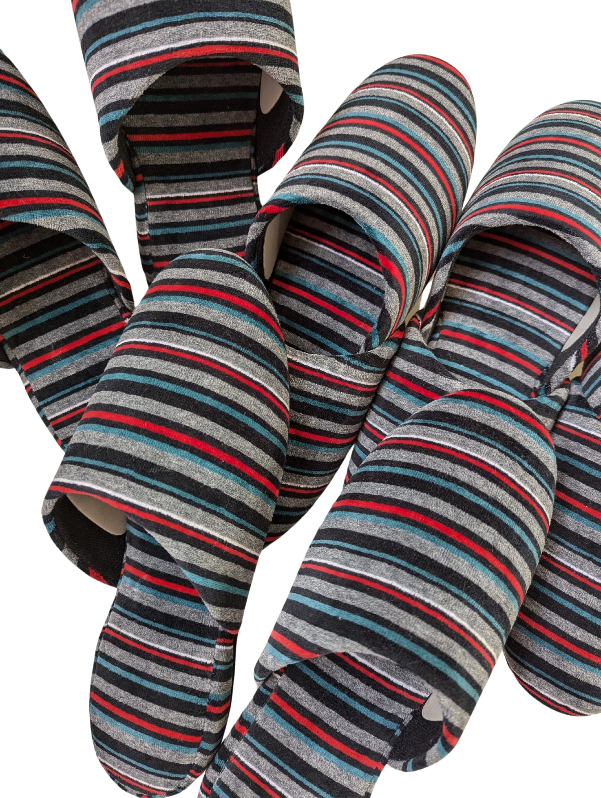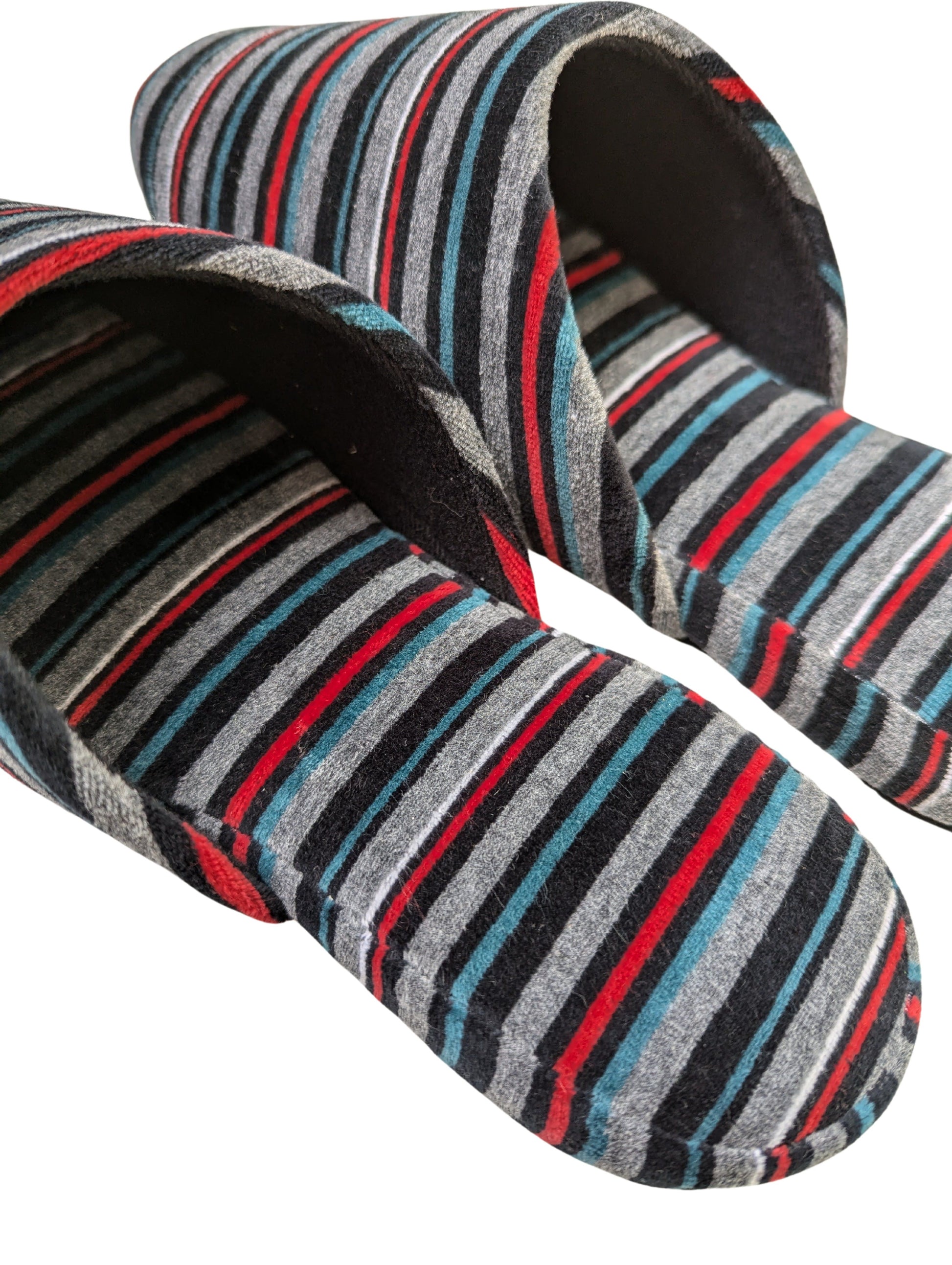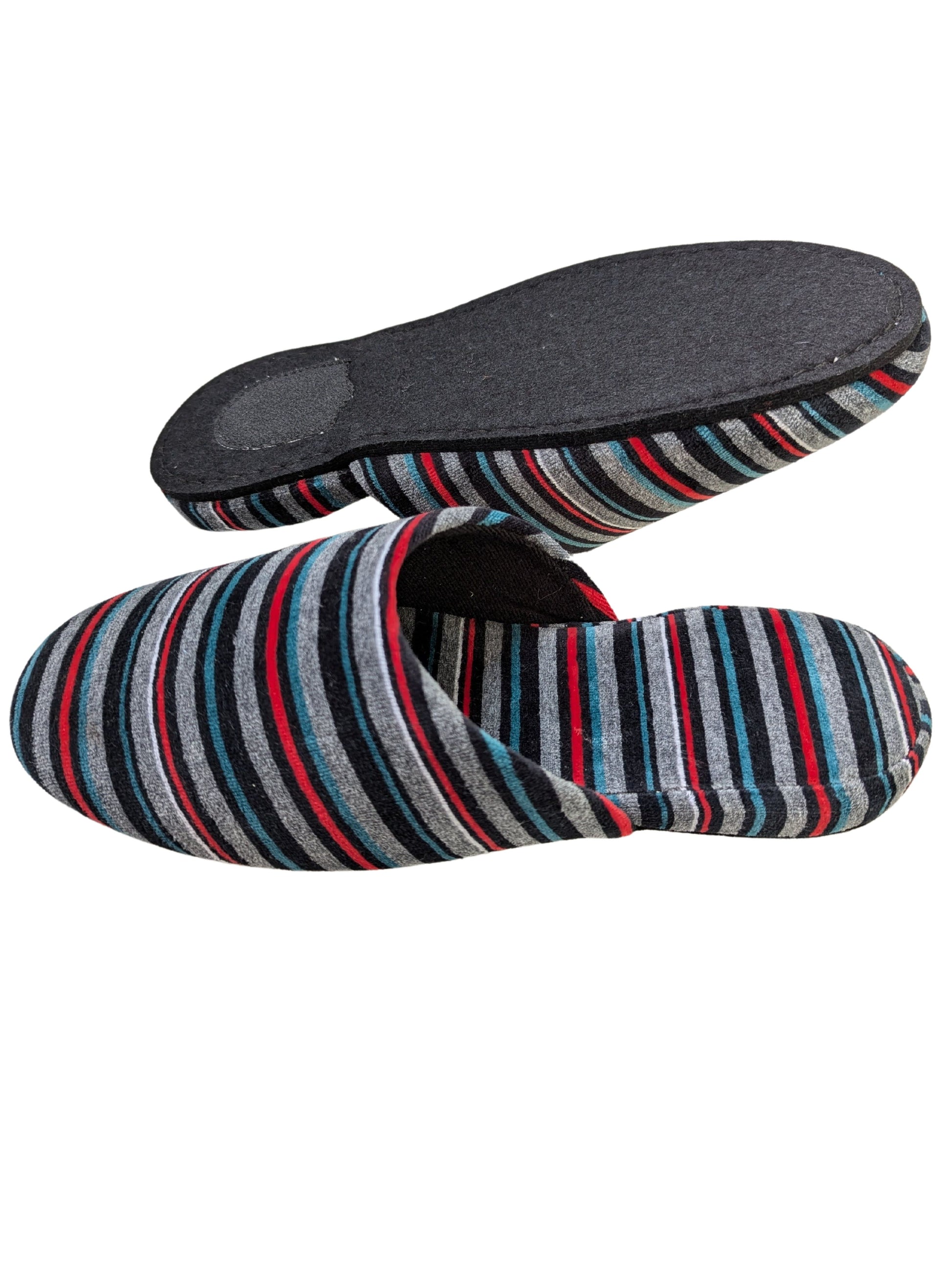 These limited edition striped slippers are handcrafted by skilled artisans using upcycled vintage fabric. Only a small number are available. This slipper is made from upcycled fabric. The fabric used for these slippers is made by deconstructing and cleaning old clothing, giving it a new life as slipper material. While they have a unique texture and vintage look, there may be slight color variations. Please understand the nature of upcycled and recycled products.
