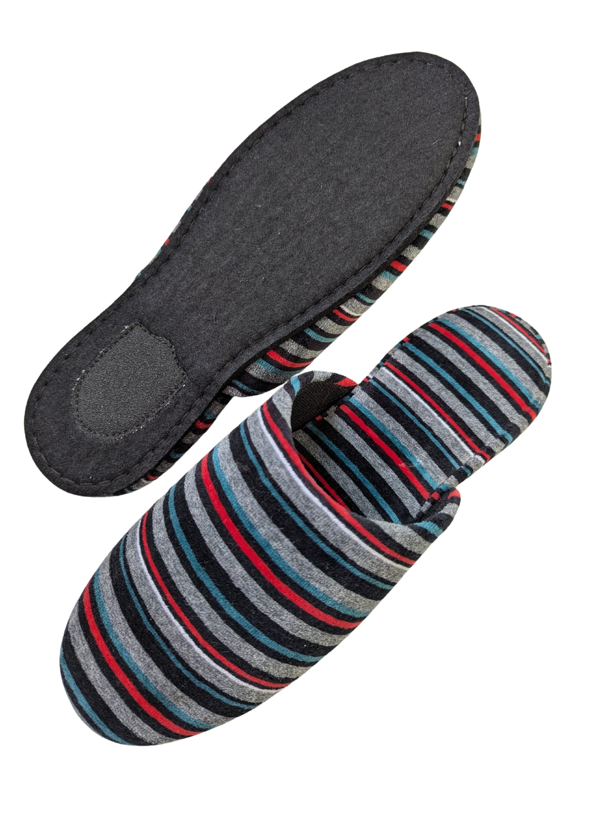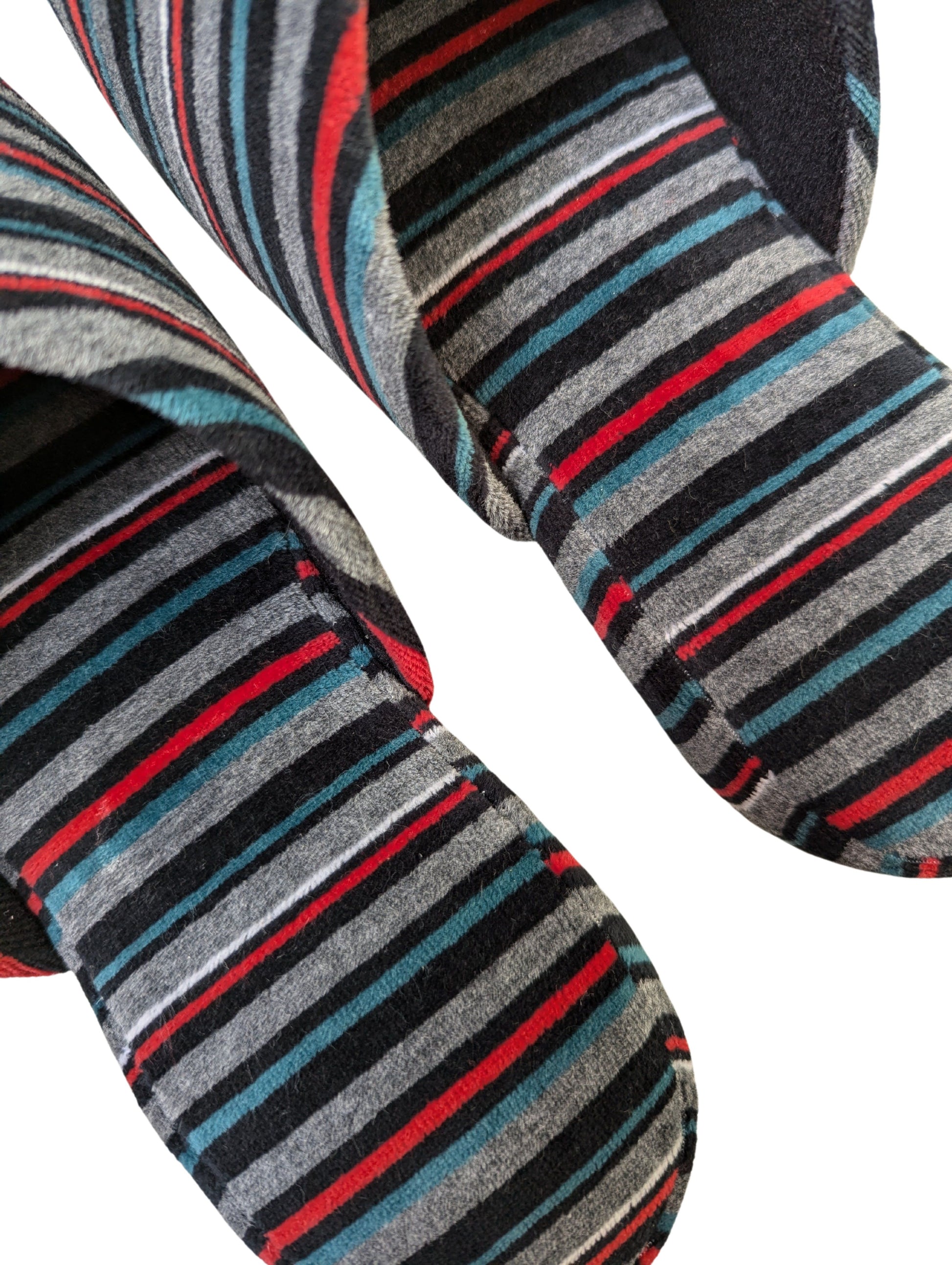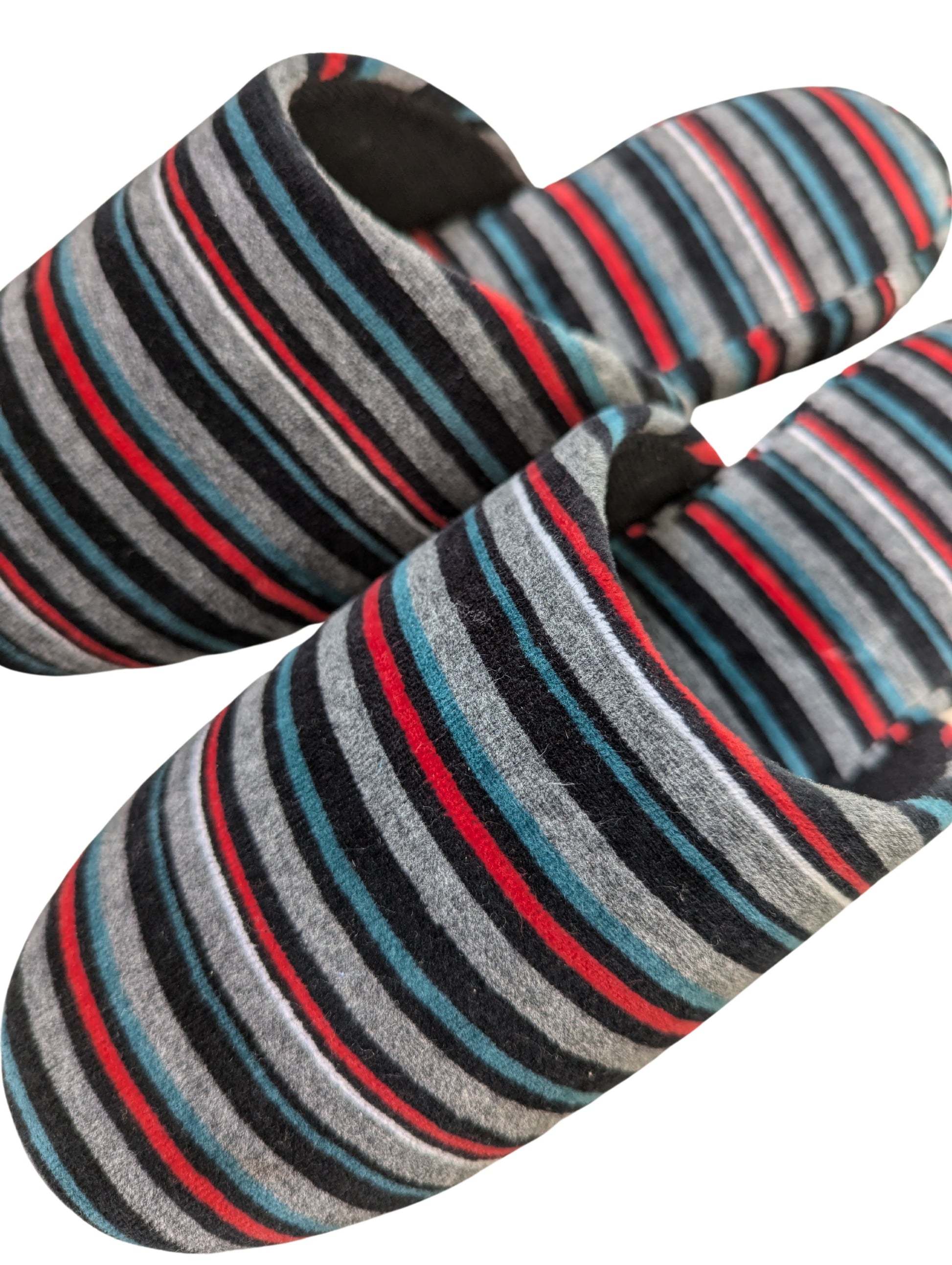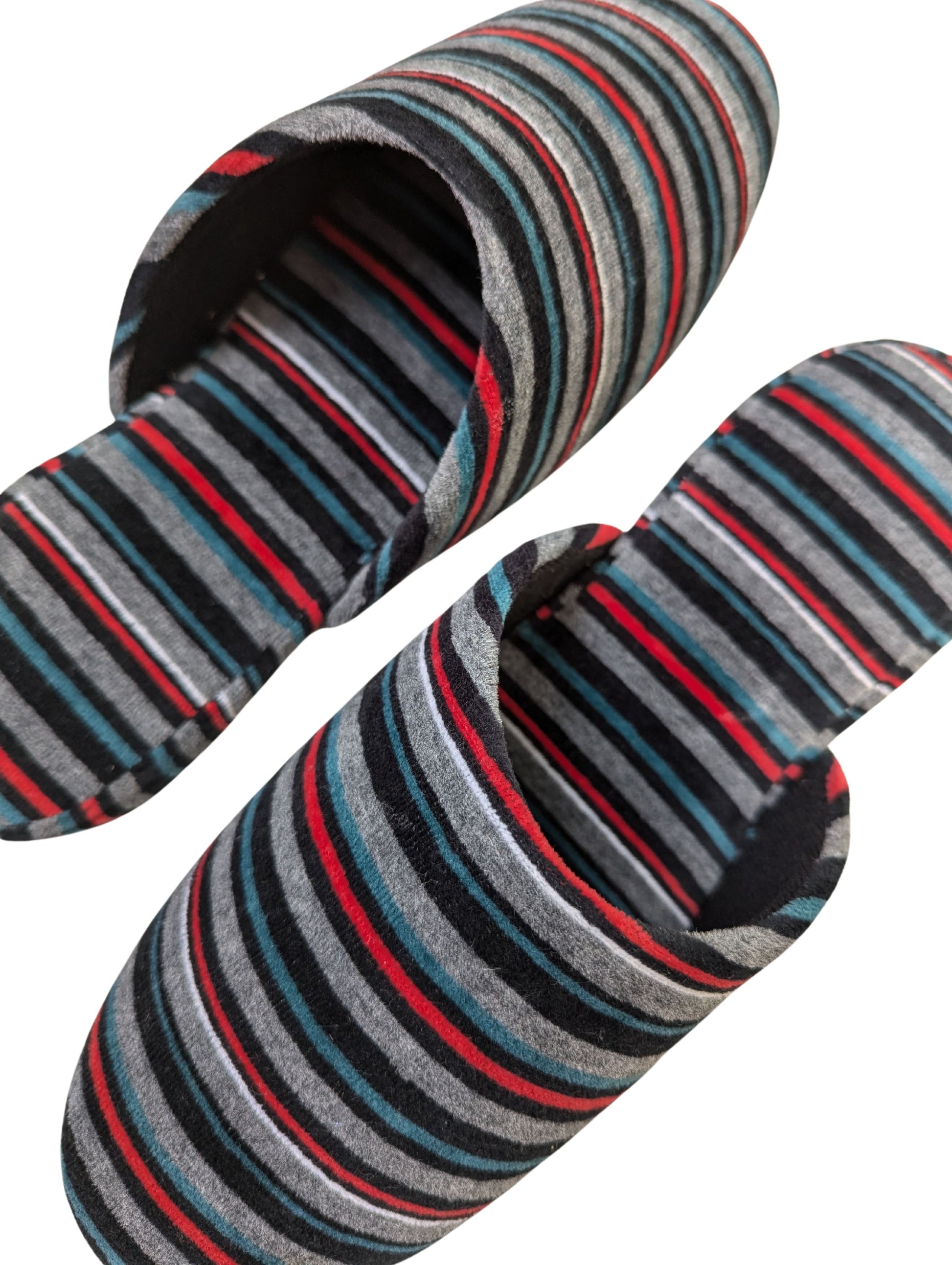 These limited edition striped slippers are handcrafted by skilled artisans using upcycled vintage fabric. Only a small number are available. This slipper is made from upcycled fabric. The fabric used for these slippers is made by deconstructing and cleaning old clothing, giving it a new life as slipper material. While they have a unique texture and vintage look, there may be slight color variations. Please understand the nature of upcycled and recycled products.