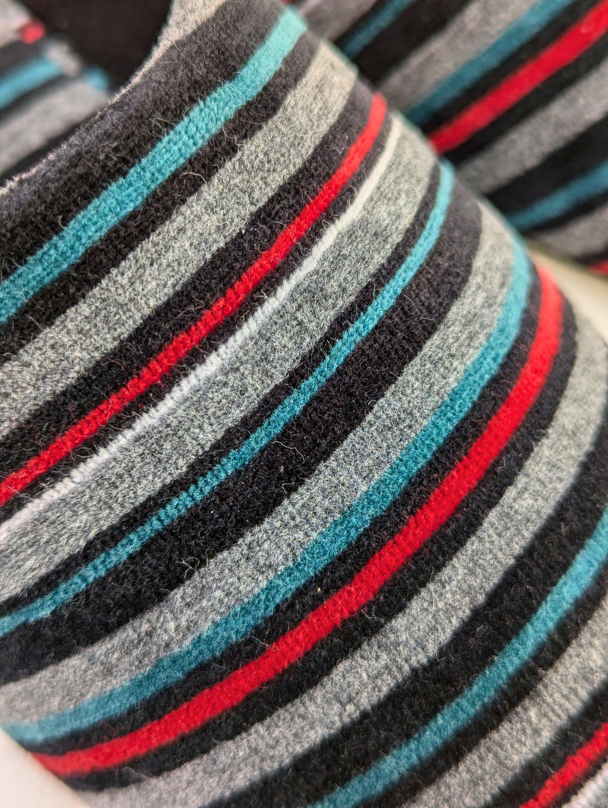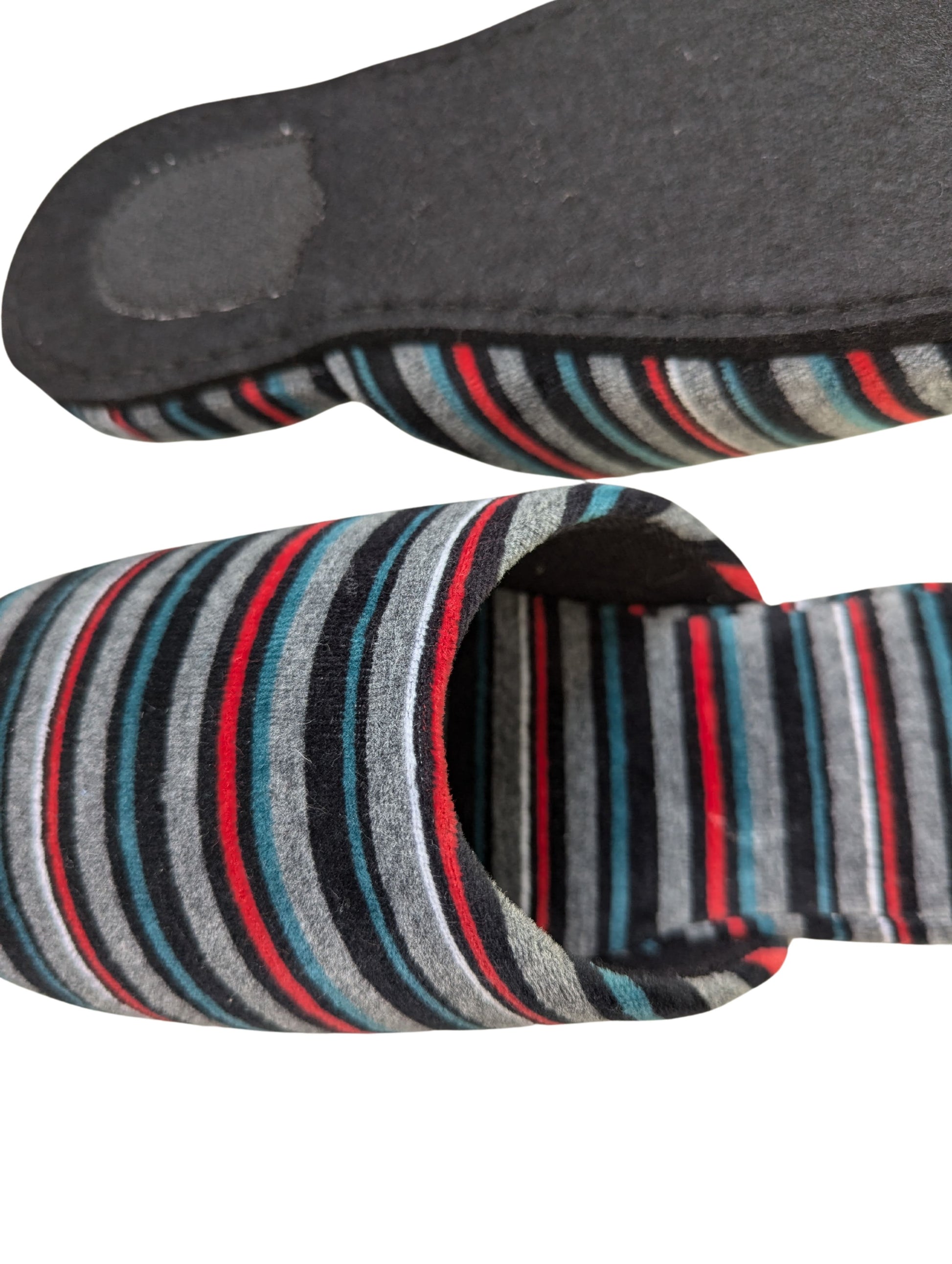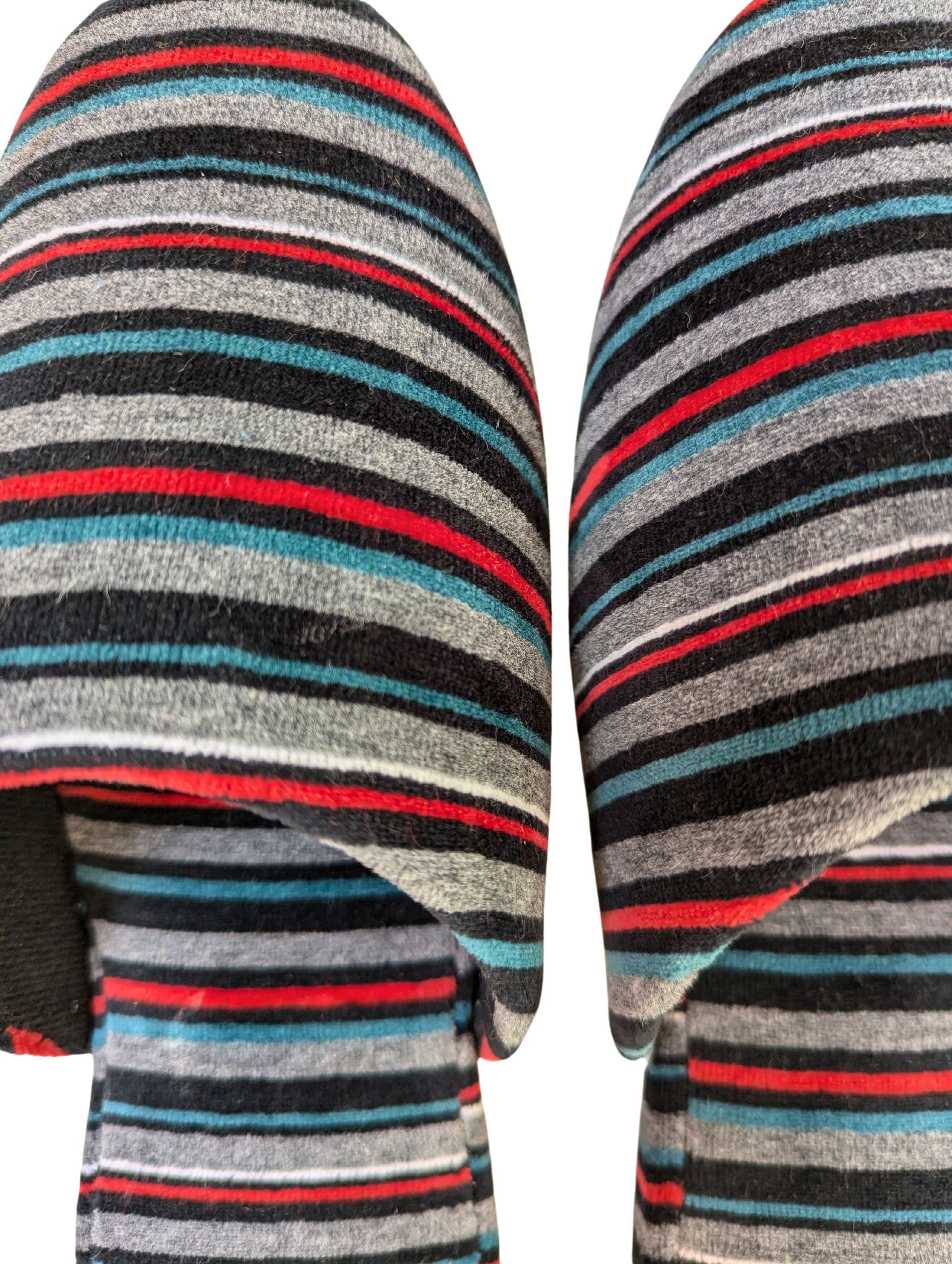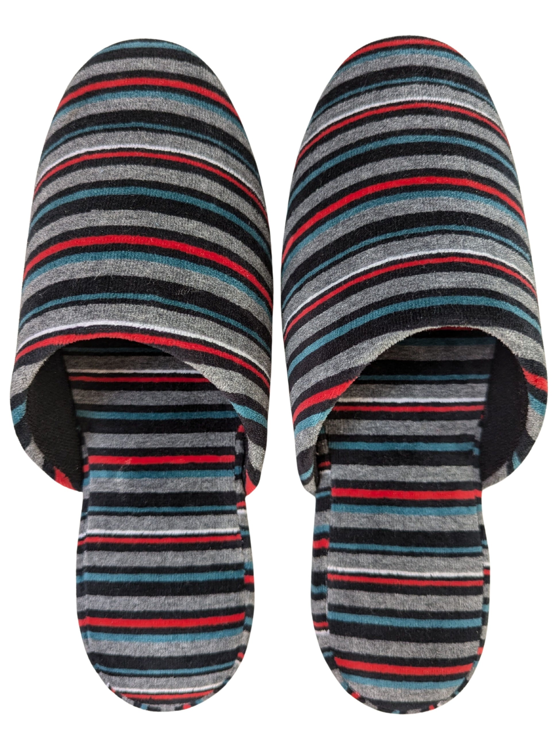 These limited edition striped slippers are handcrafted by skilled artisans using upcycled vintage fabric. Only a small number are available. This slipper is made from upcycled fabric. The fabric used for these slippers is made by deconstructing and cleaning old clothing, giving it a new life as slipper material. While they have a unique texture and vintage look, there may be slight color variations. Please understand the nature of upcycled and recycled products.