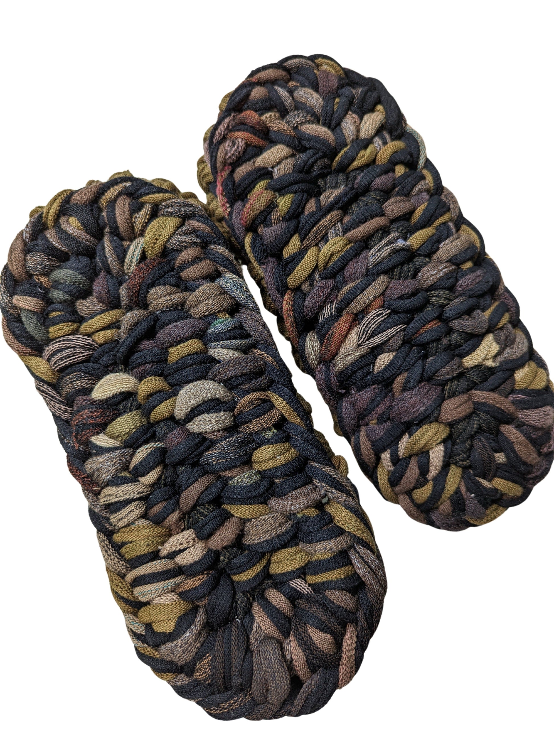 These slippers are made from recycled scraps of fabric discarded by a knitted items factory. As they are made from recycled materials, the size and colour of individual slippers in a pair may have some minute discrepancies. These slippers are elastic. We would recommend these slippers for when you want to relax, or make yourself comfortable.