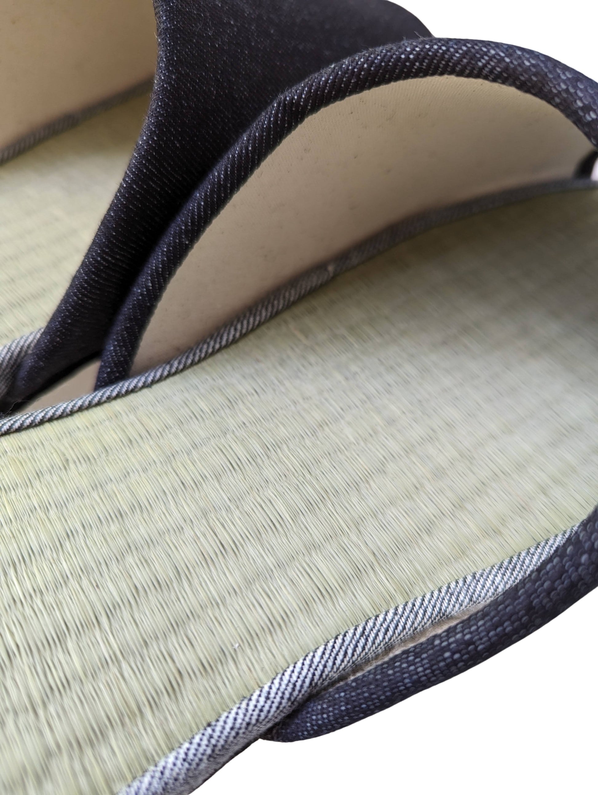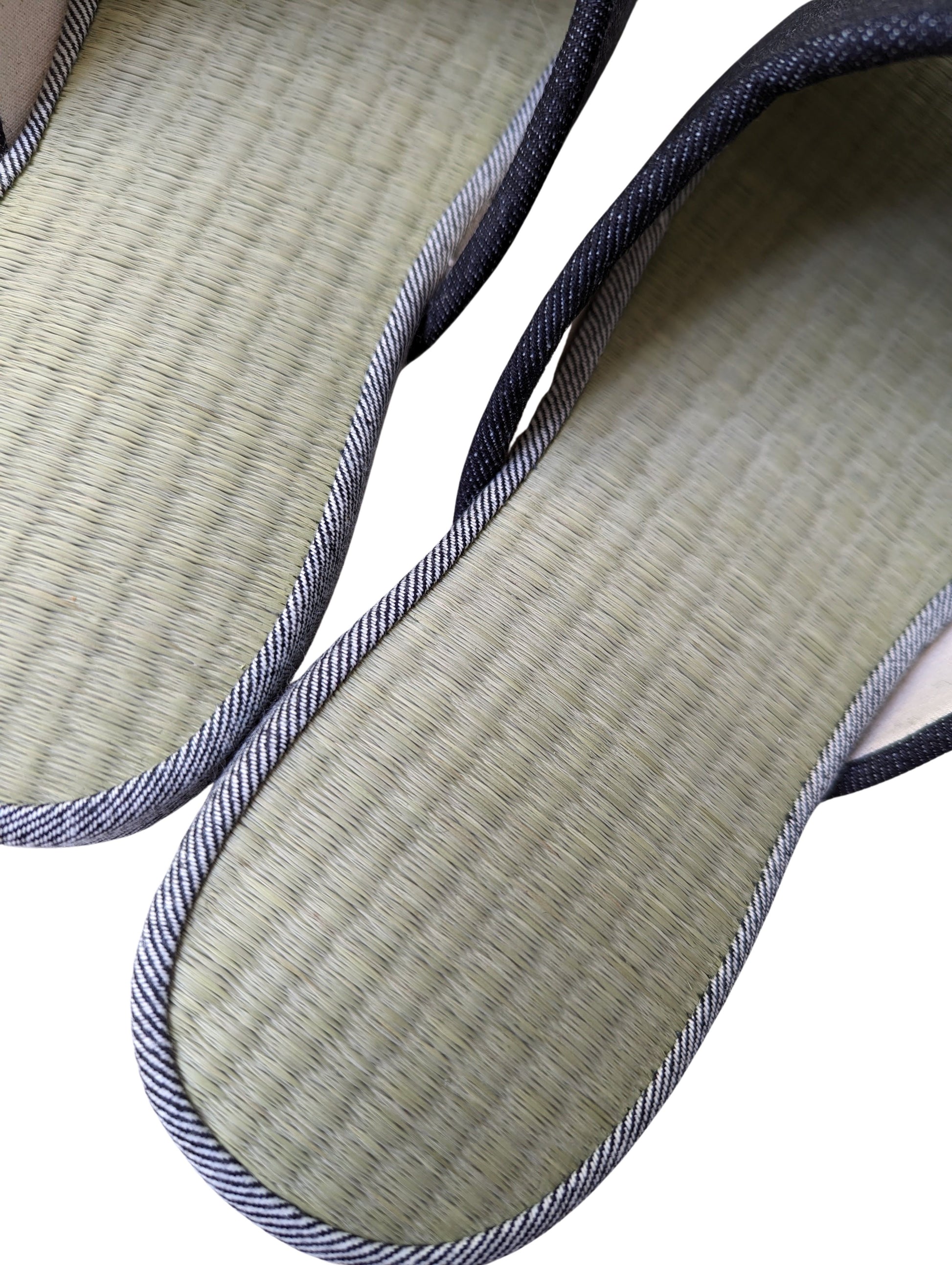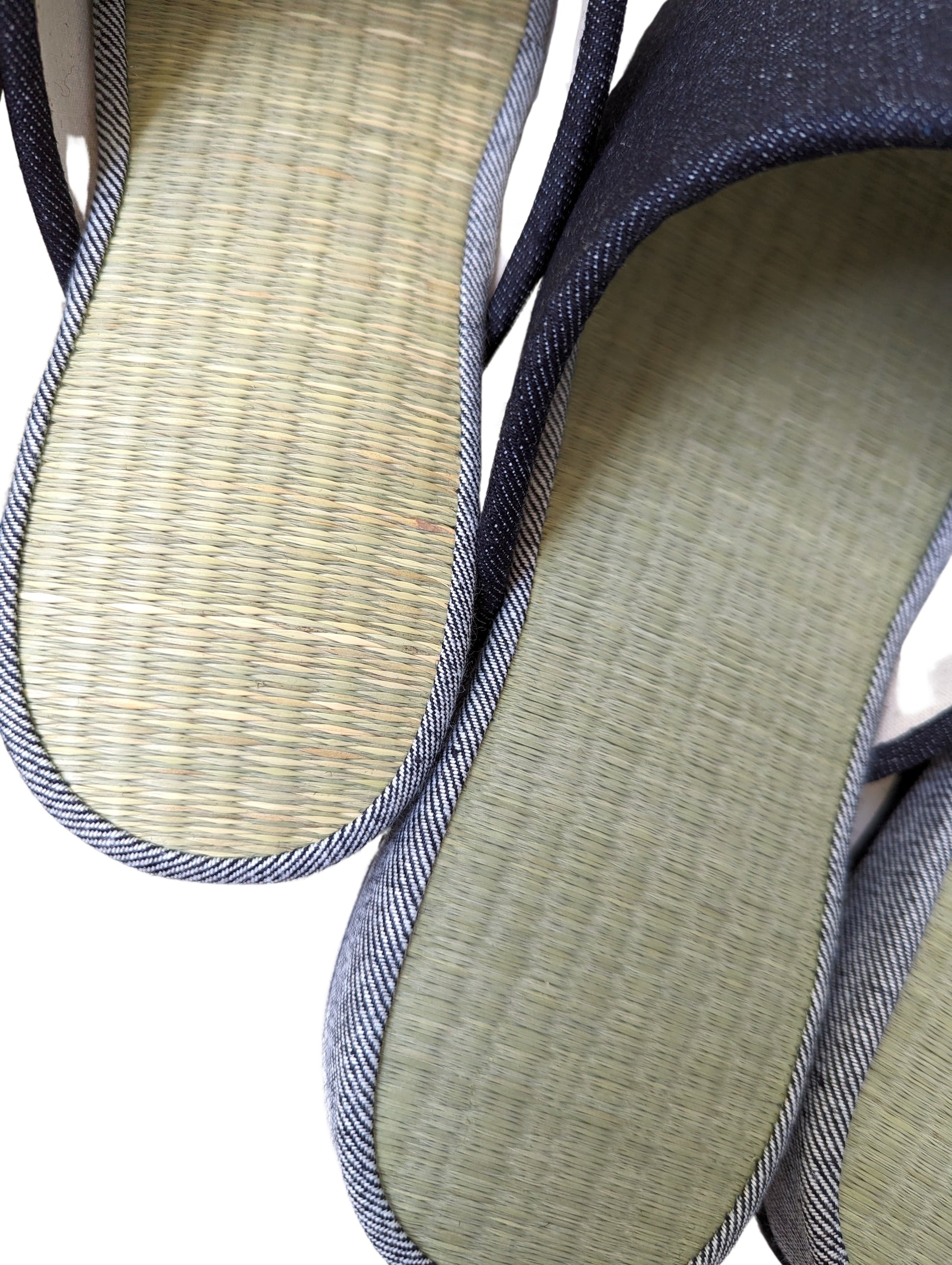 These slippers are crafted using premium Japanese Hiroshima denim, imbuing them with a simple yet elegant quality. The tatami portion is also authentically Japanese, made using genuine Igusa, a plant cultivated in Japan. Furthermore, we meticulously select the finest portion of the Igusa plant—the tip of the ear—known for its exceptional quality.
