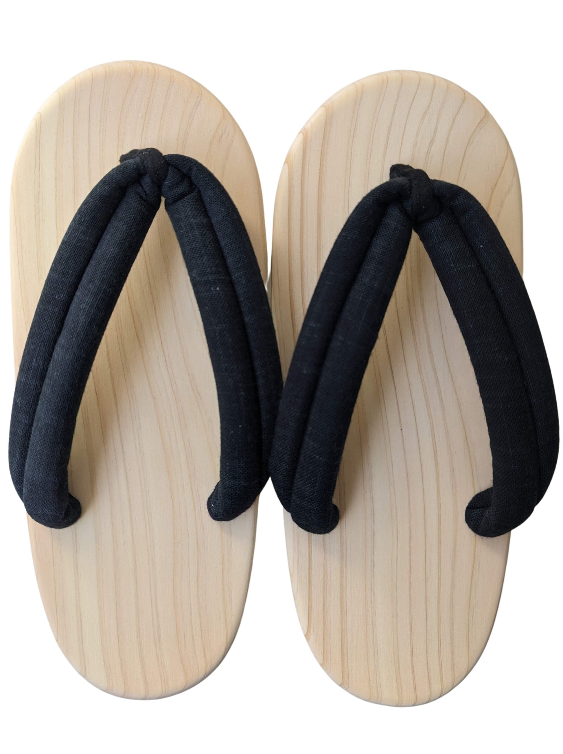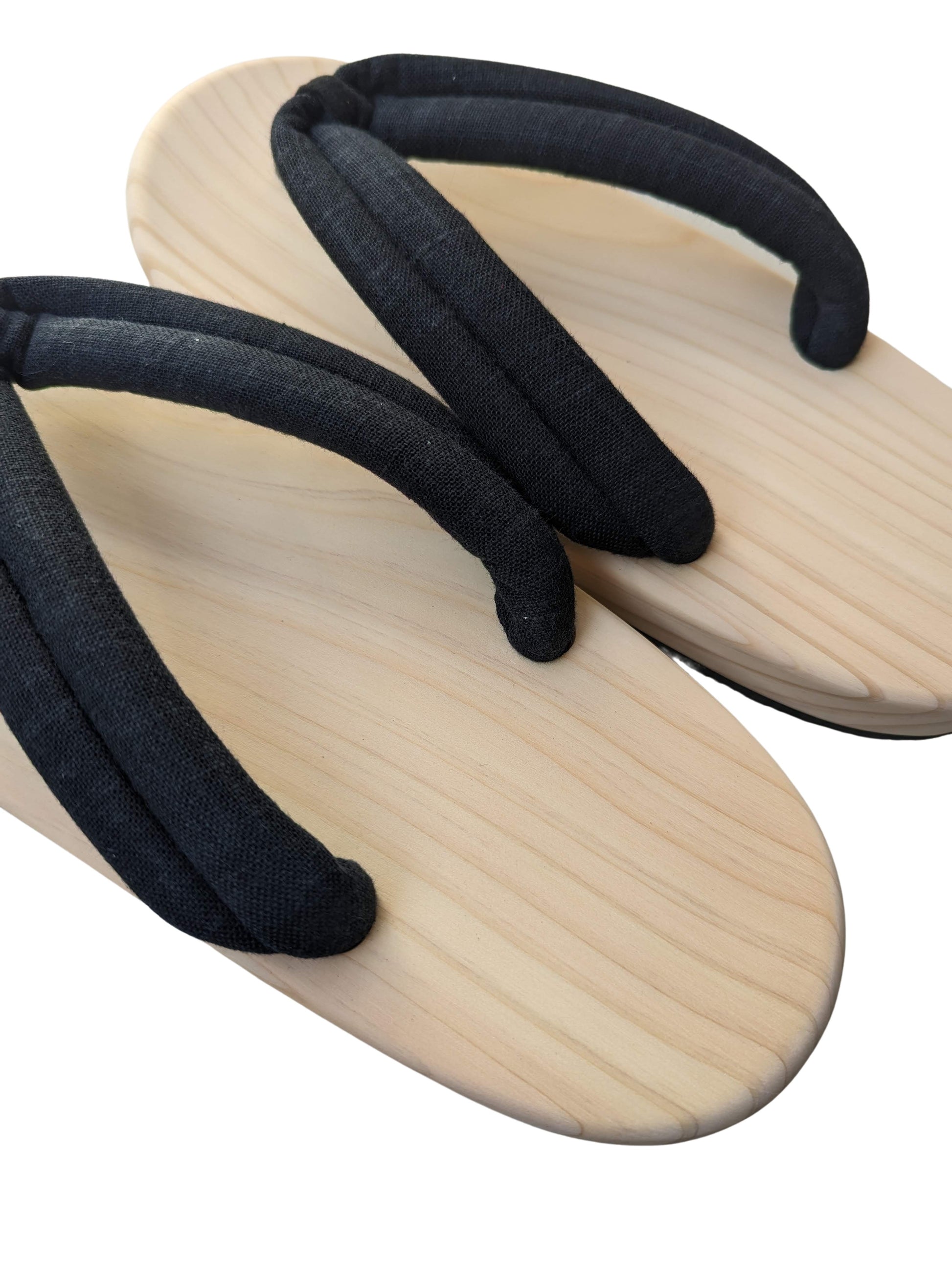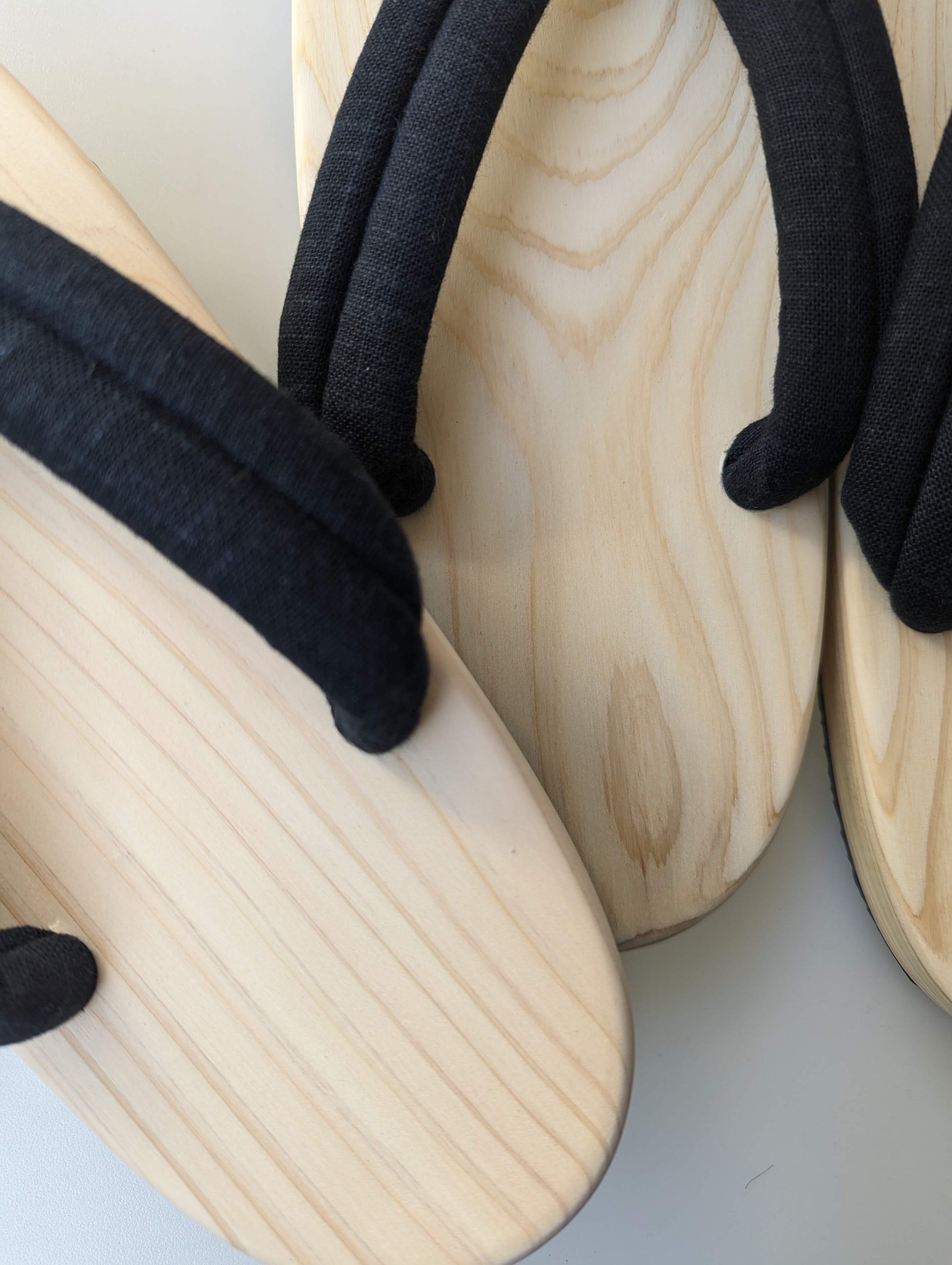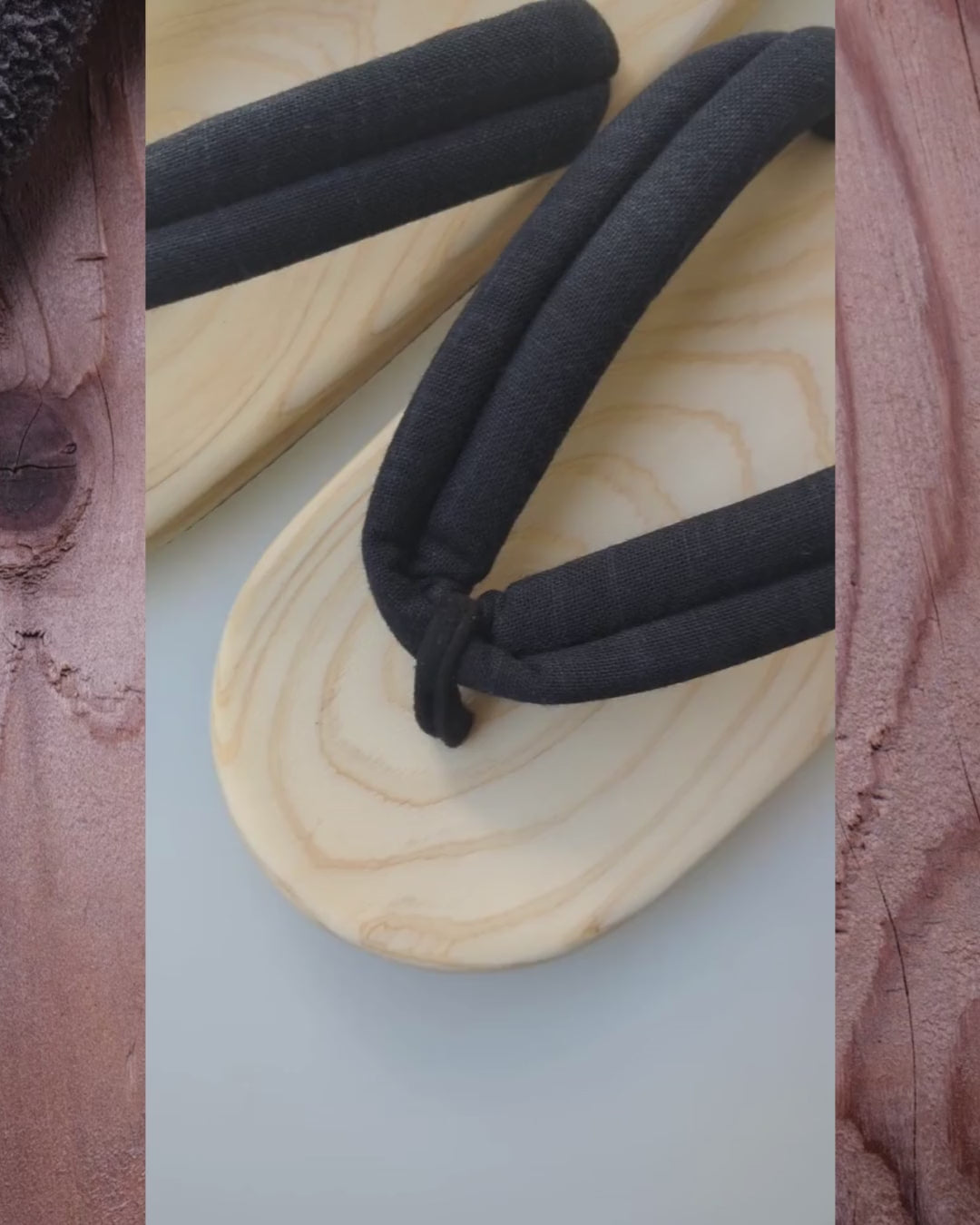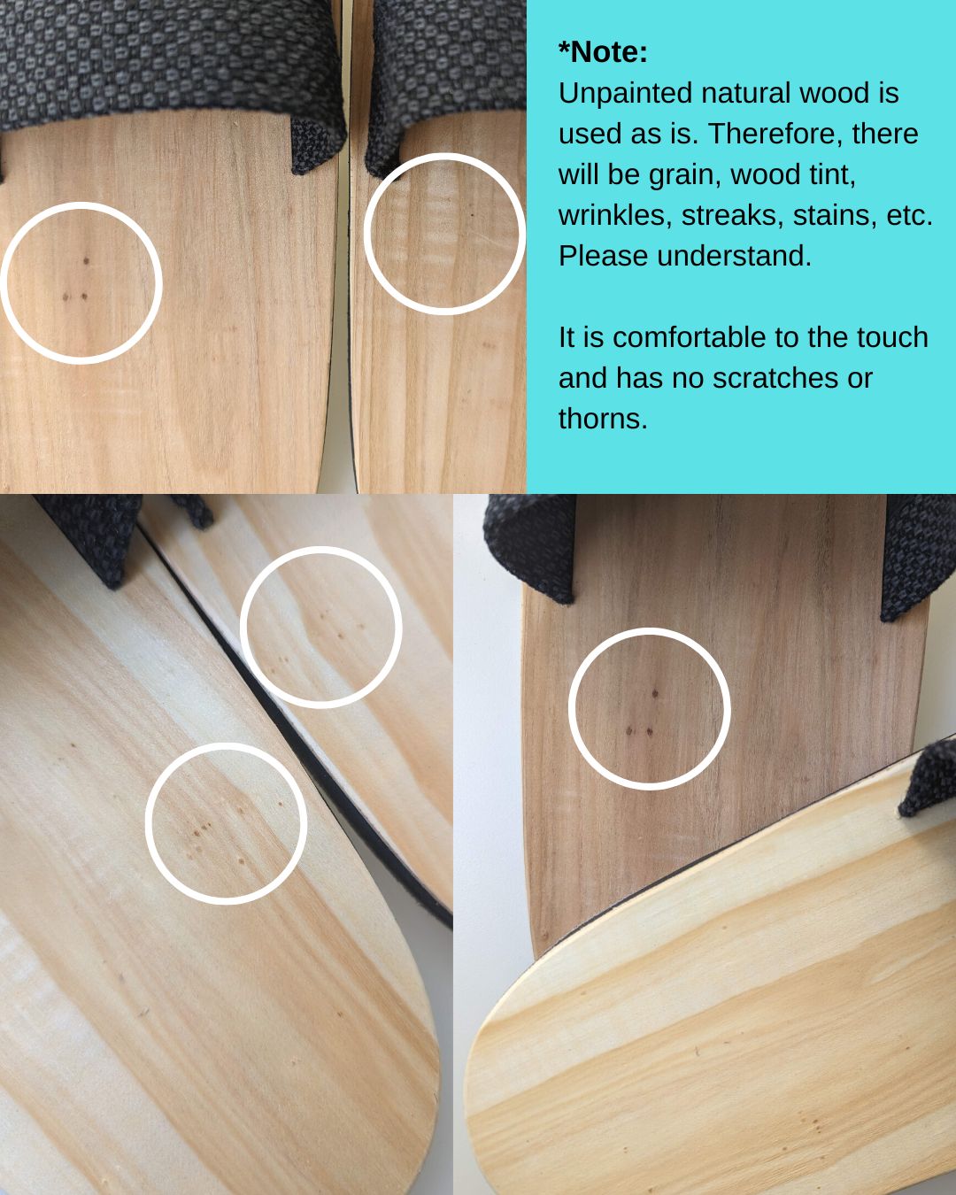 Uncoated Japanese natural cypress wood is used. The natural, uncoated finish makes them comfortable to wear barefoot, as they easily absorb sweat. Can be worn outside. Do not get them wet as they are sensitive to water.