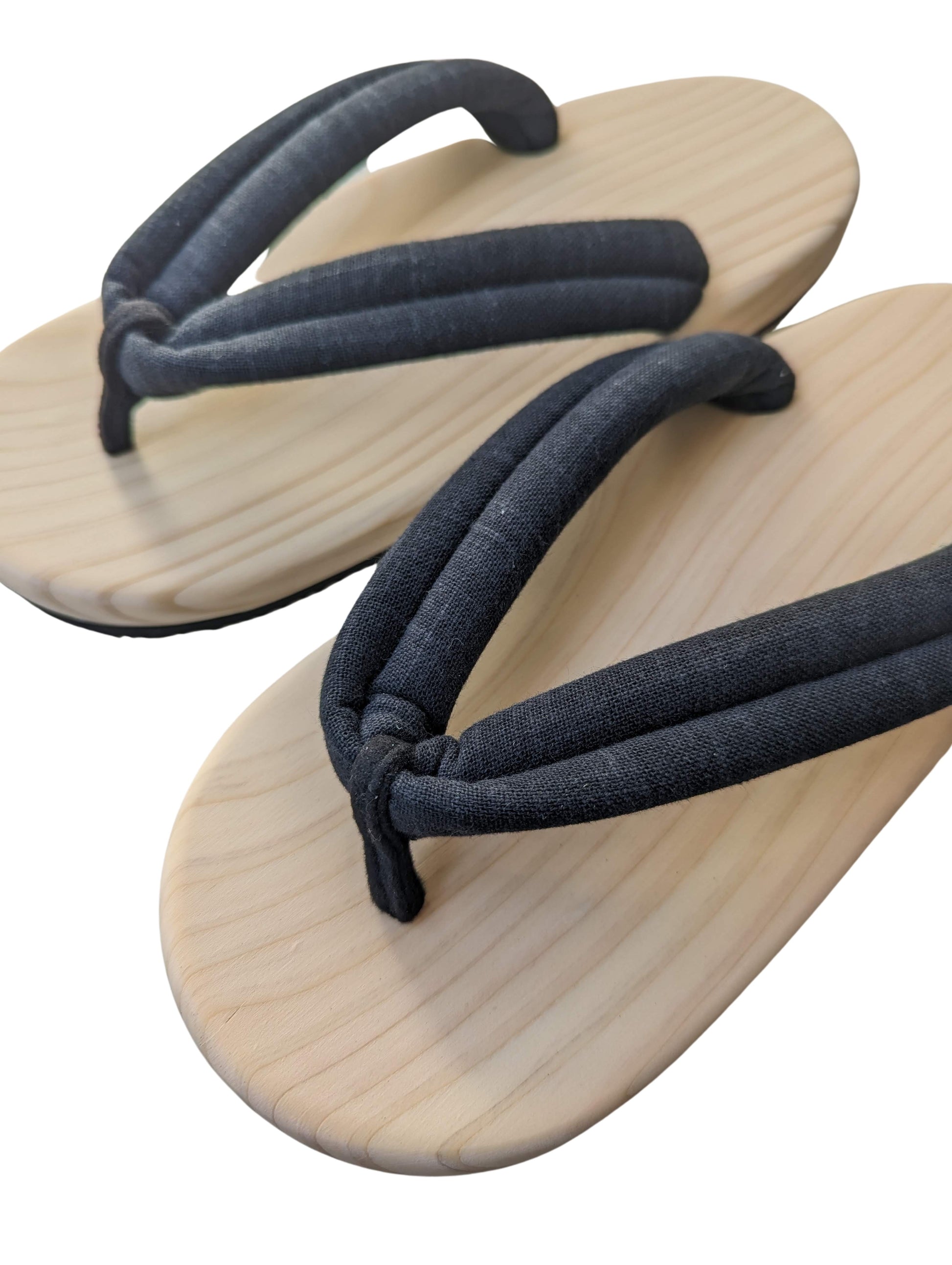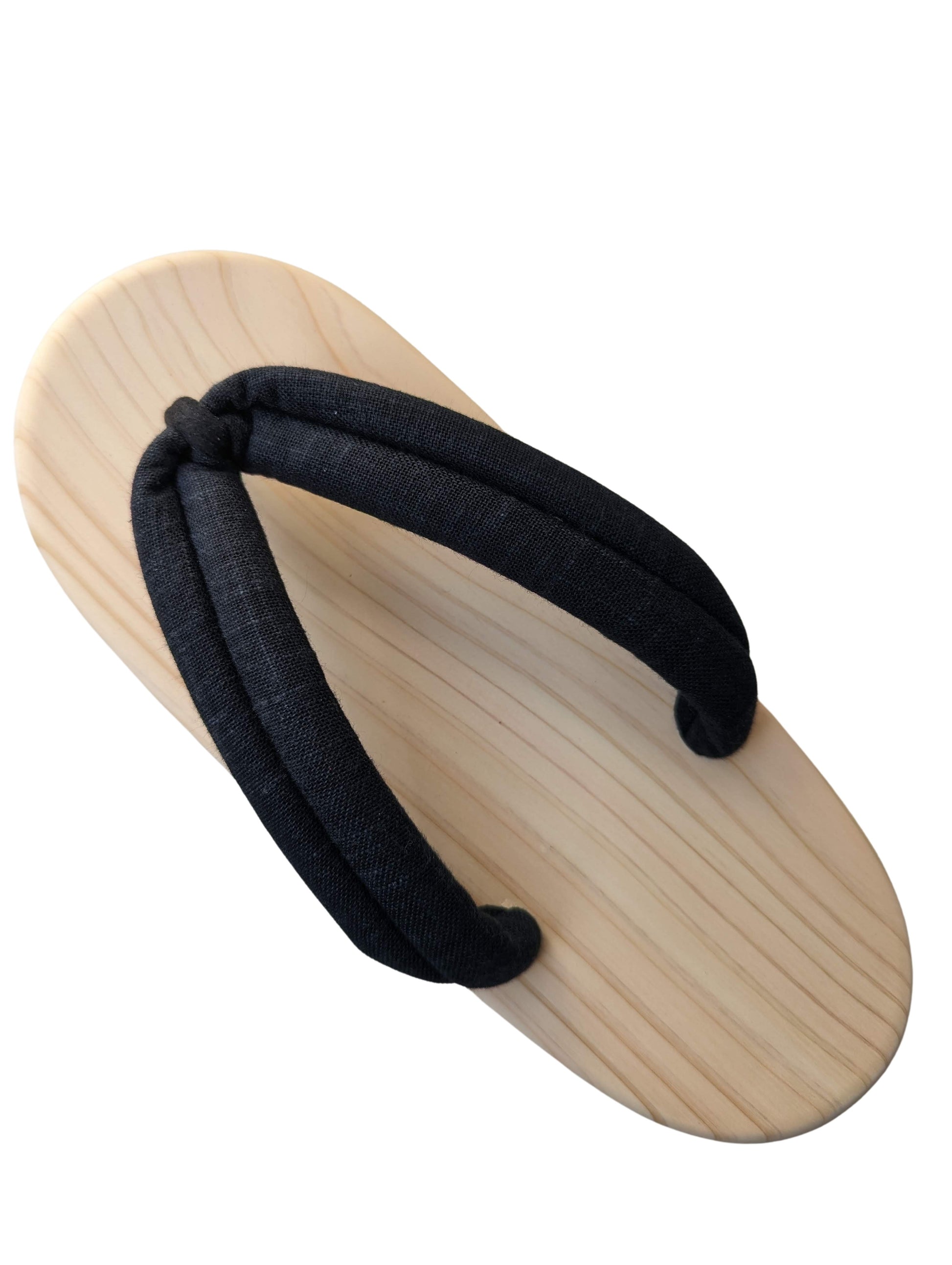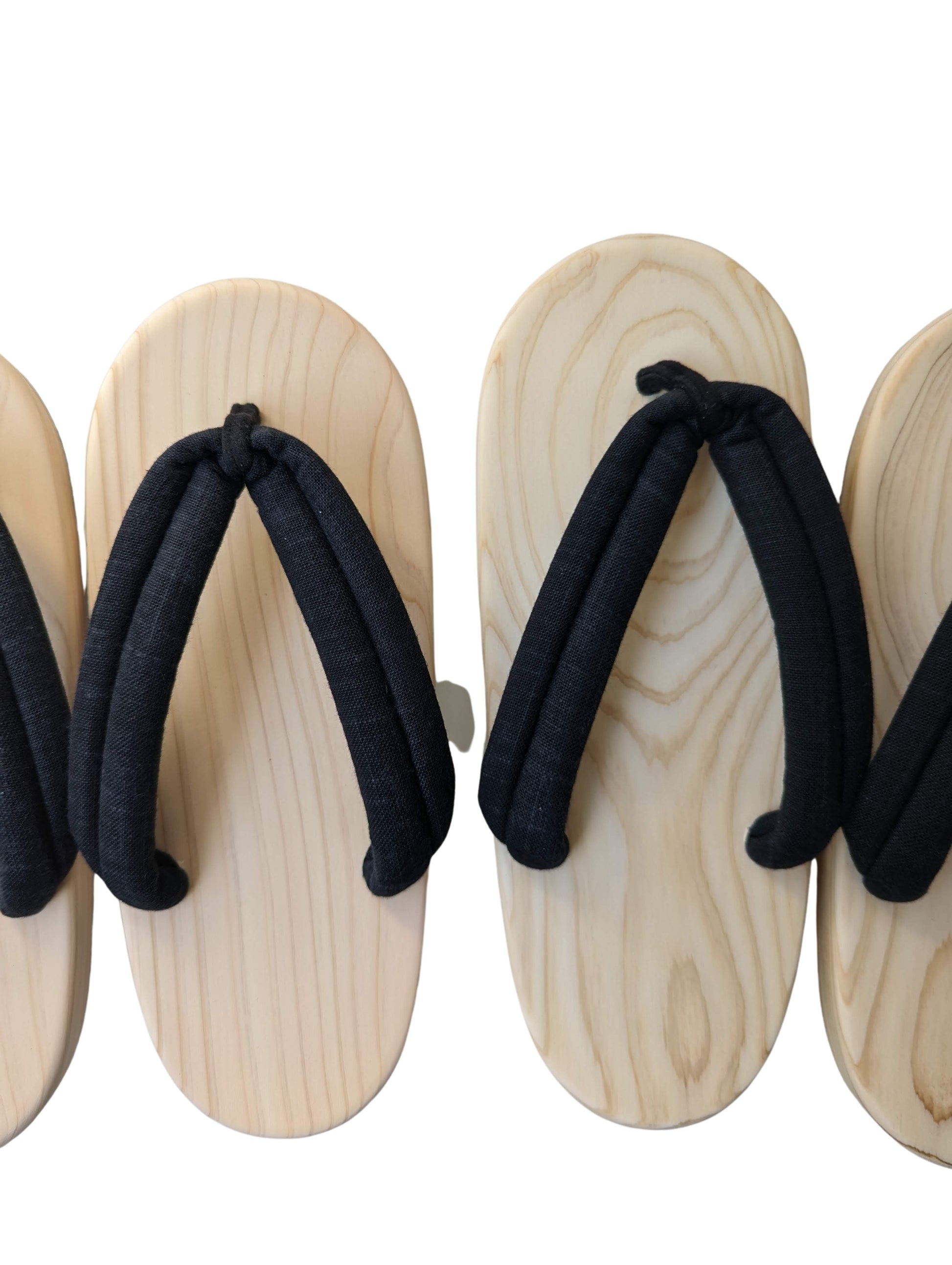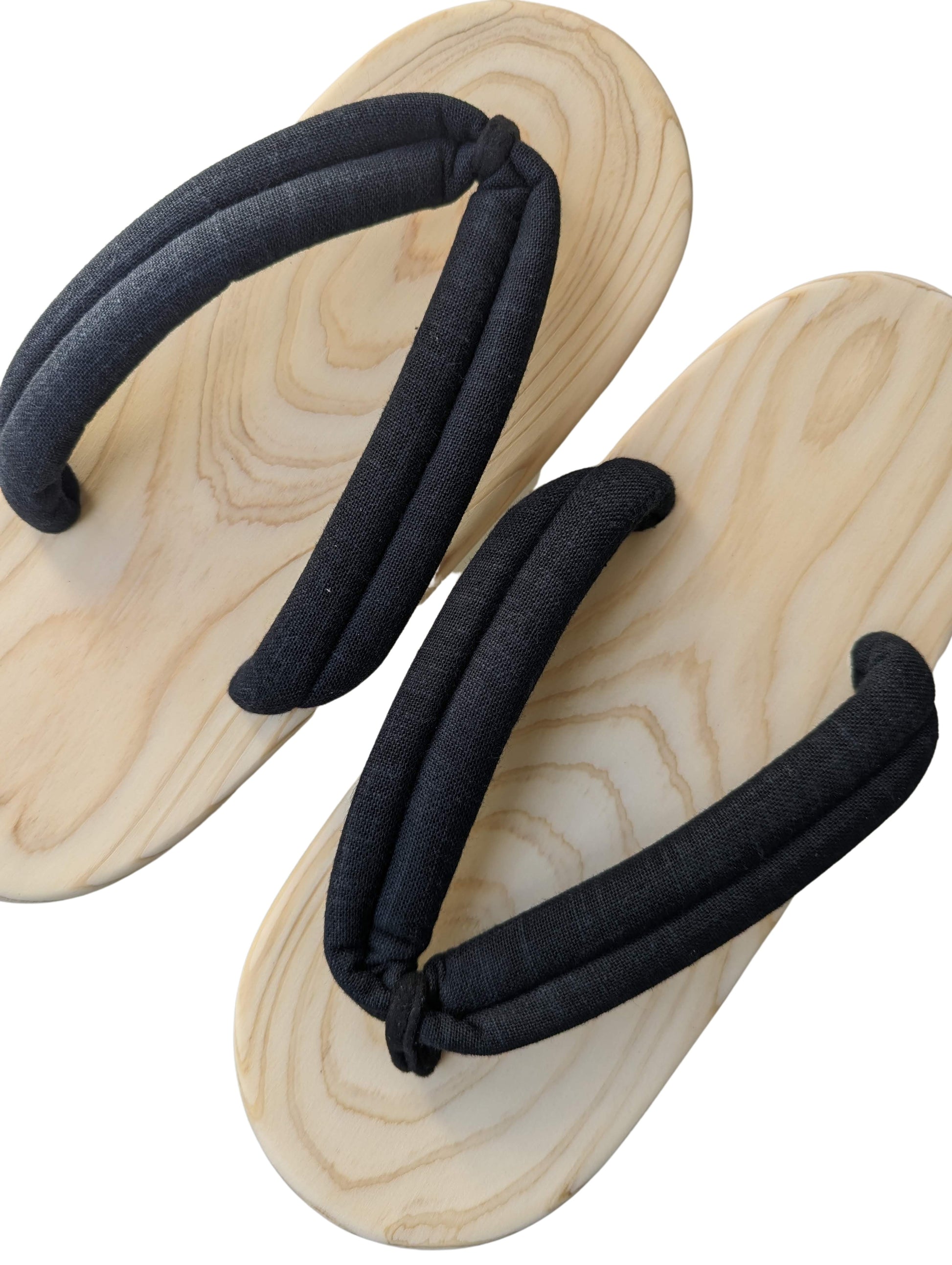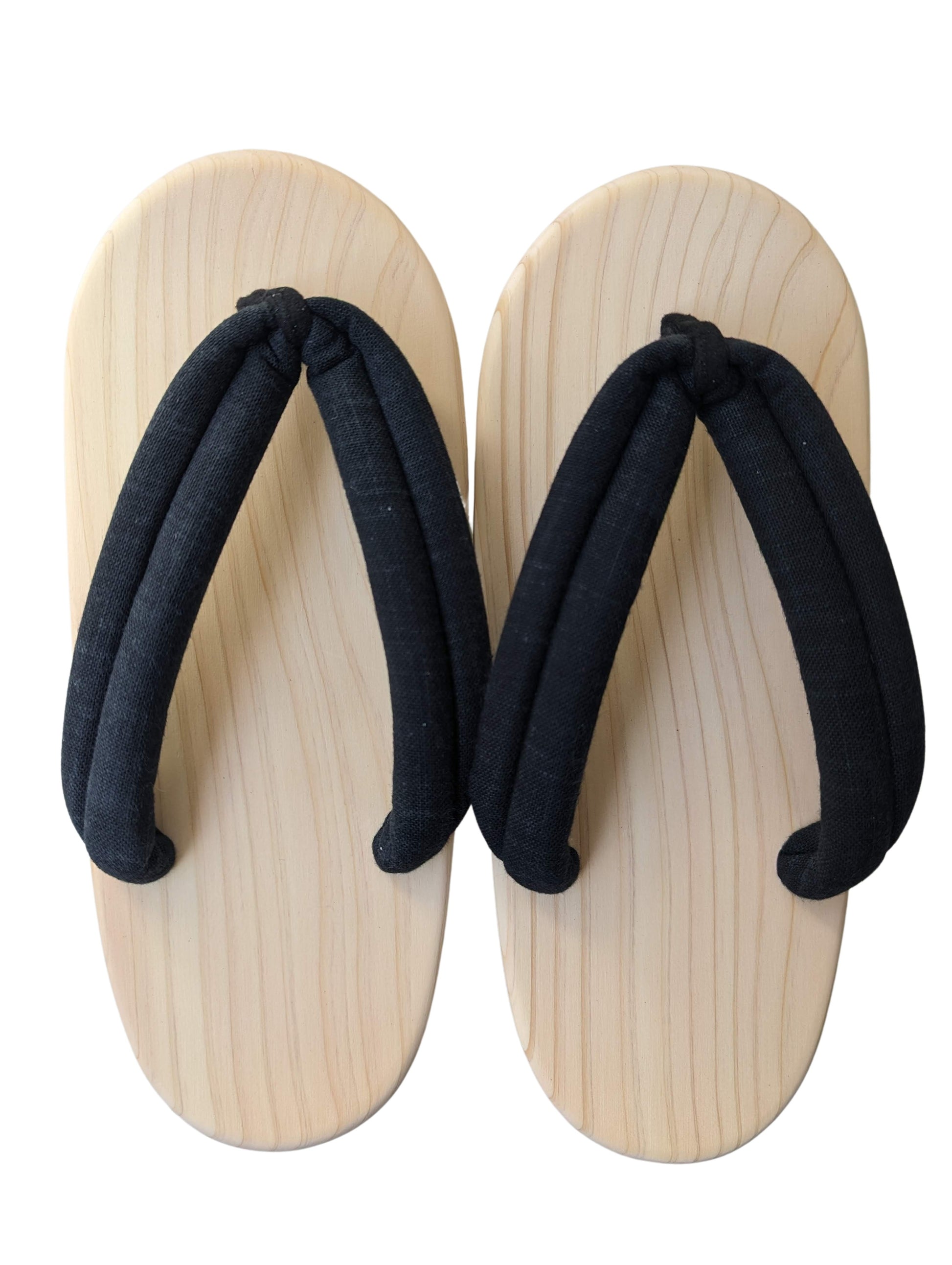 Uncoated Japanese natural cypress wood is used. The natural, uncoated finish makes them comfortable to wear barefoot, as they easily absorb sweat. Can be worn outside. Do not get them wet as they are sensitive to water.